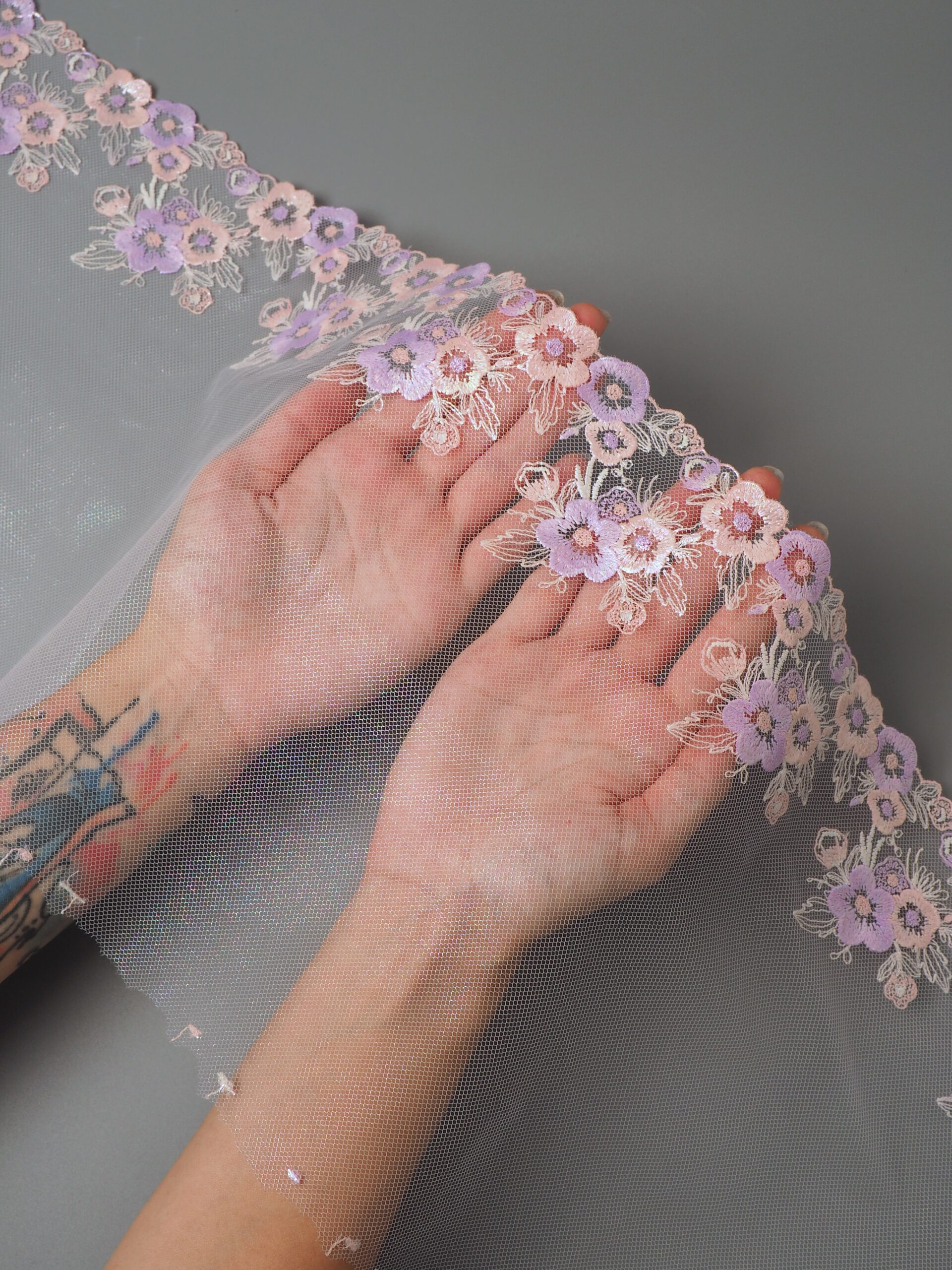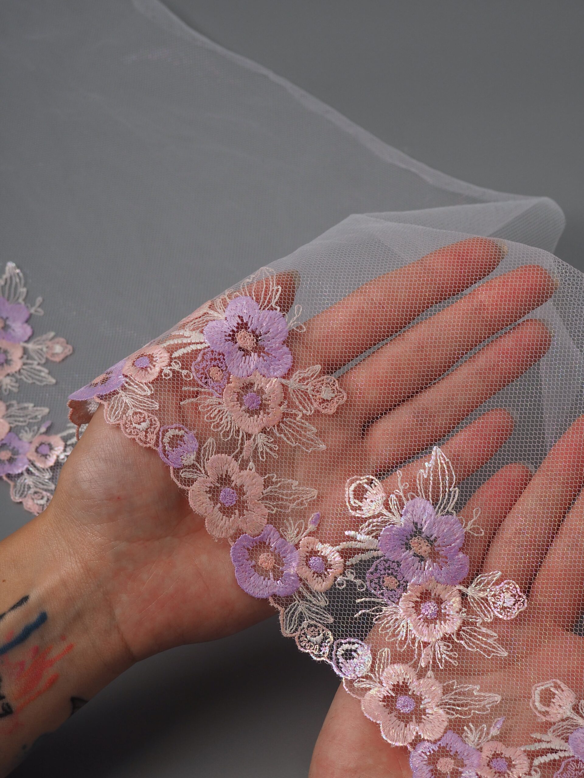 Кружево на сетке неэластичное лавандовое с глиттером с цветочным рисунком в правую и левую сторону. Вышивка двусторонняя персикового и лавандового цвета на лавандовой сетке с глиттером. Внутренняя сторона (к телу) гладкая, внешняя - шероховатая.