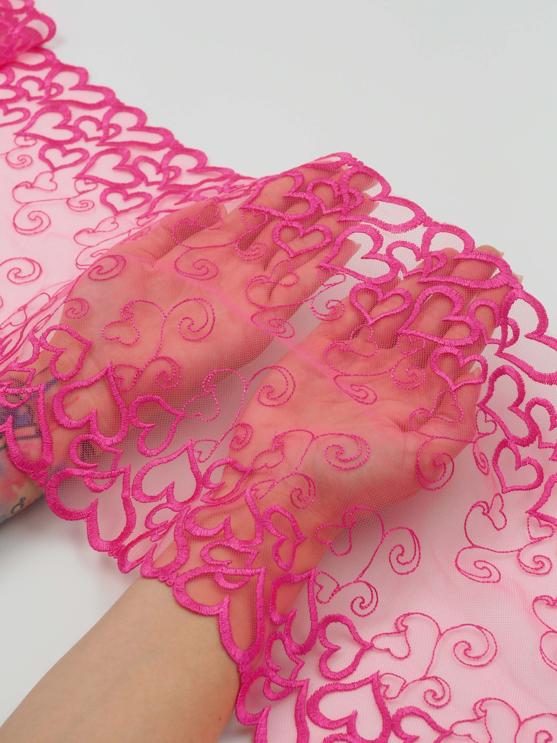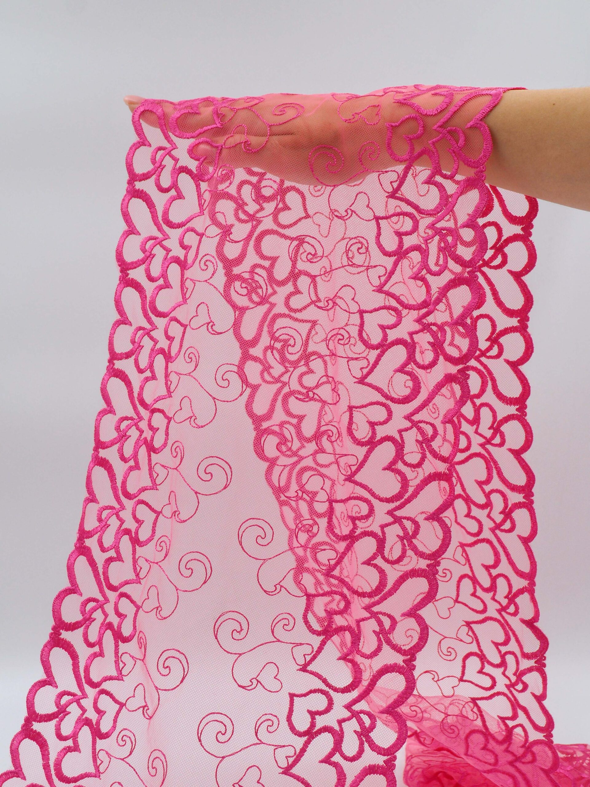 Кружево на сетке неэластичное розового оттенка с рисунком с сердечками. Вышивка на сетке малиновая фуксия с сердечками.