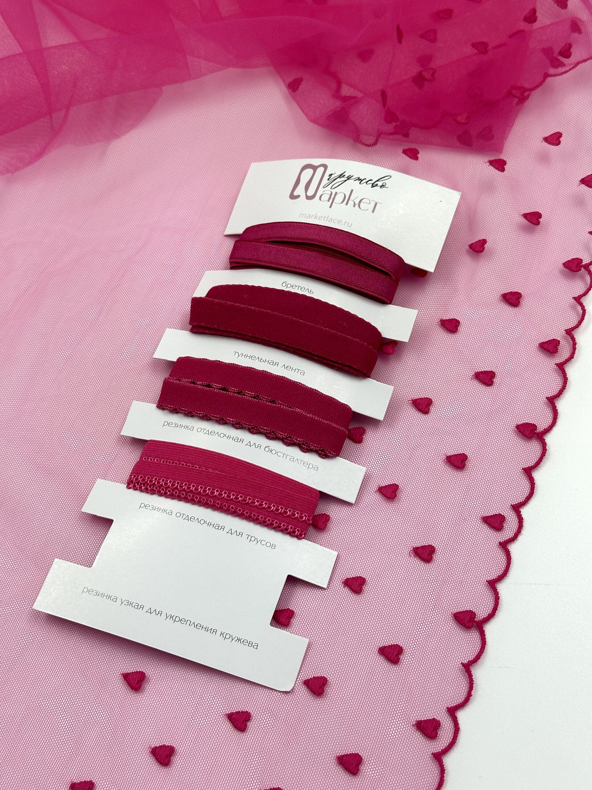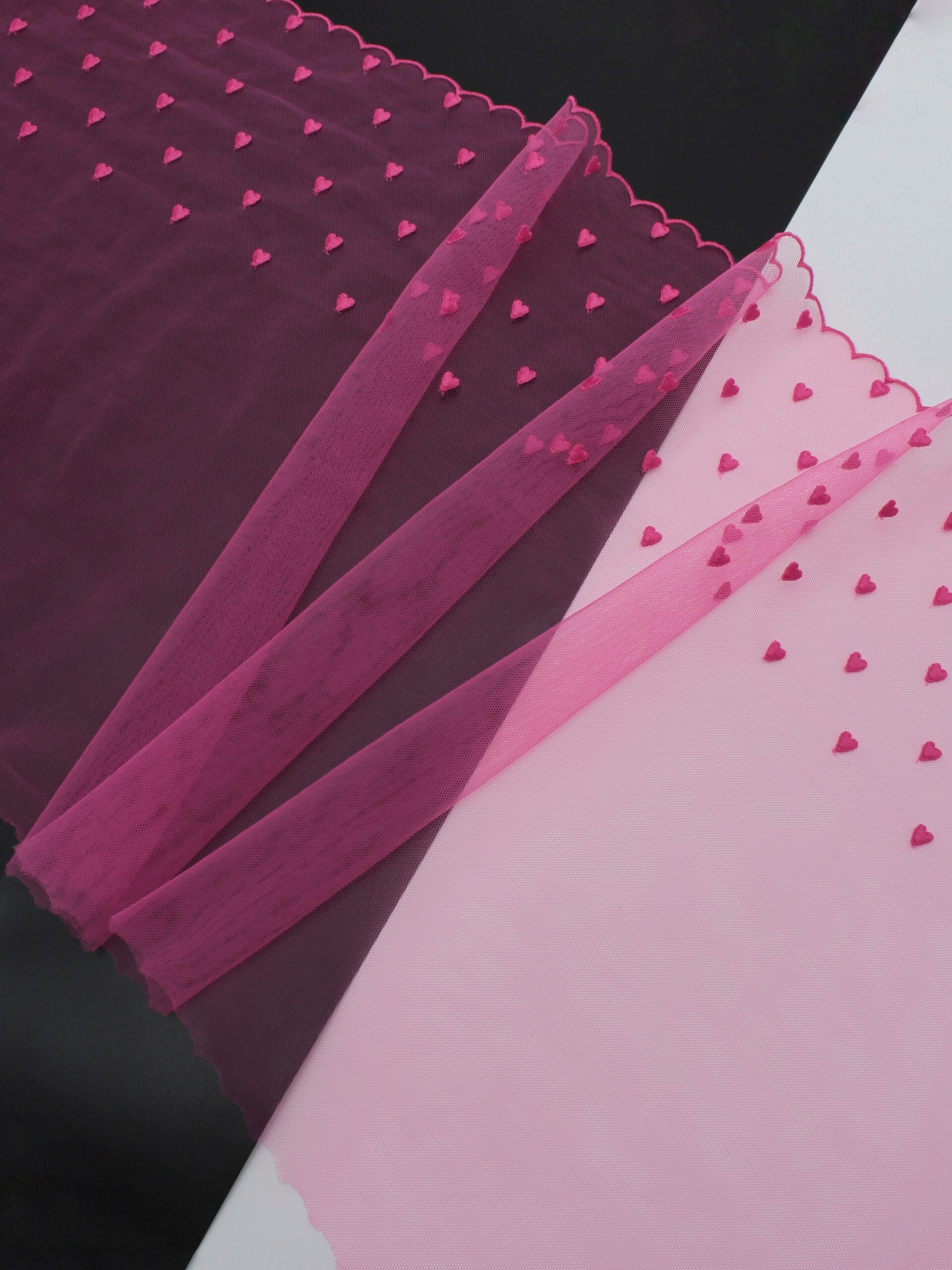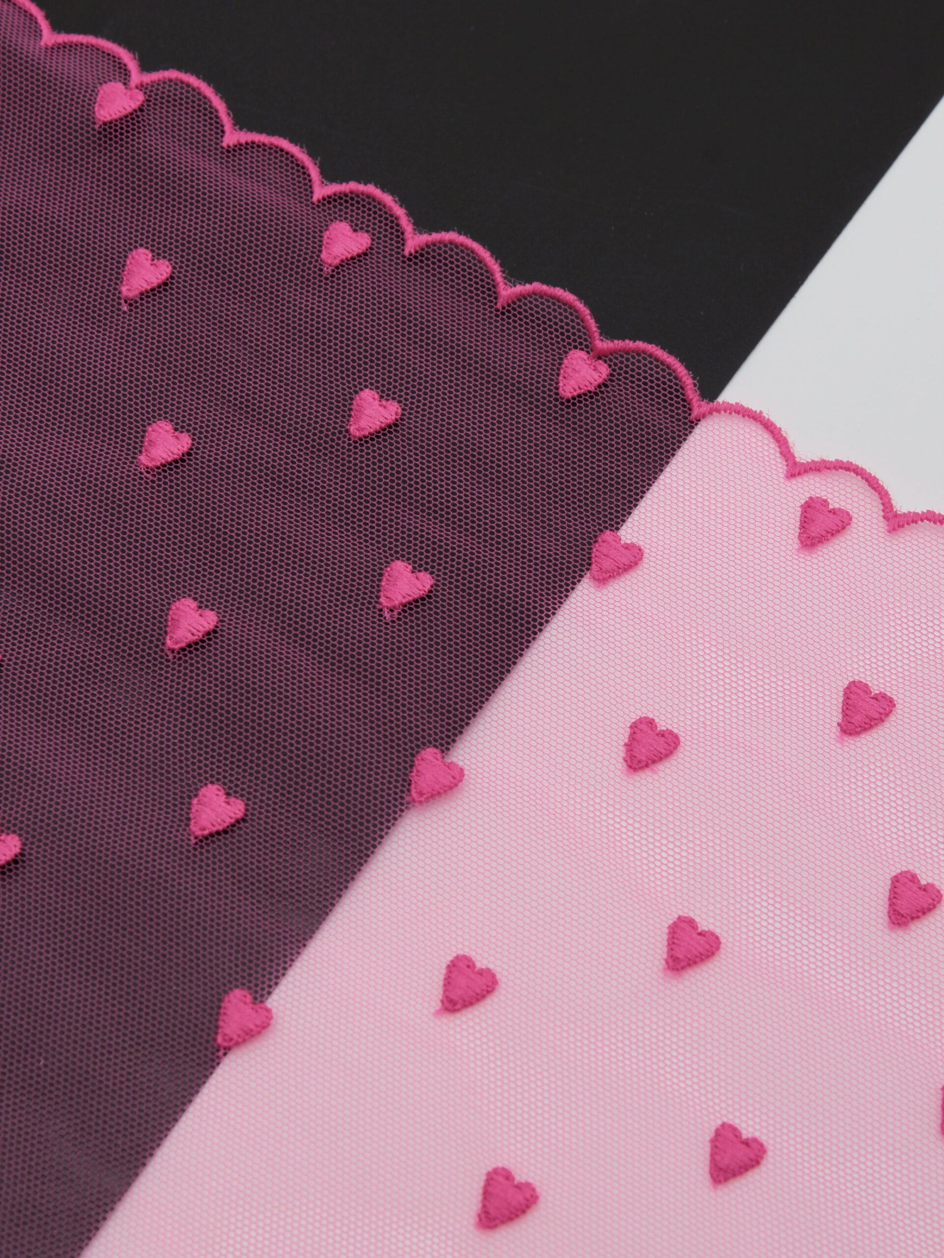 Кружево на сетке неэластичное розового оттенка с рисунком сердечками. Вышивка цвета малиновая фуксия.