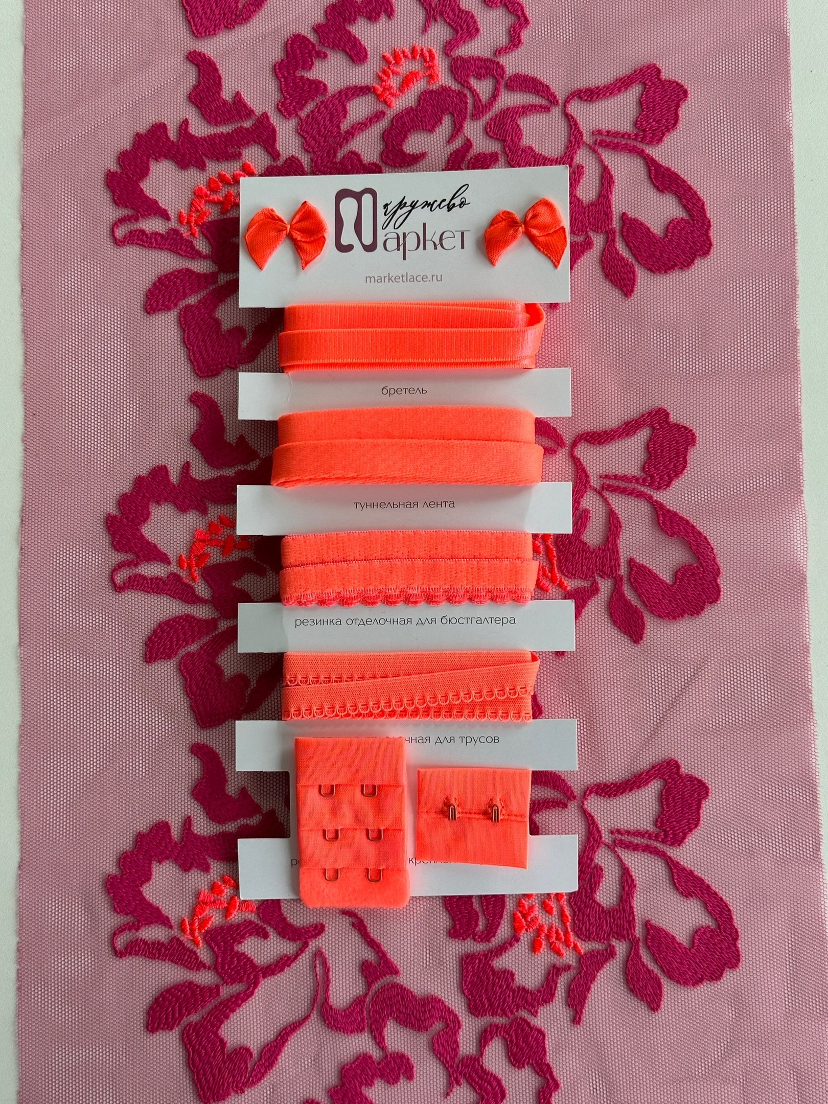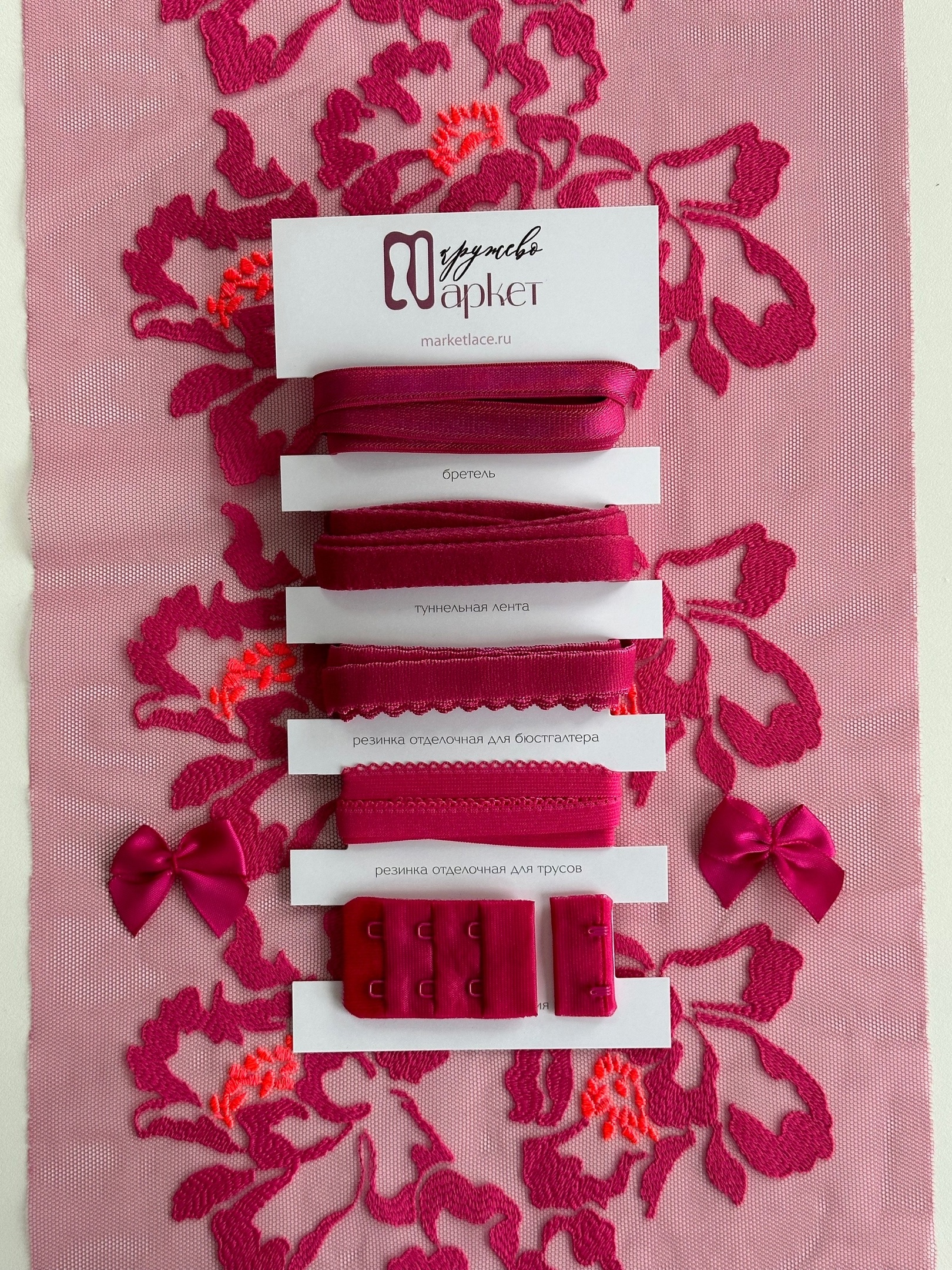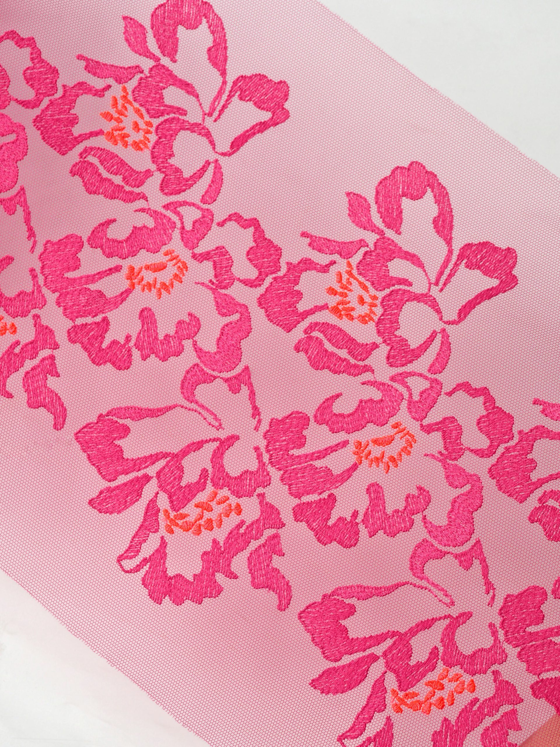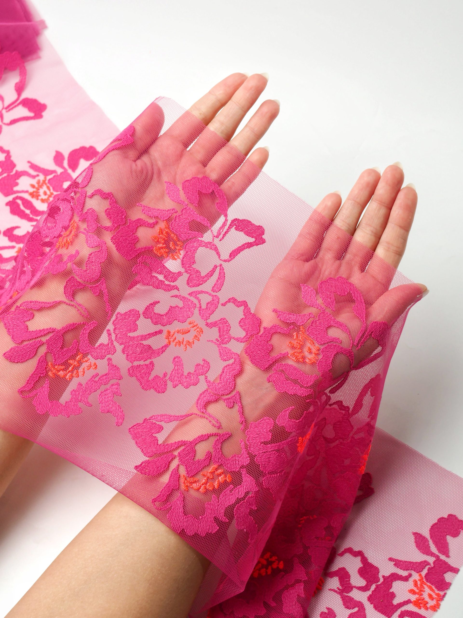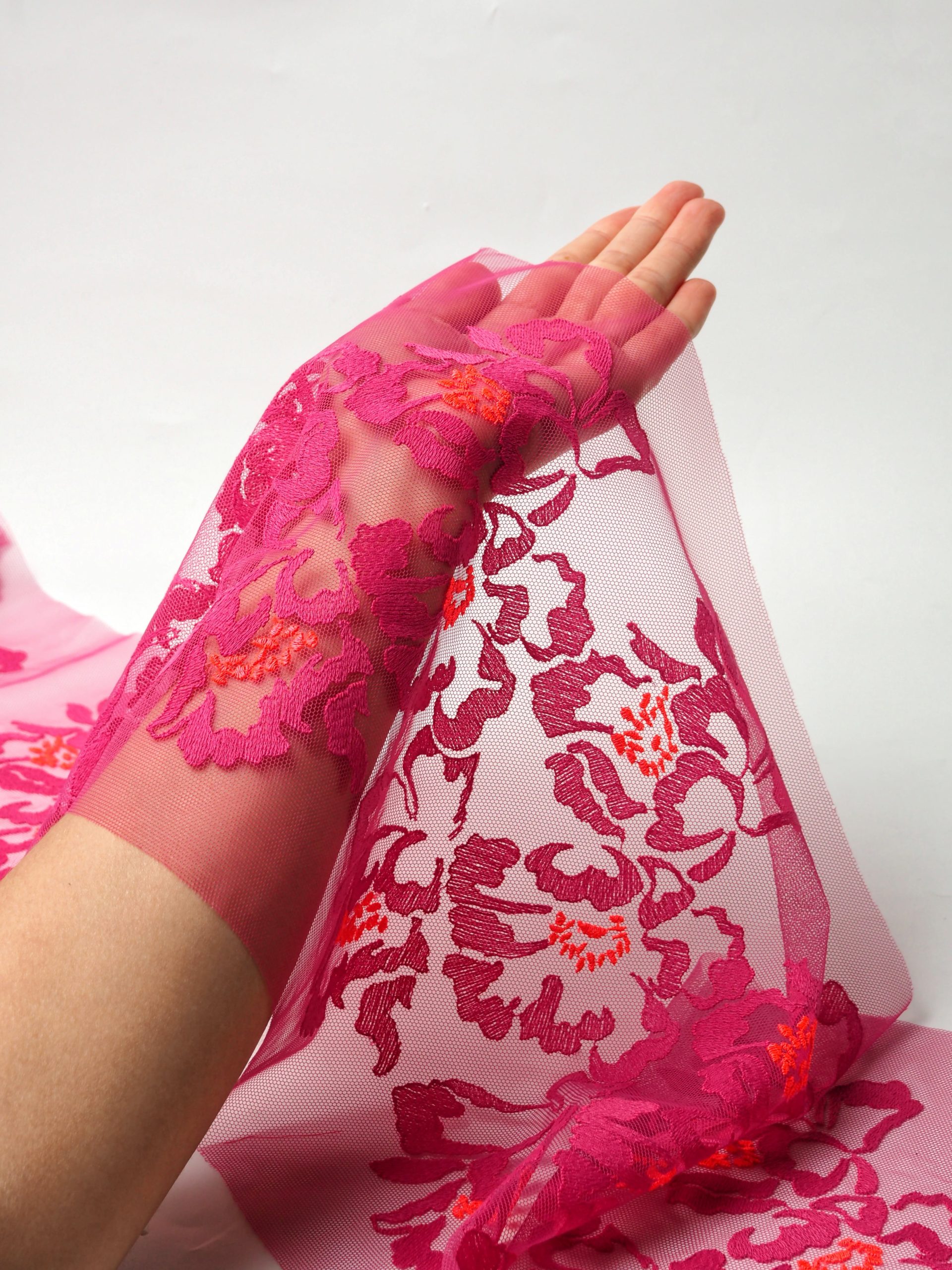 Кружево на сетке неэластичное розового и красного оттенка с цветочным рисунком в левую и правую сторону. Вышивка цвета малиновая фуксия и оранжевого на сетке фуксия.