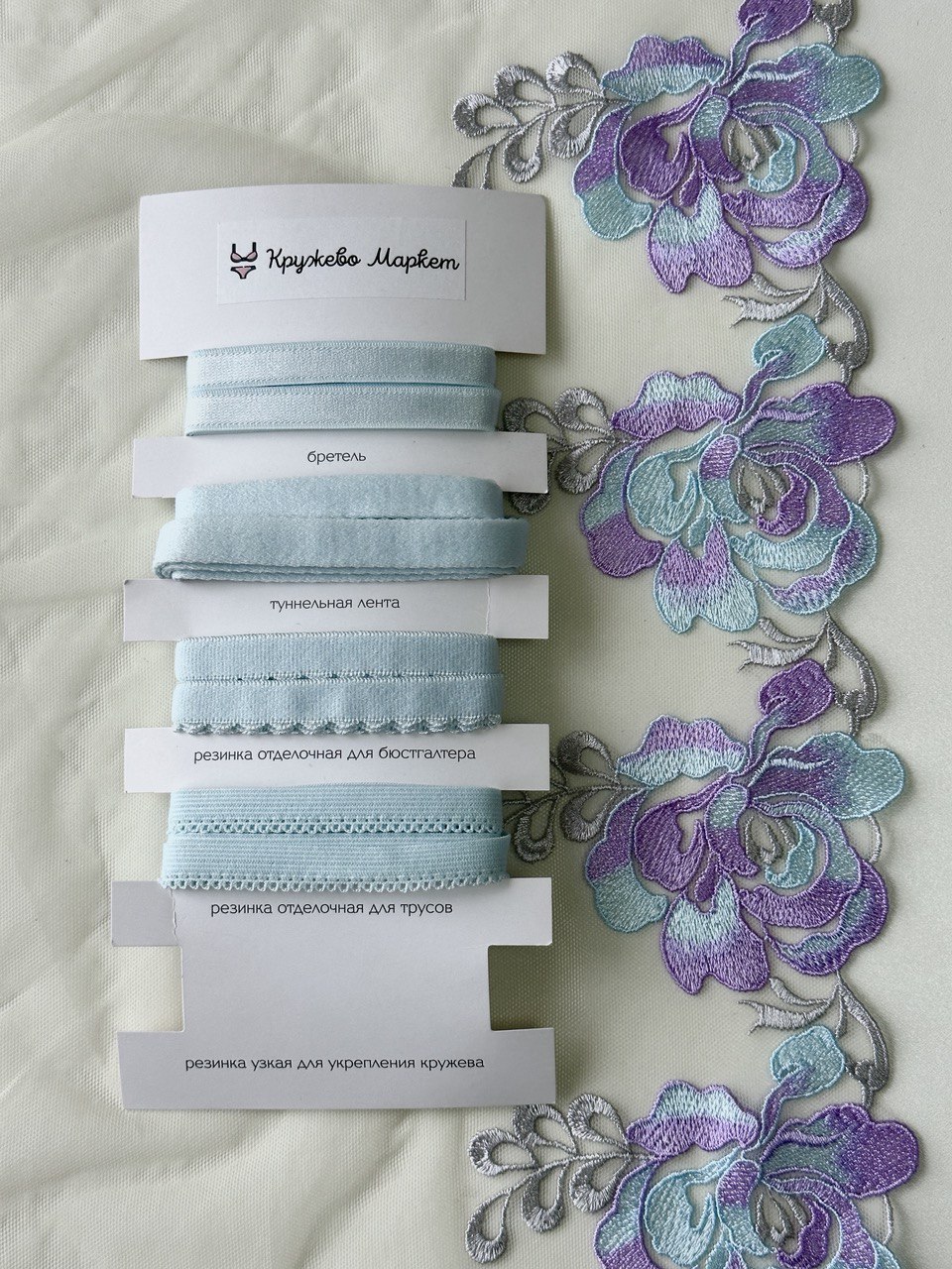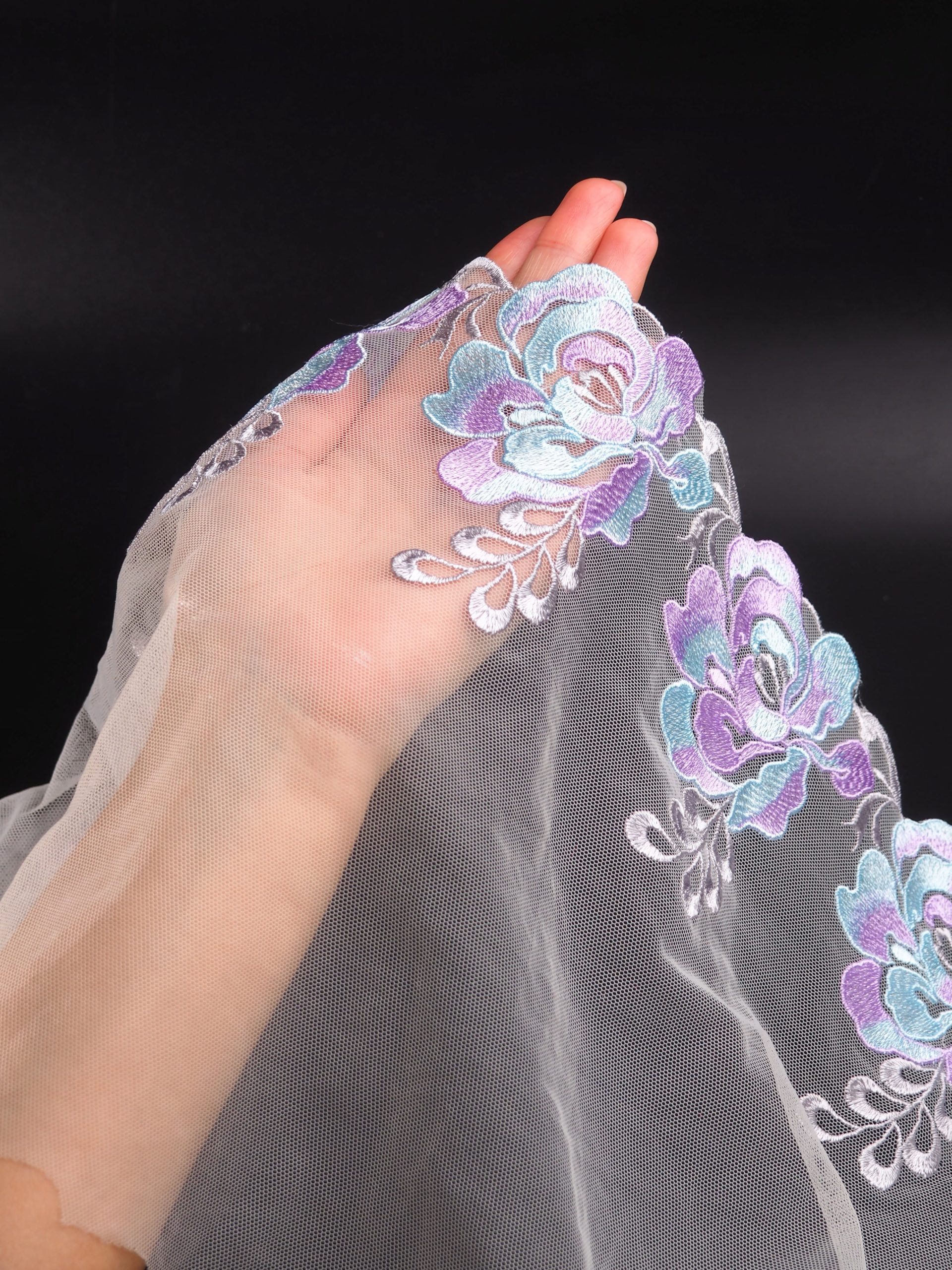 Вышивка на сетке неэластичная белого цвета с цветочным рисунком в левую и правую сторону. Кружево на сетке молочное со светло-голубым, лавандовым и серым.