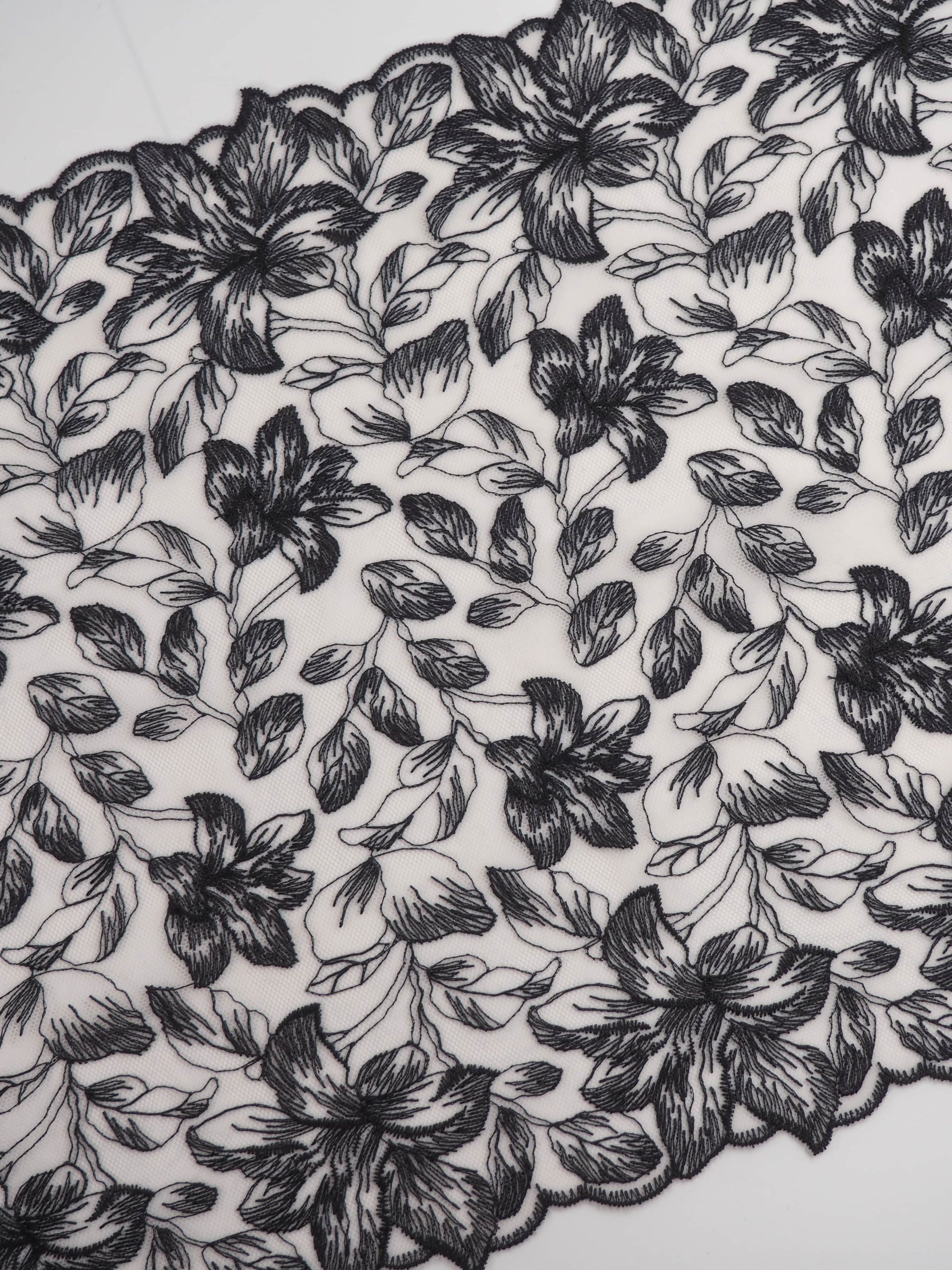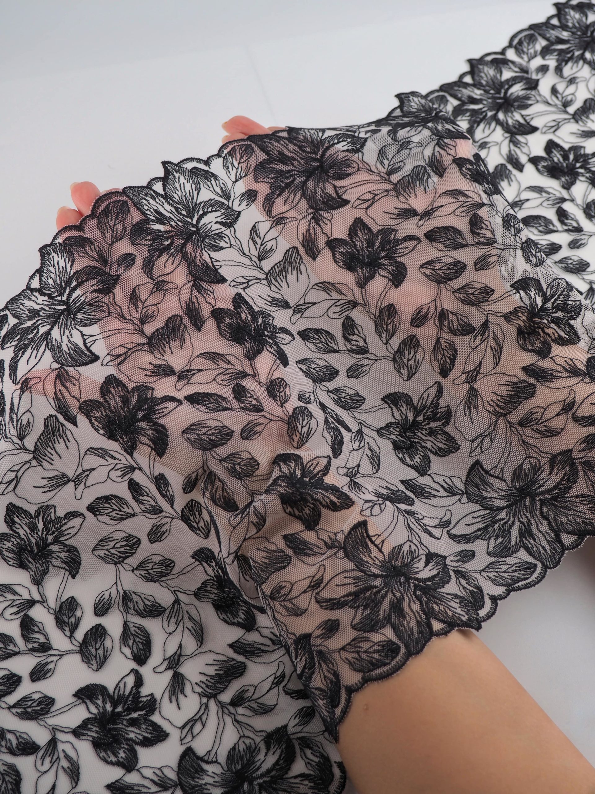 Кружево на сетке неэластичное кремового и черного оттенка с цветочным рисунком. Вышивка черного и темно-серого цвета на сетке молочной с розовинкой.