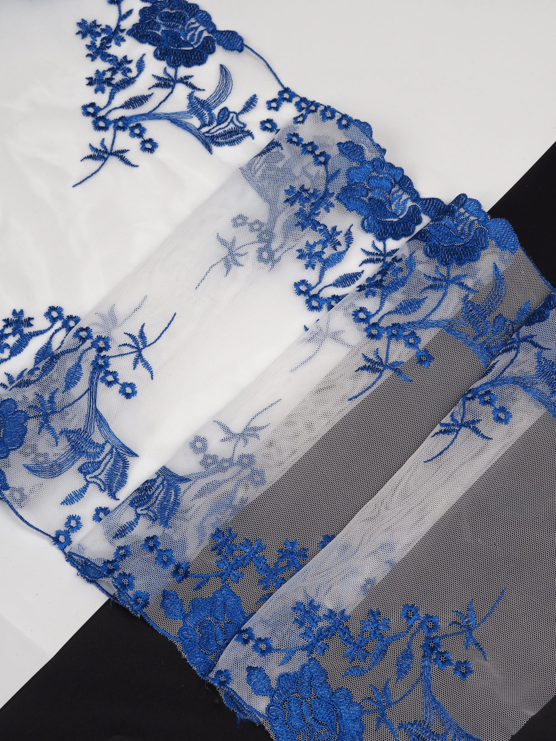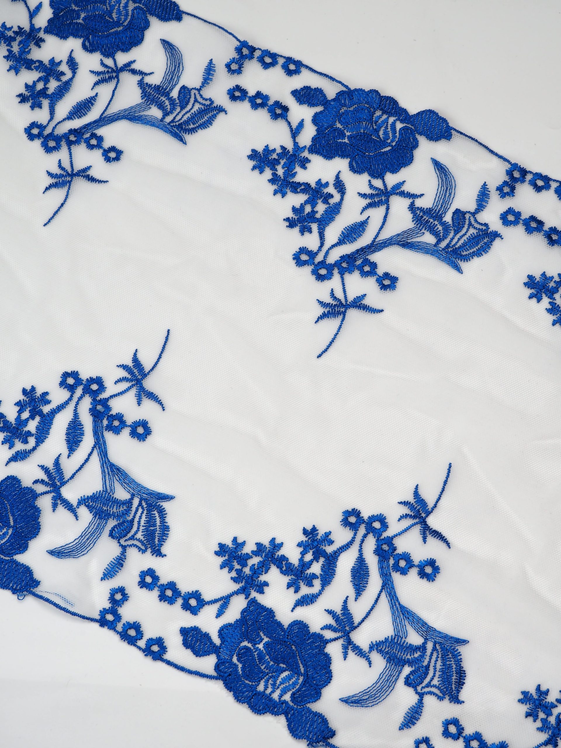Кружево на сетке белое неэластичное с синим цветочным рисунком . Вышивка на сетке молочного цвета с васильковым.