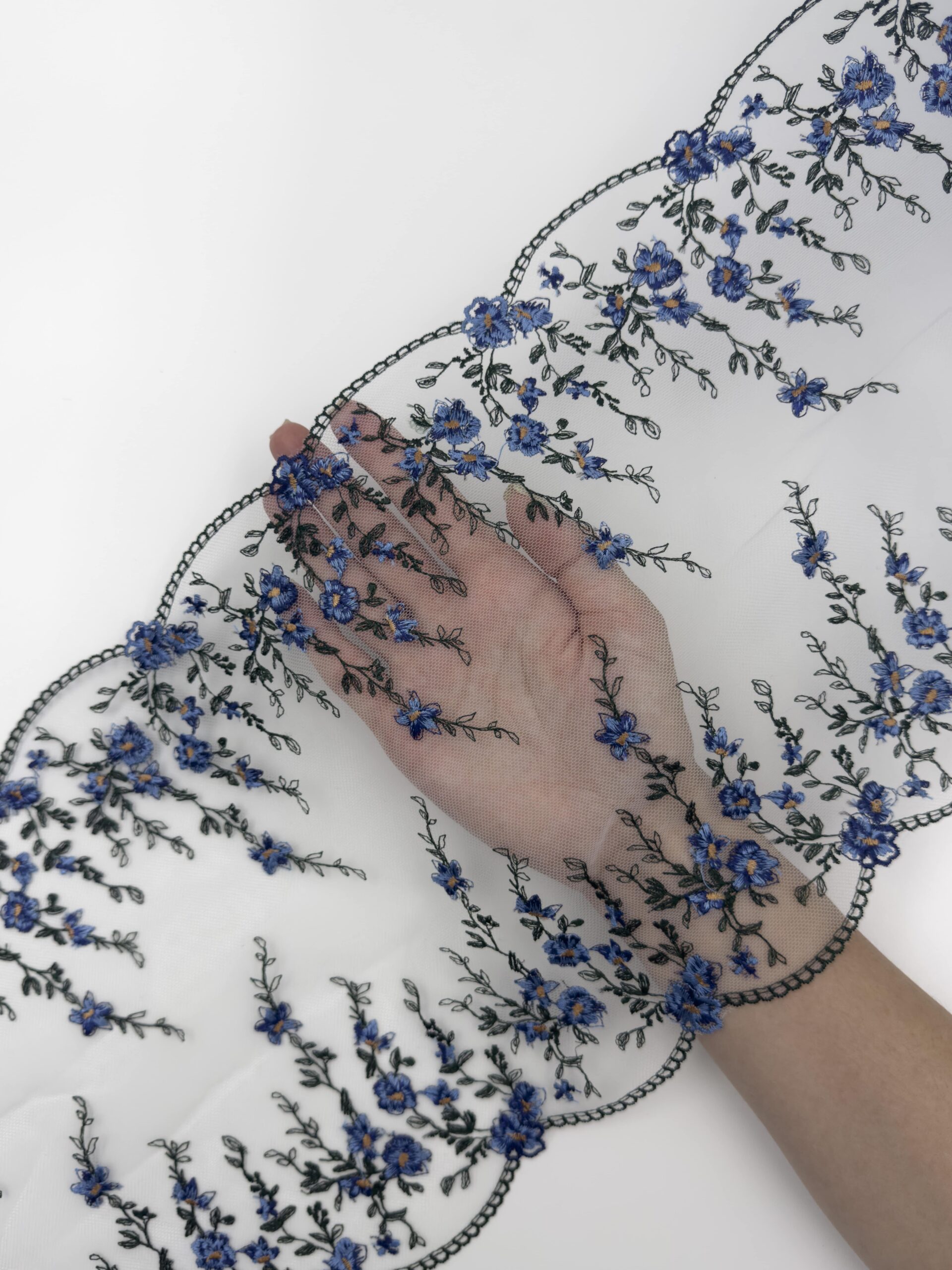 Кружево на сетке белое неэластичное с синим и зеленым цветочным рисунком. Вышивка василькового и темно-зеленого цвета на молочной сетке. Попадаются дырочки редко, нитки.