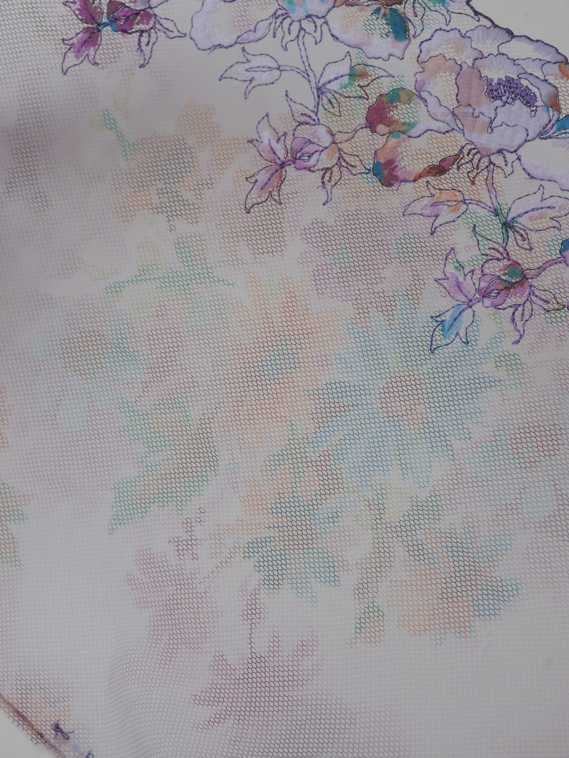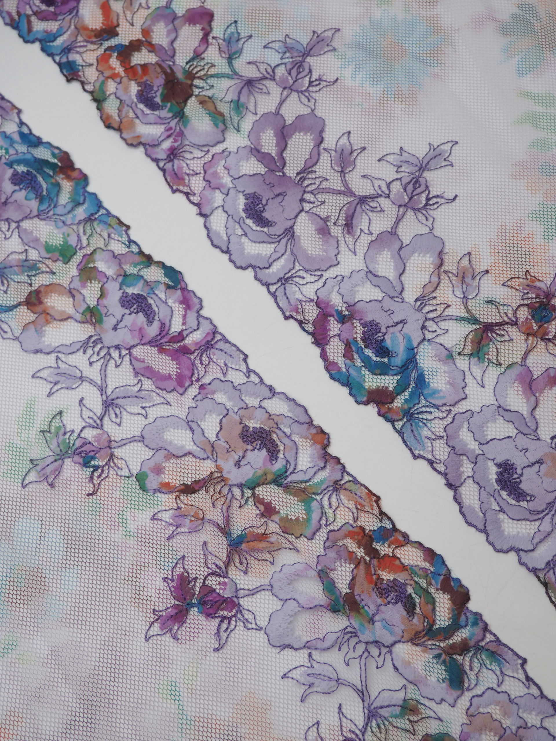 Кружево на сетке неэластичное с мультиколором в левую и правую сторону.
