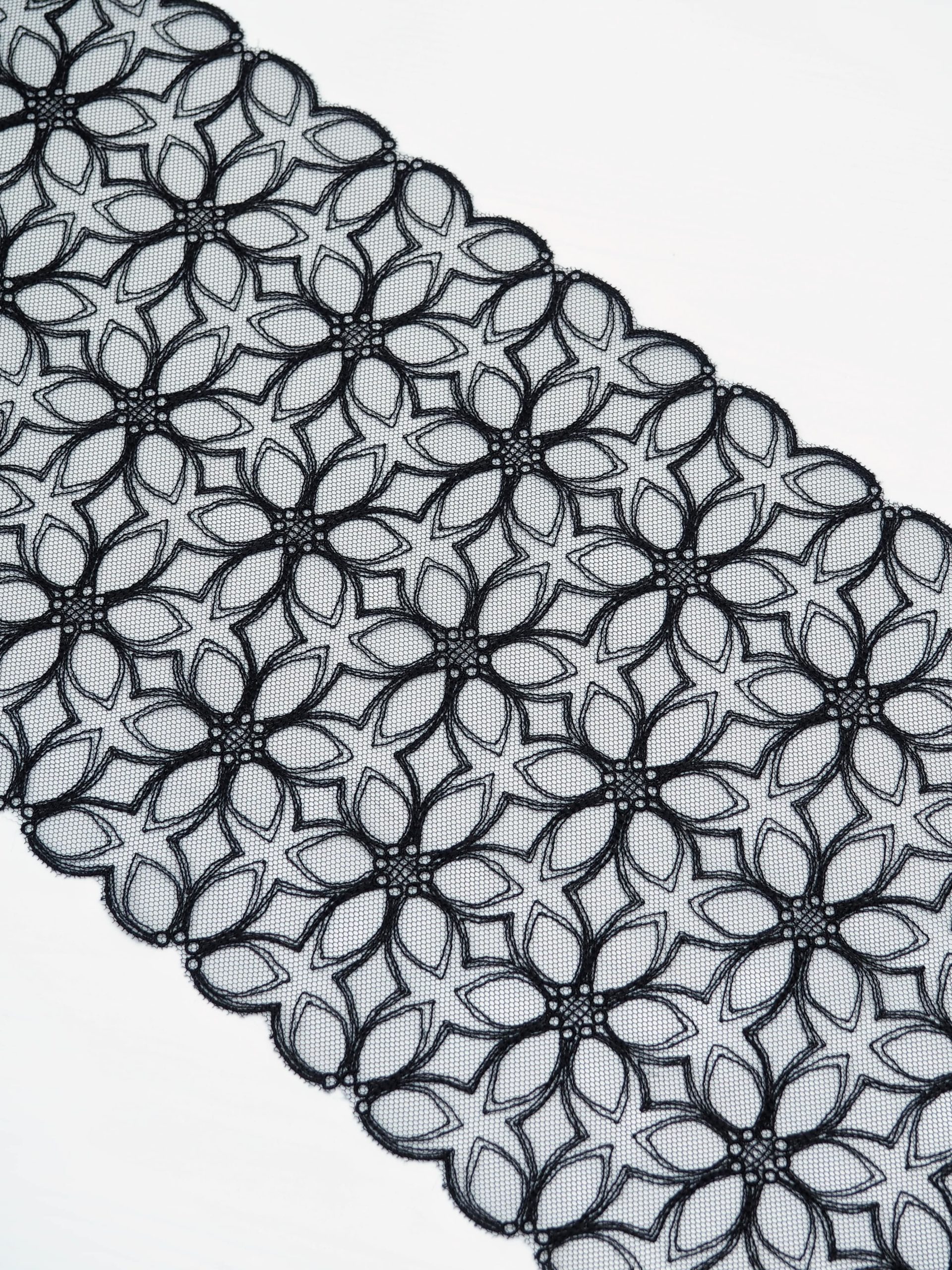Кружево на сетке неэластичное с узорчатым рисунком. Вышивка на сетке черного цвета.