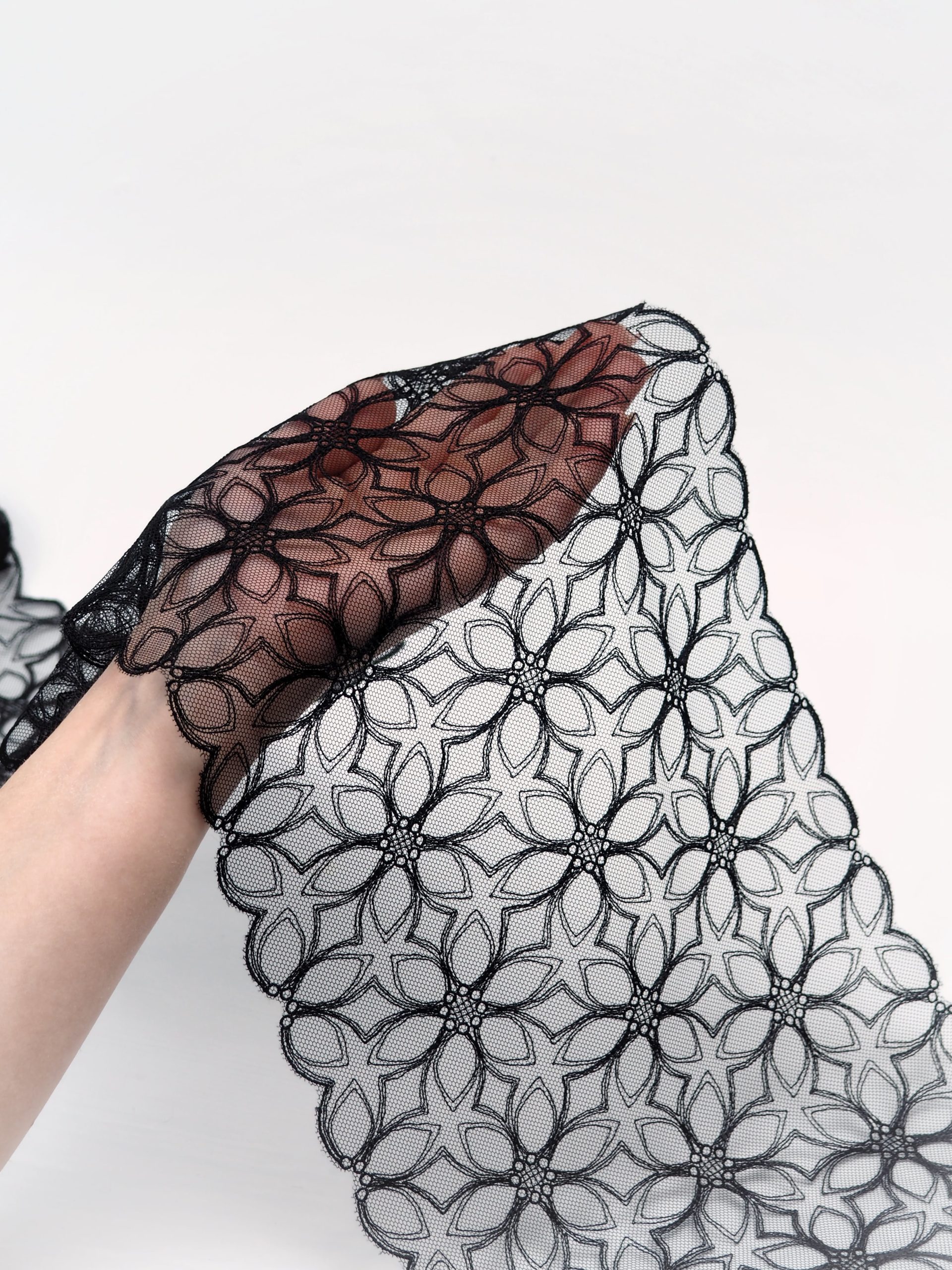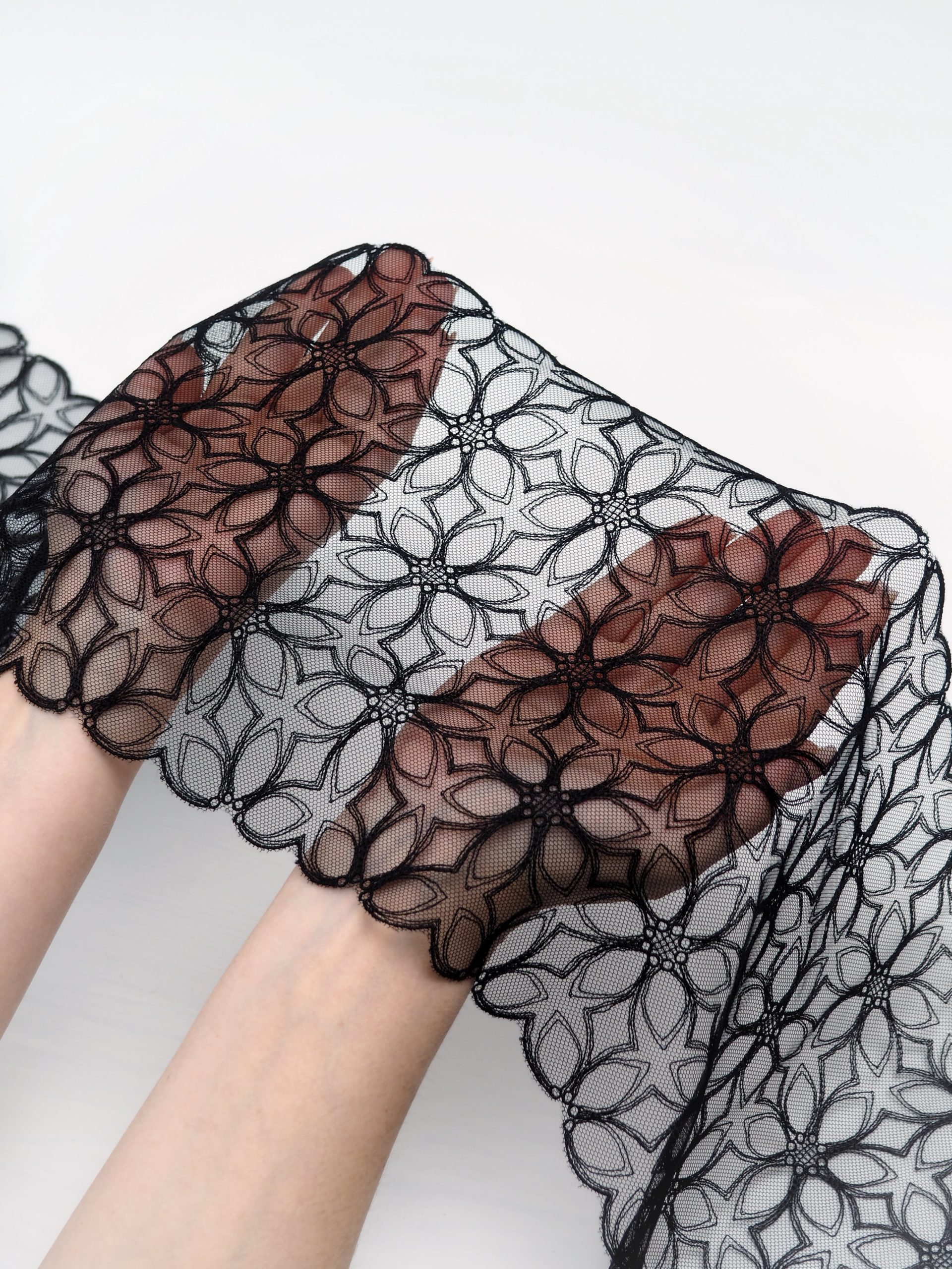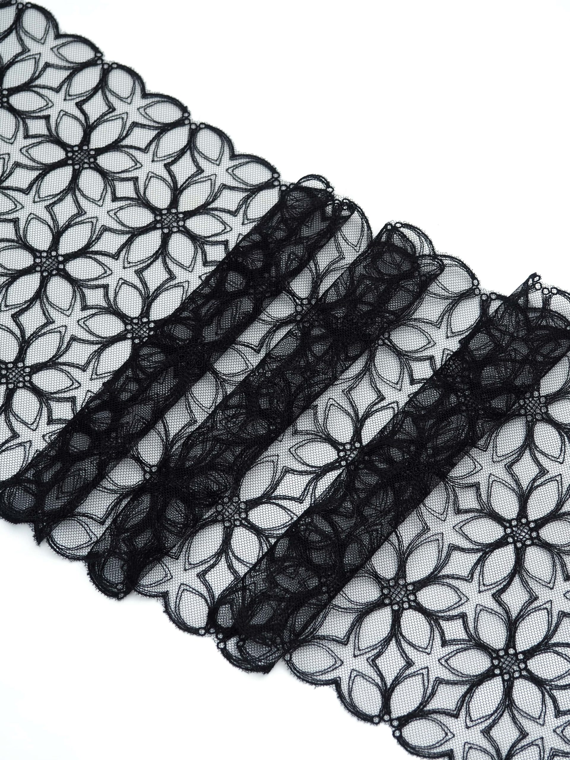 Кружево на сетке неэластичное с узорчатым рисунком. Вышивка на сетке черного цвета.