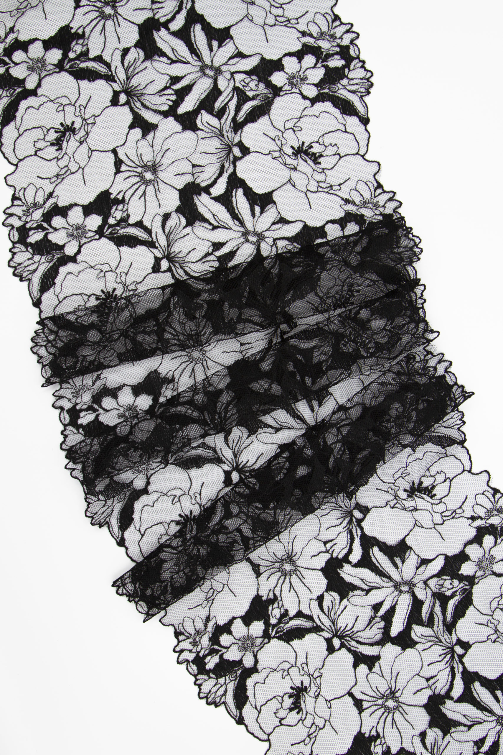 Кружево на сетке неэластичное с цветочным рисунком. Вышивка на сетке черного цвета.