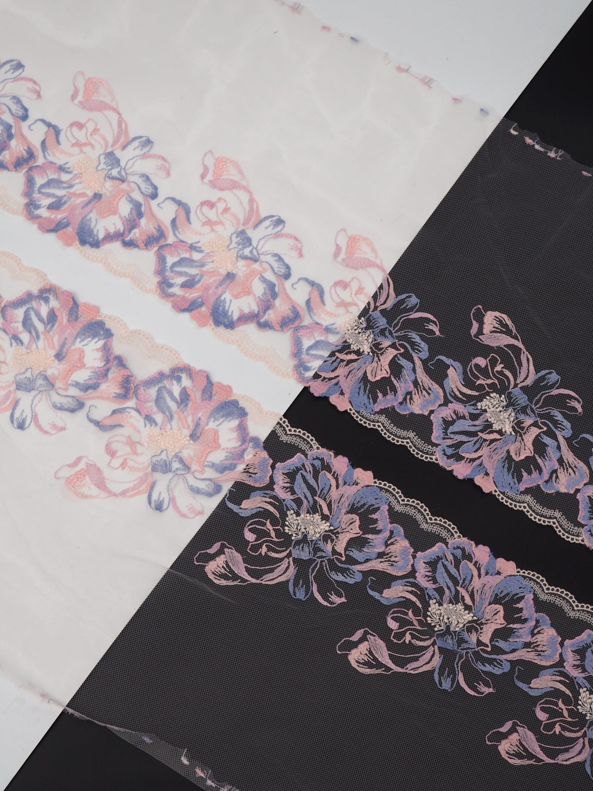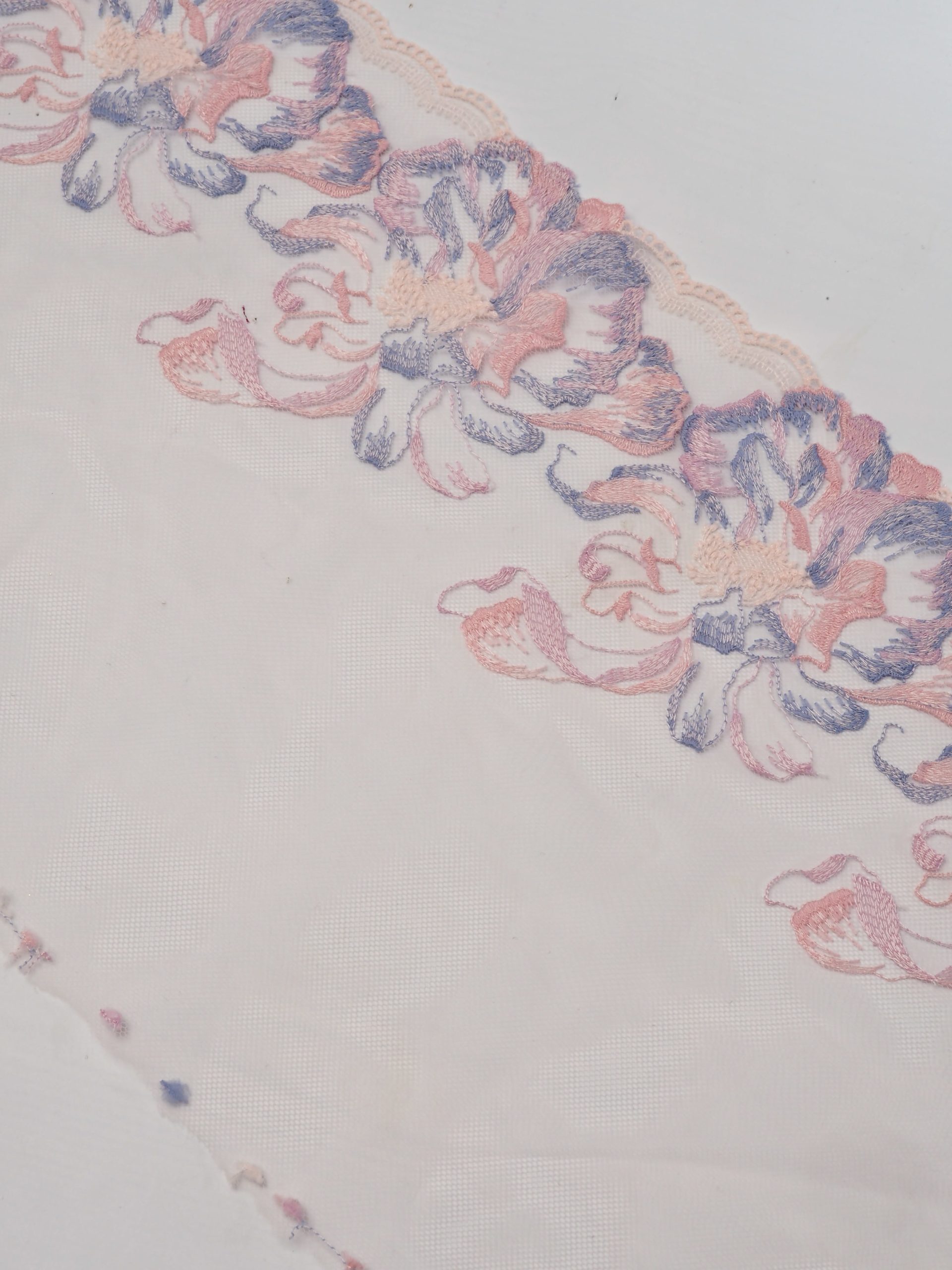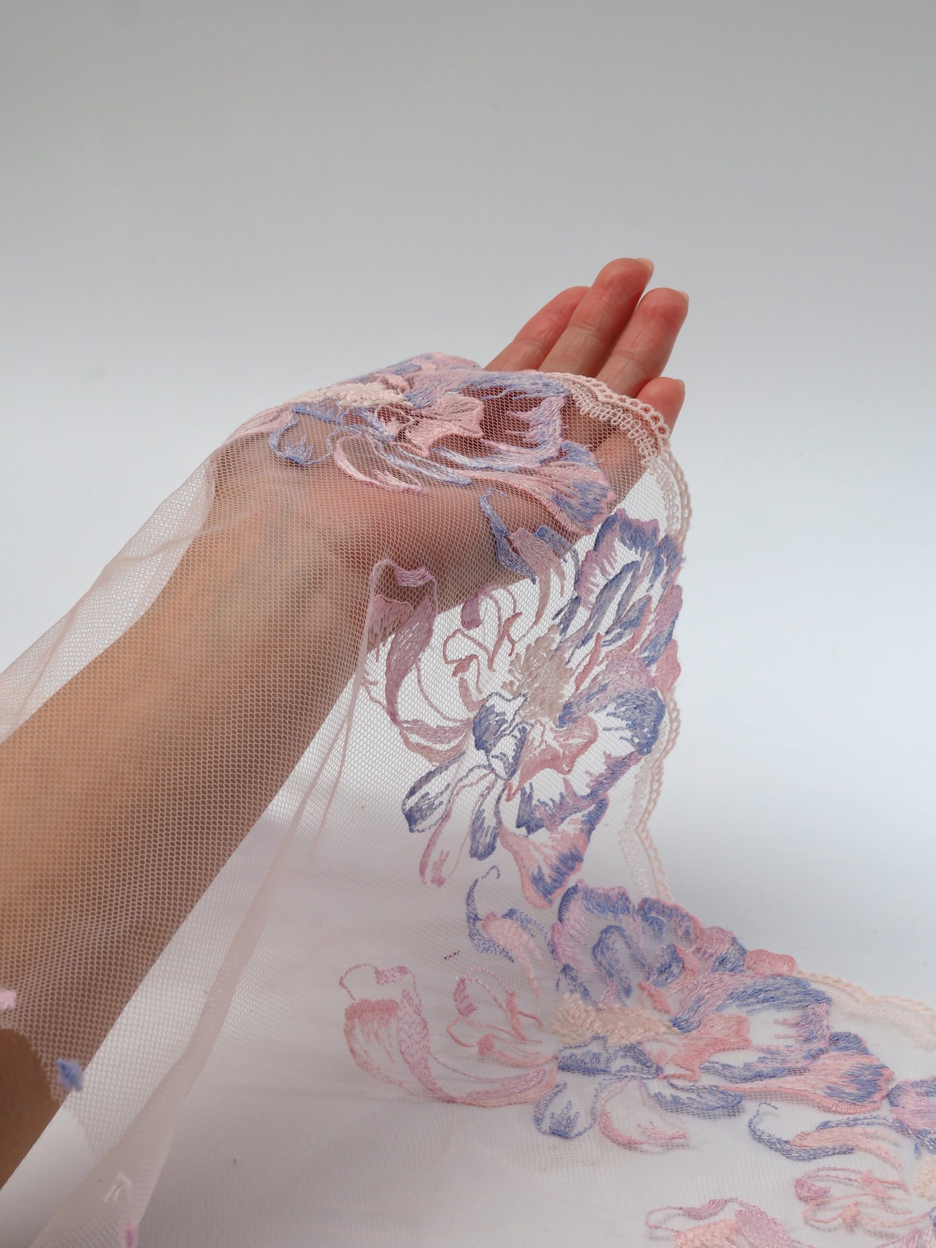 Кружево на сетке розового оттенка с цветочным рисунком в левую и правую сторону. Вышивка пудрового и серенево-голубого цвета на нежно-розовой сетке.