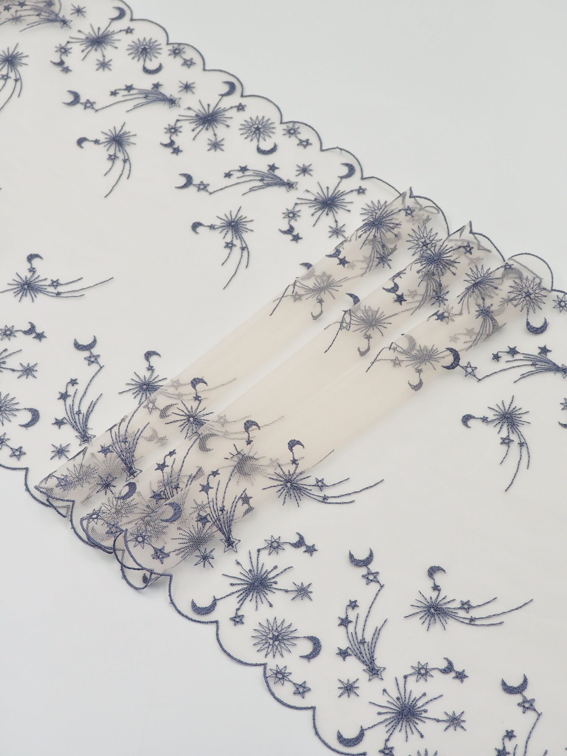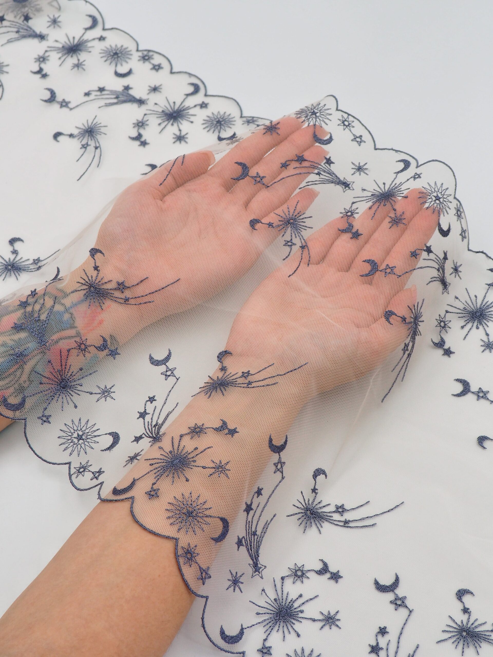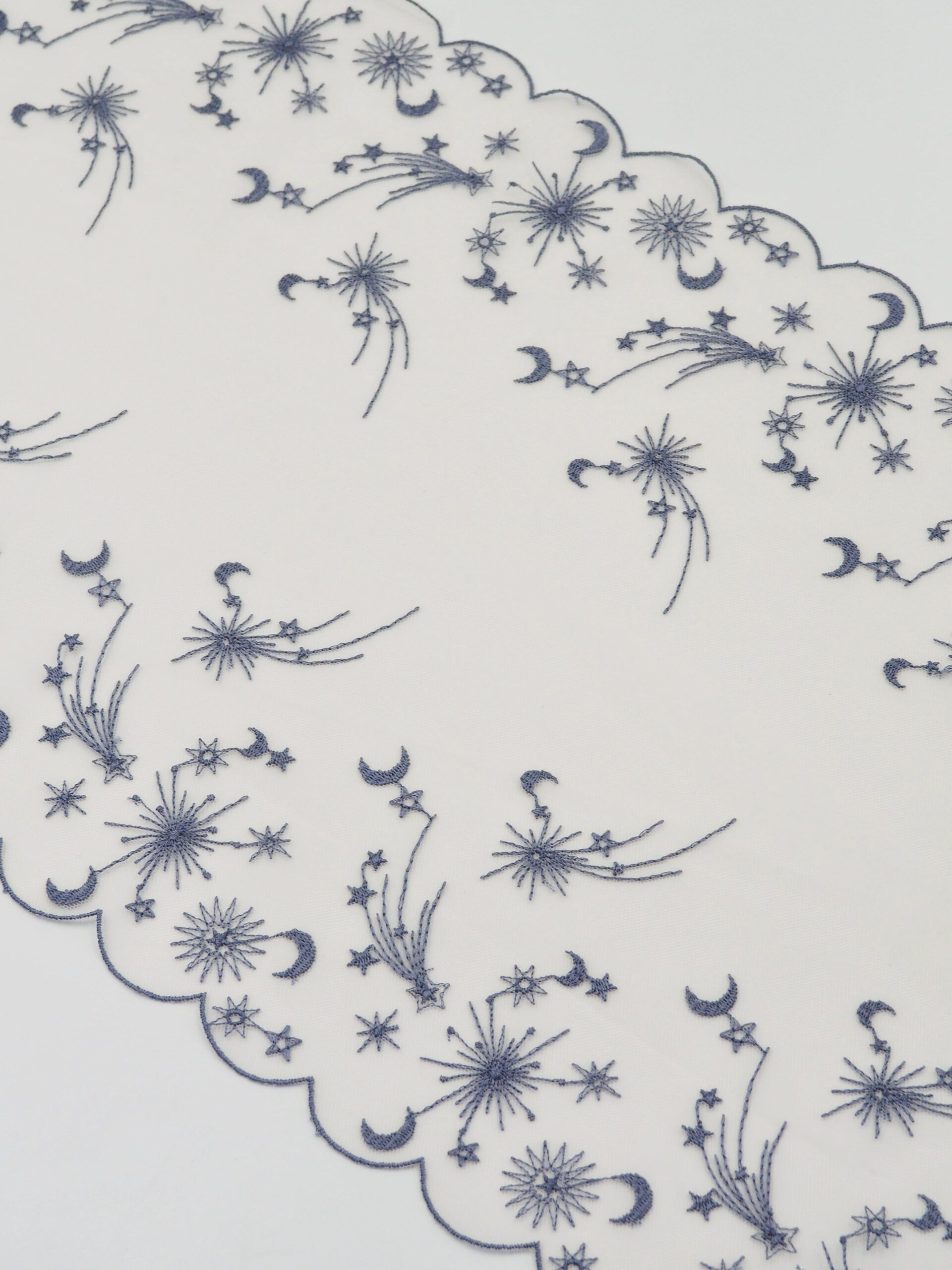 Кружево на сетке неэластичное кремового оттенка с космическим рисунком. Вышивка синего цвета на кремовой сетке.