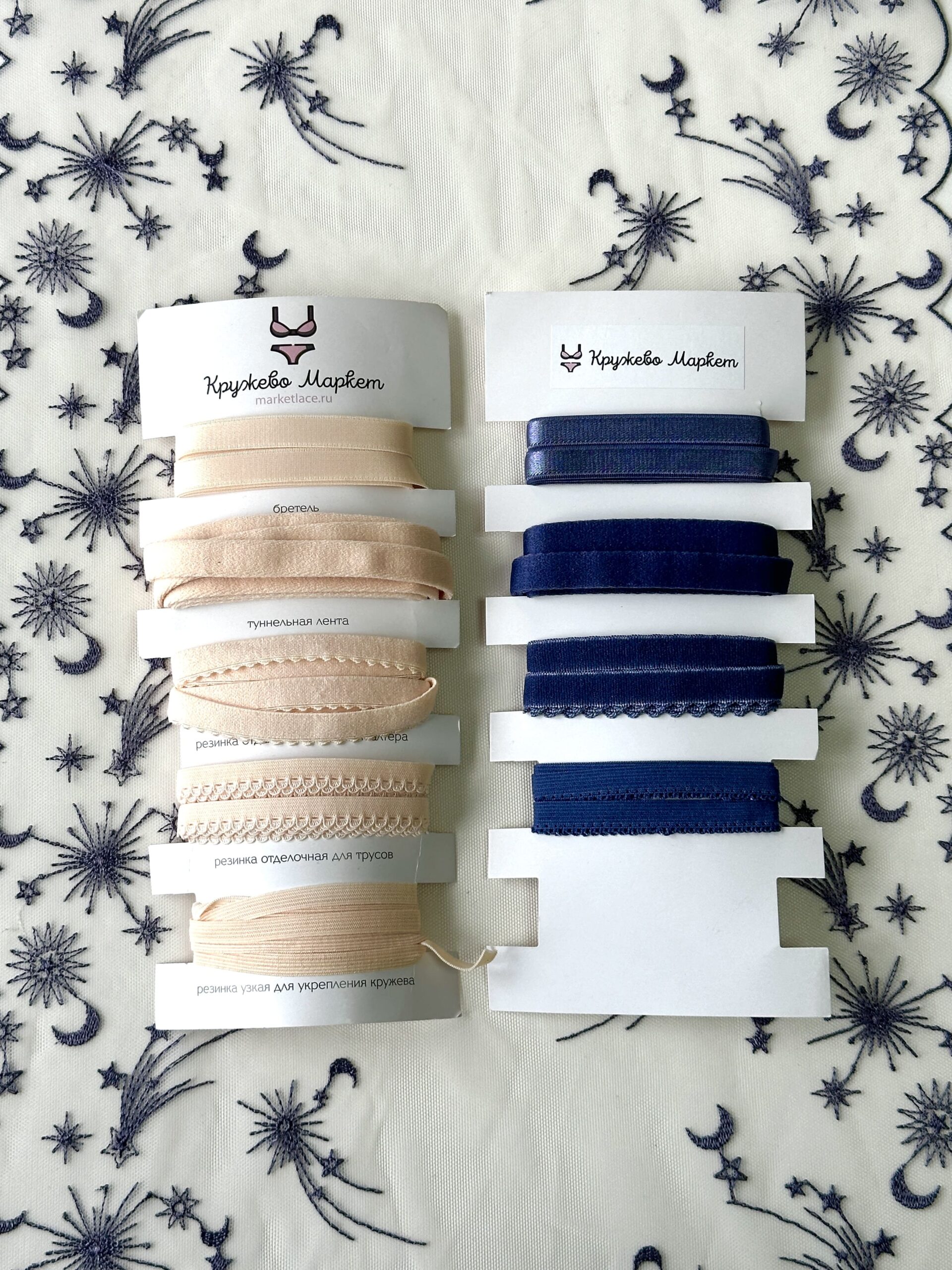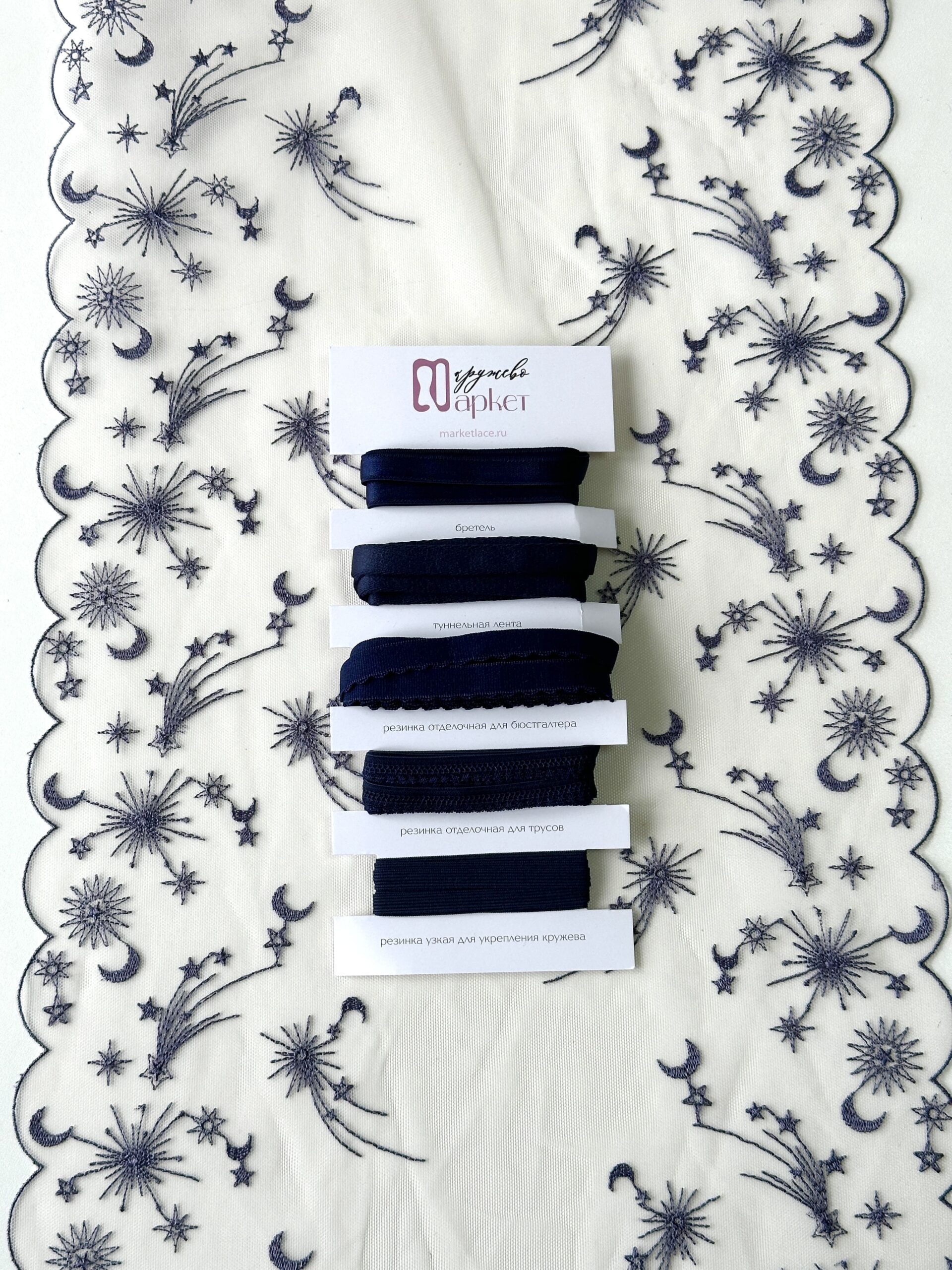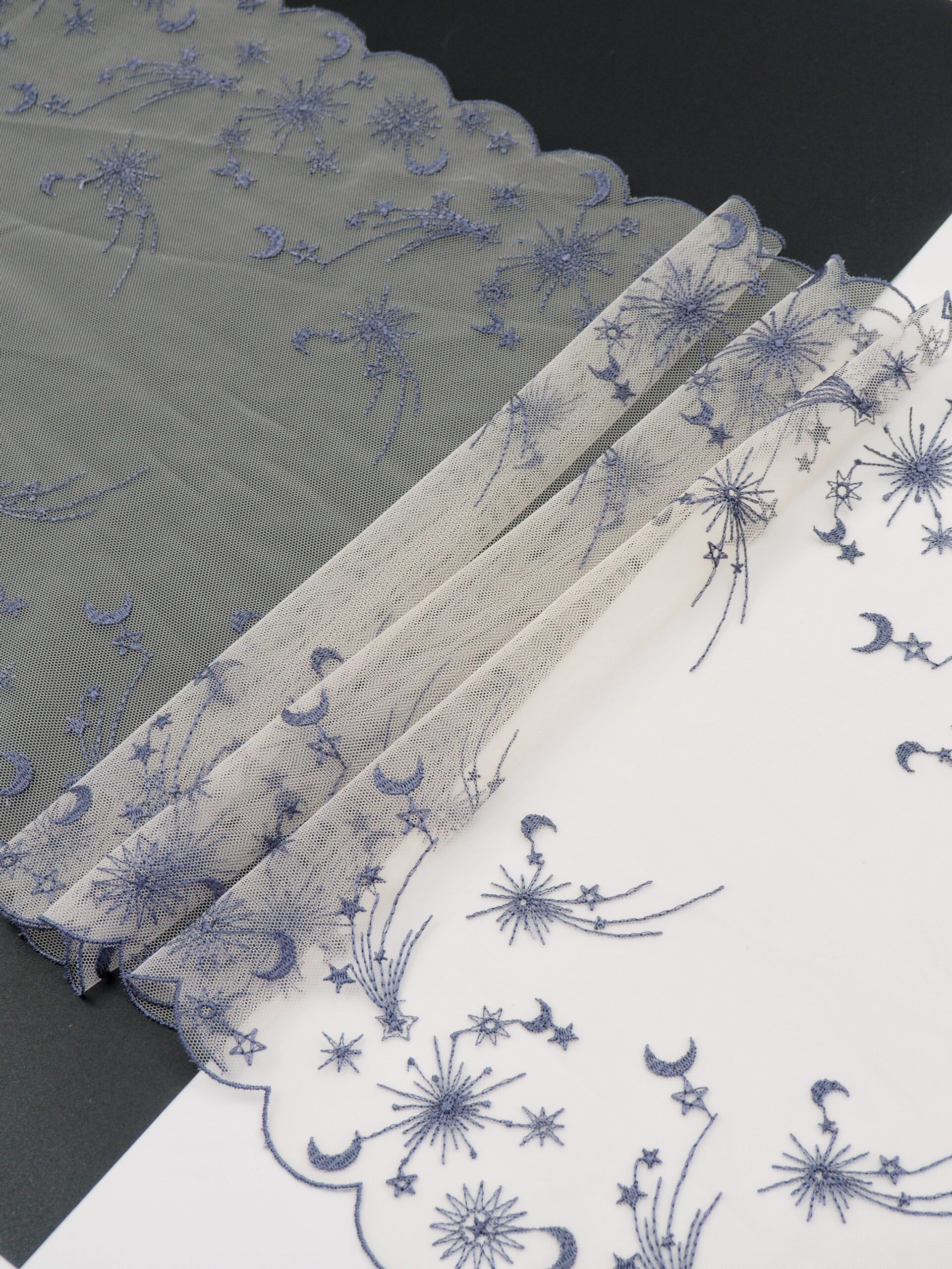 Кружево на сетке неэластичное кремового оттенка с космическим рисунком. Вышивка синего цвета на кремовой сетке.