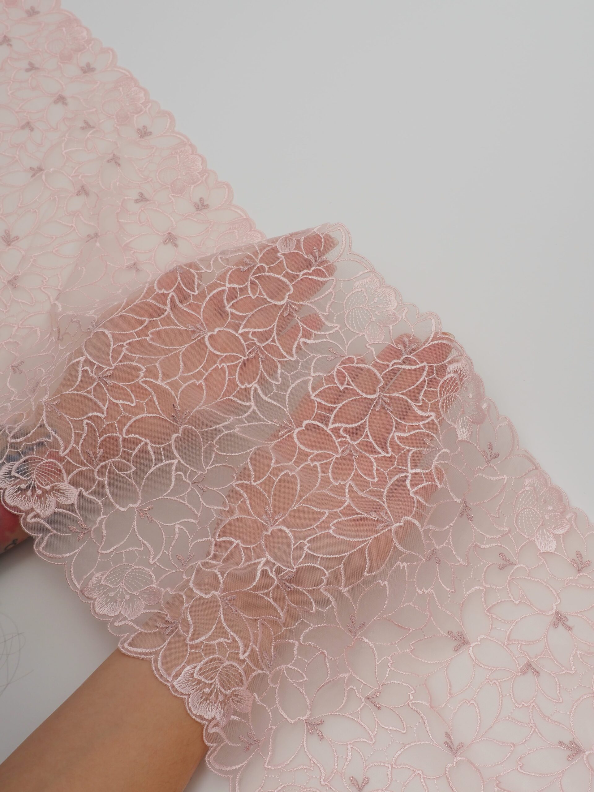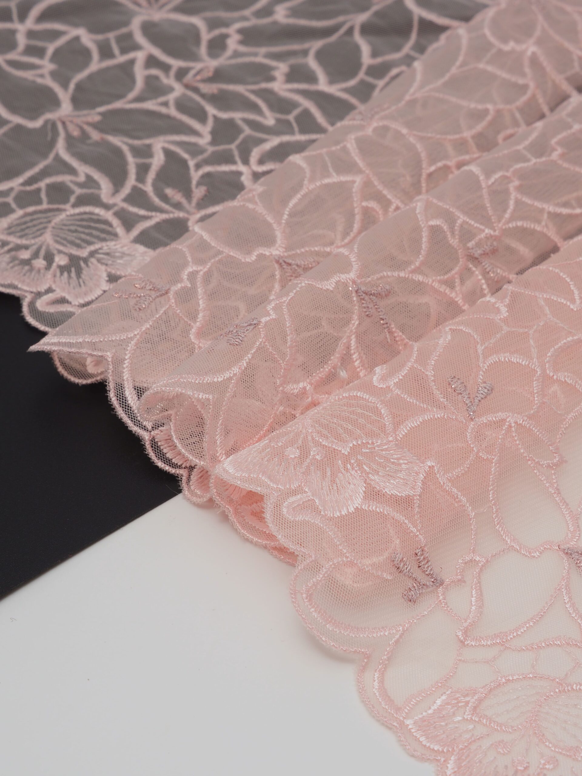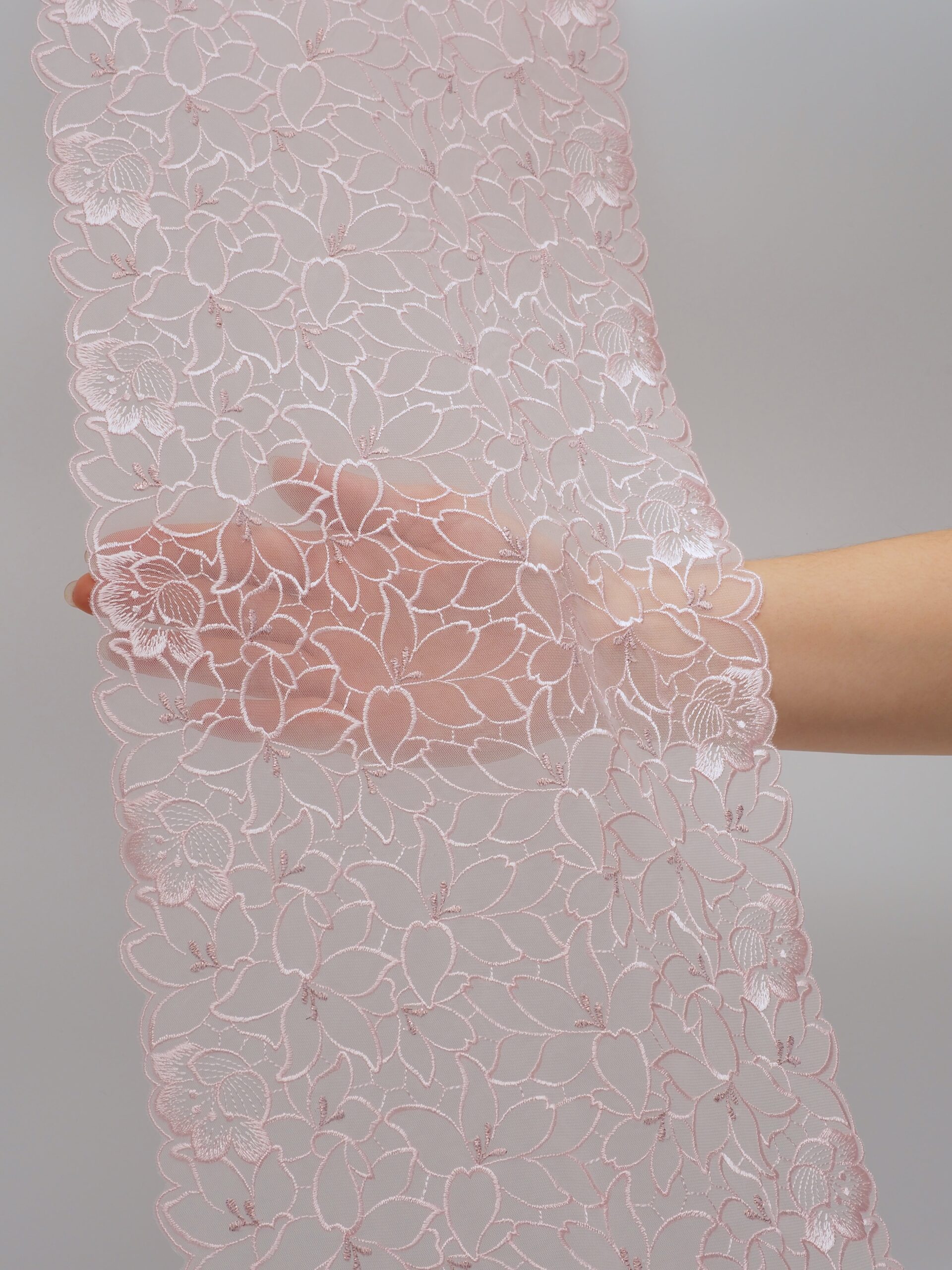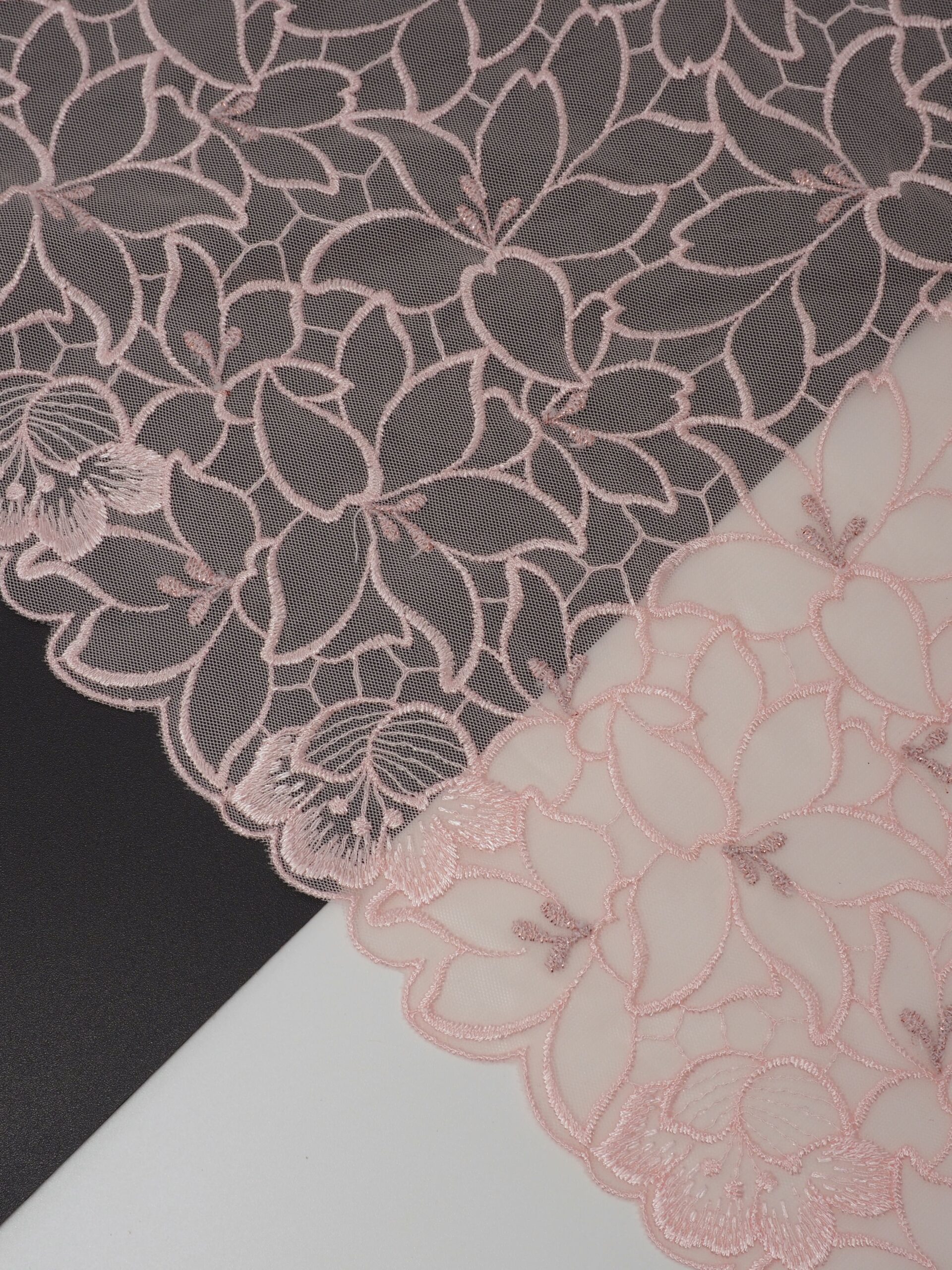 Вышивка на сетке пудровая - удобная и красивая ткань для создания оригинального декора. Готовая основа с кружевными узорами и орнаментами - настоящая помощь рукодельницам. Вышивка на сетке великолепно держит форму, не осыпается по краям, отлично драпируется, отличается высокой прочностью на разрыв, весит очень мало, служит в течение многих лет. Используя кружево на сетке, вы легко создадите эффектное эксклюзивное изделие. Материал считается универсальным. Его можно использовать в пошиве нижнего белья, кофты, юбки, блузки, вечернего и свадебного платья.