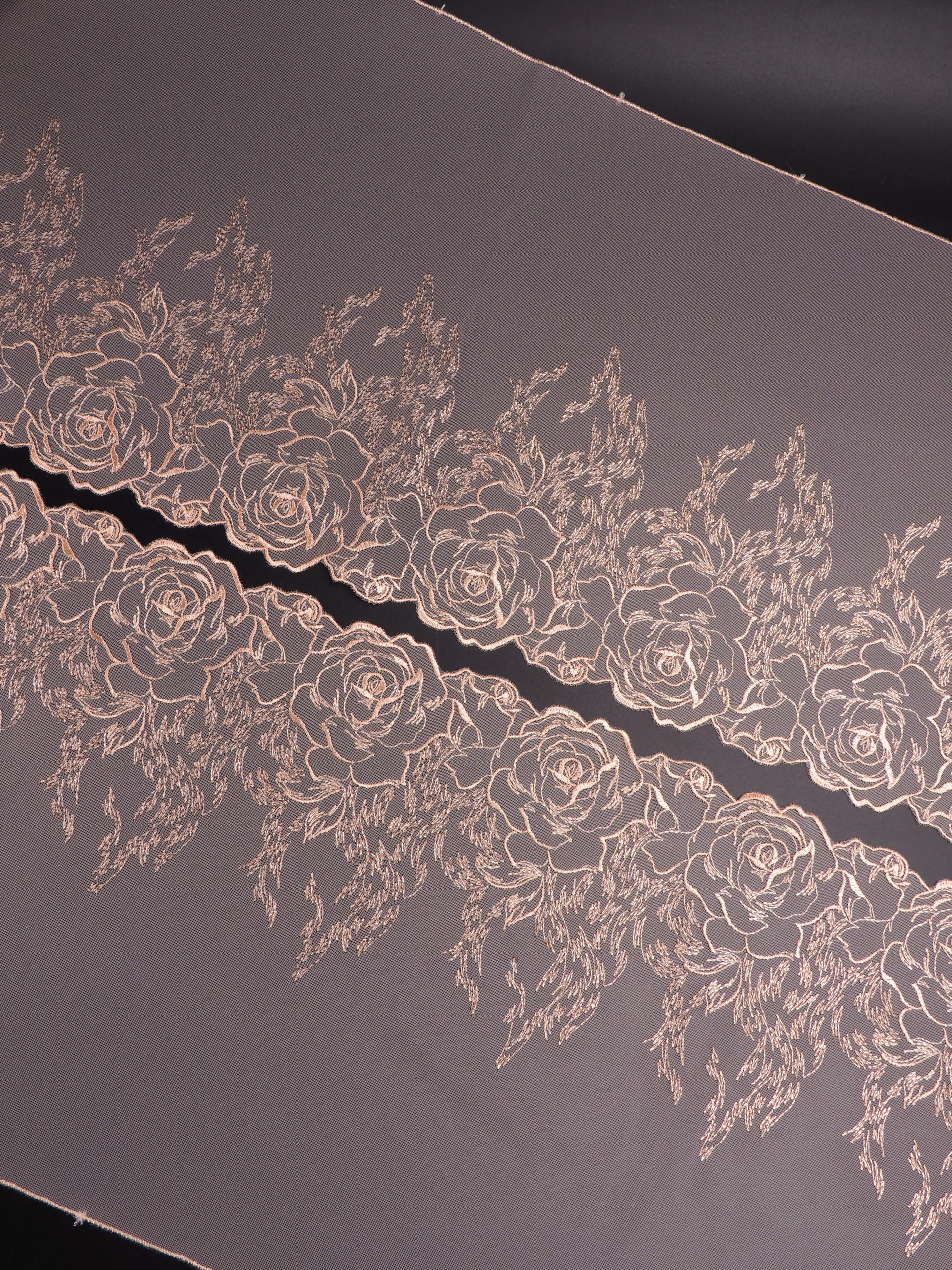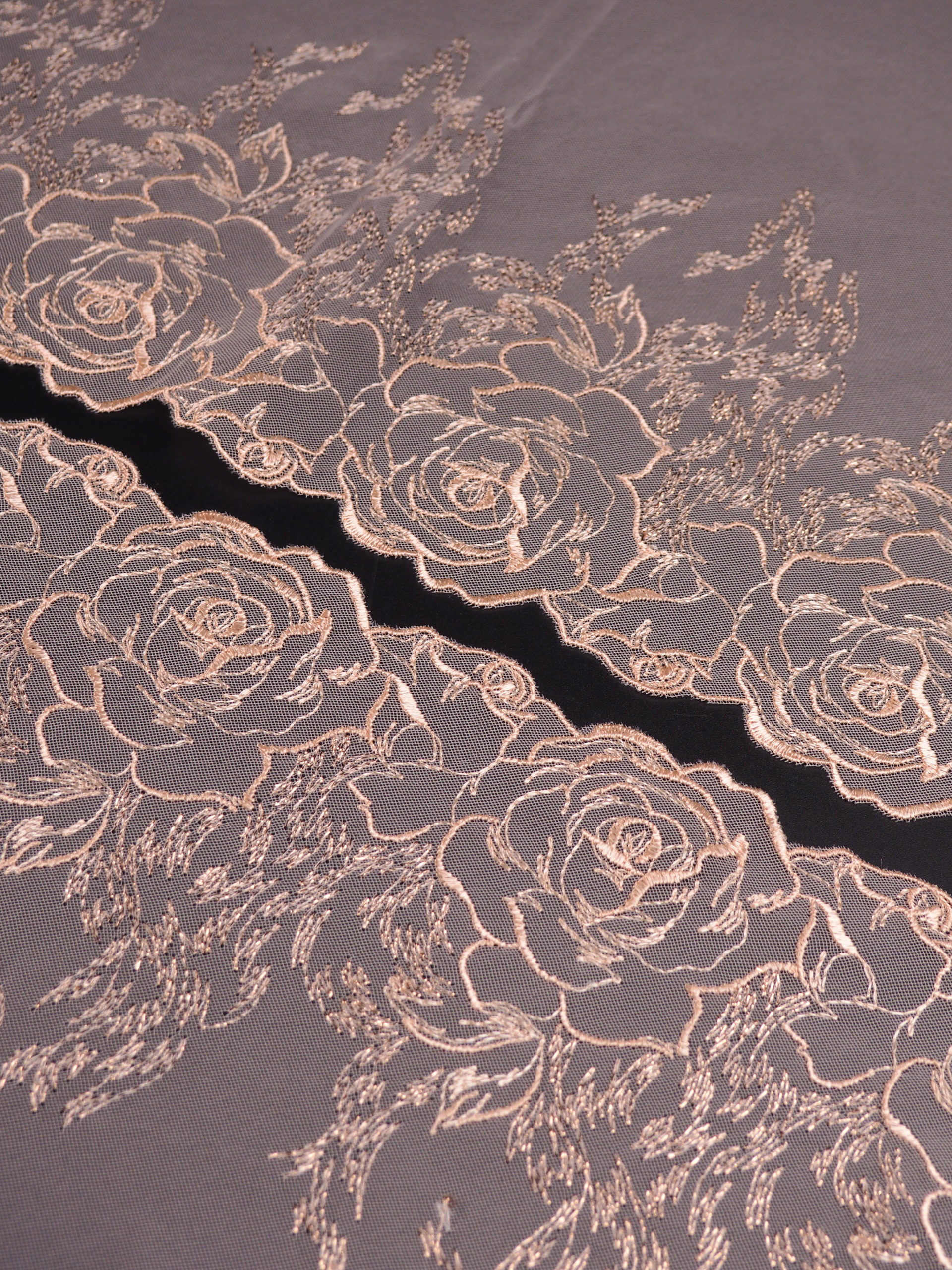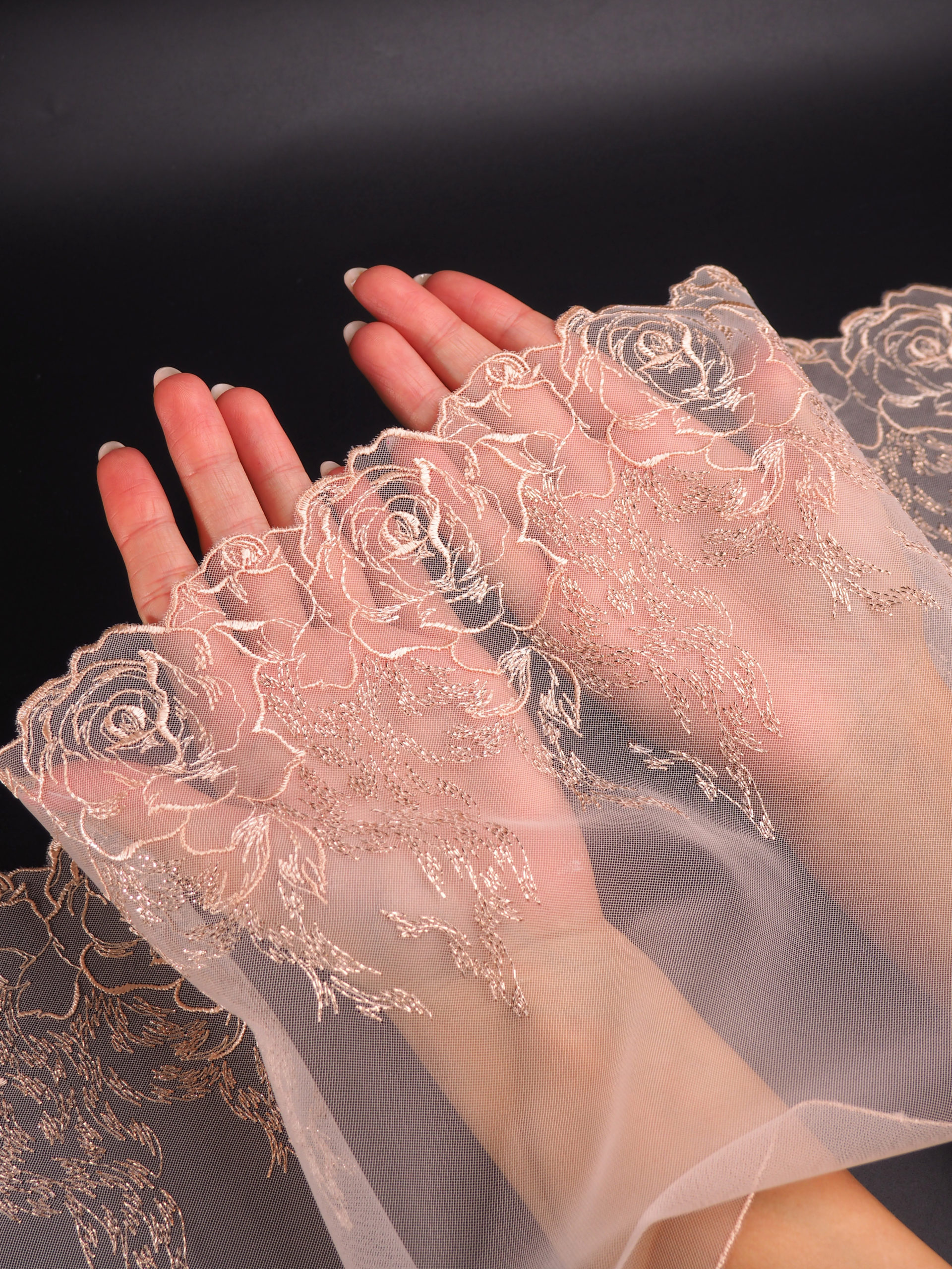 Вышивка на сетке неэластичная бежевого цвета с люрексом в левую и правую сторону. Кружево на сетке пудрово-бежевое с люрексом.