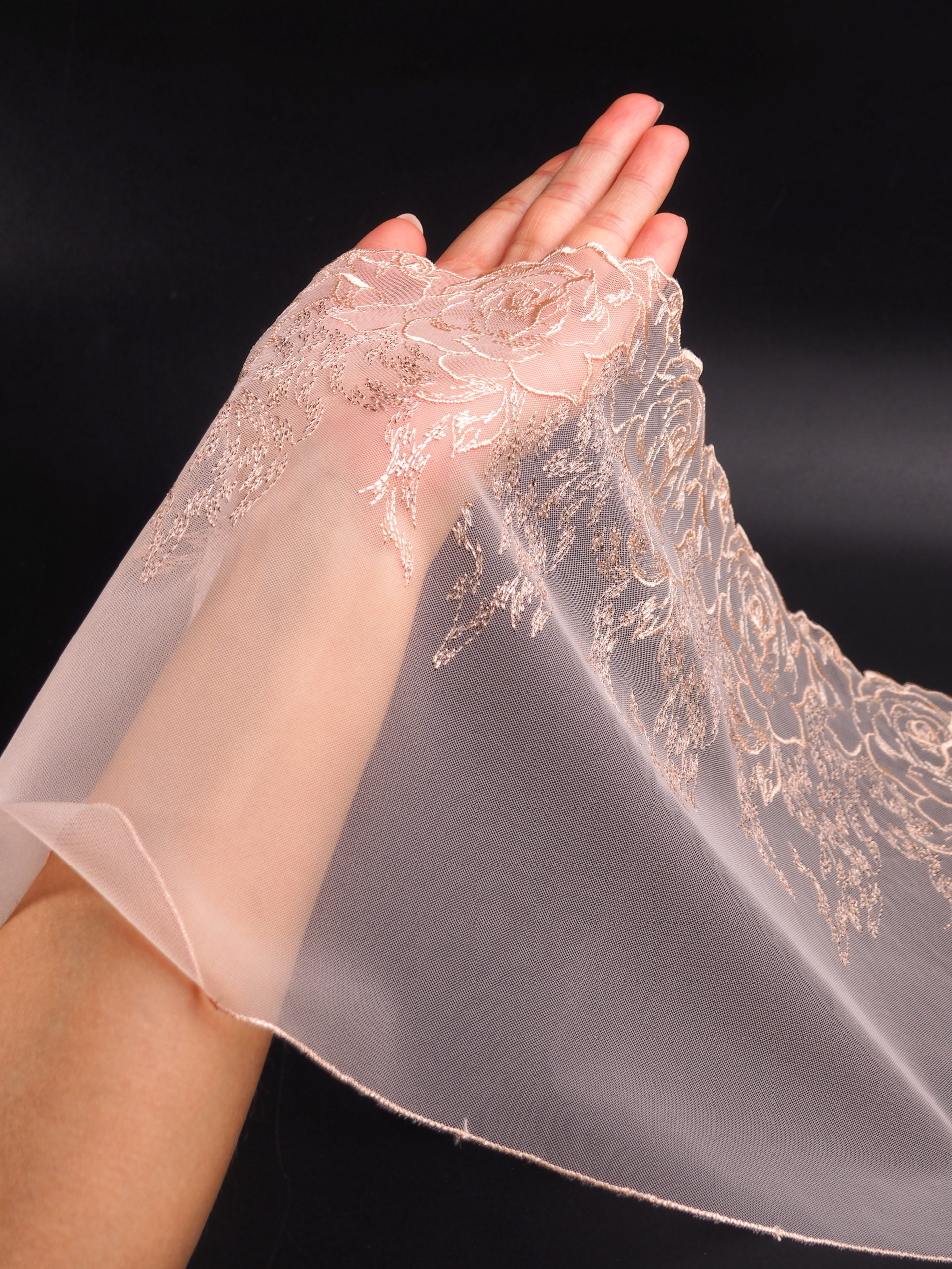 Вышивка на сетке пудрово-бежевая с с люрексом - удобная и красивая ткань для создания оригинального декора. Готовая основа с кружевными узорами и орнаментами - настоящая помощь рукодельницам. Вышивка на сетке великолепно держит форму, не осыпается по краям, отлично драпируется, отличается высокой прочностью на разрыв, весит очень мало, служит в течение многих лет. Используя кружево на сетке, вы легко создадите эффектное эксклюзивное изделие. Материал считается универсальным. Его можно использовать в пошиве нижнего белья, кофты, юбки, блузки, вечернего и свадебного платья.