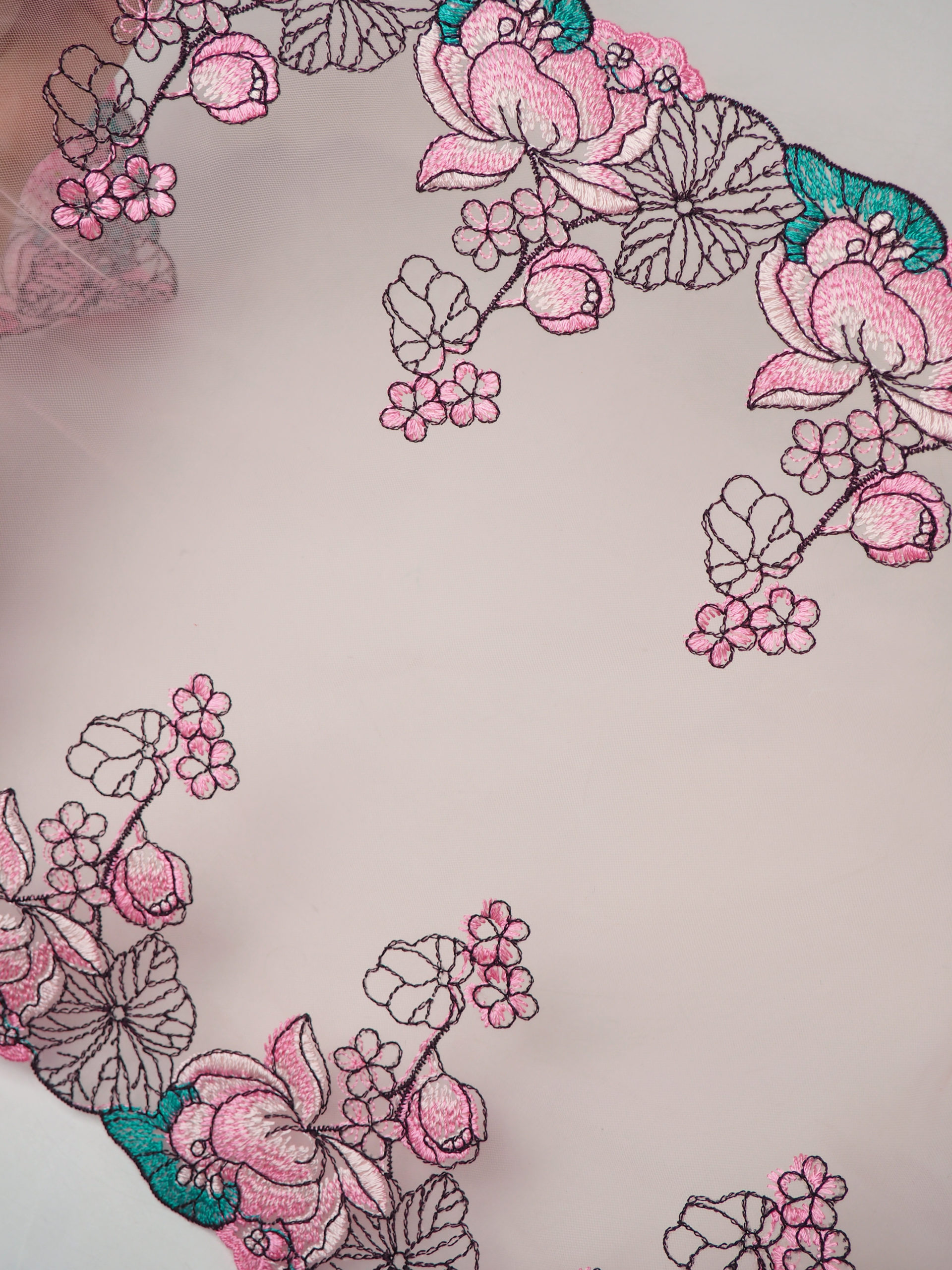 Кружево на сетке неэластичное с цветочным рисунком. Вышивка на сетке розовая с ментоловым и чёрным.