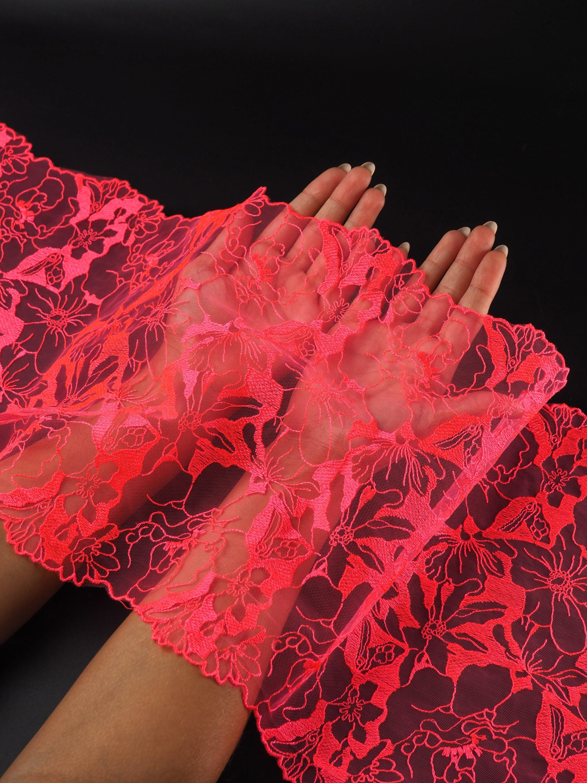 Кружево на сетке неэластичное красного оттенка с цветочным рисунком. Вышивка красно-розового цвета на красно-розовой сетке.