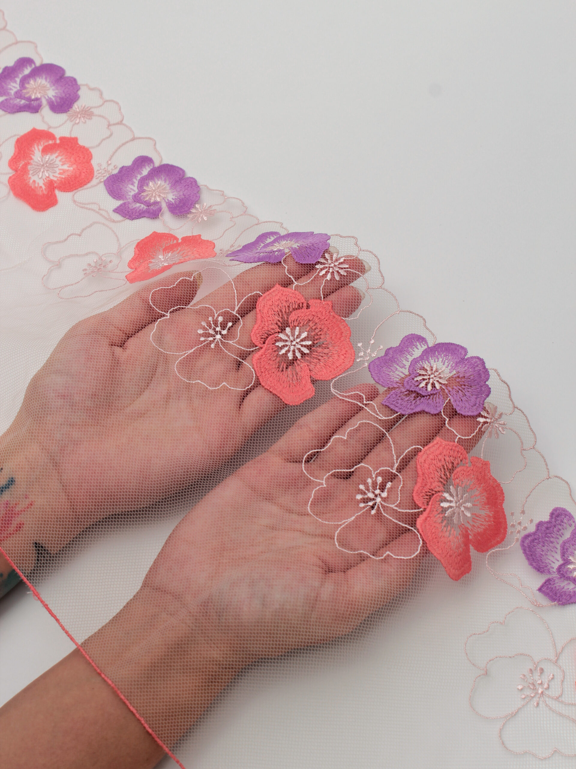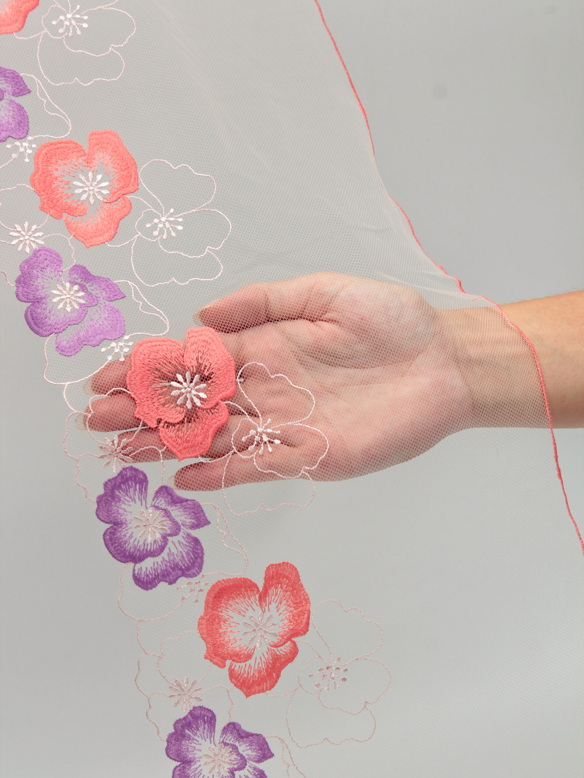 Кружево на сетке неэластичное серое с синим и голубым цветочным рисунком в правую и левую сторону. Вышивка двусторонняя синего и голубого цвета на светло-серой сетке.