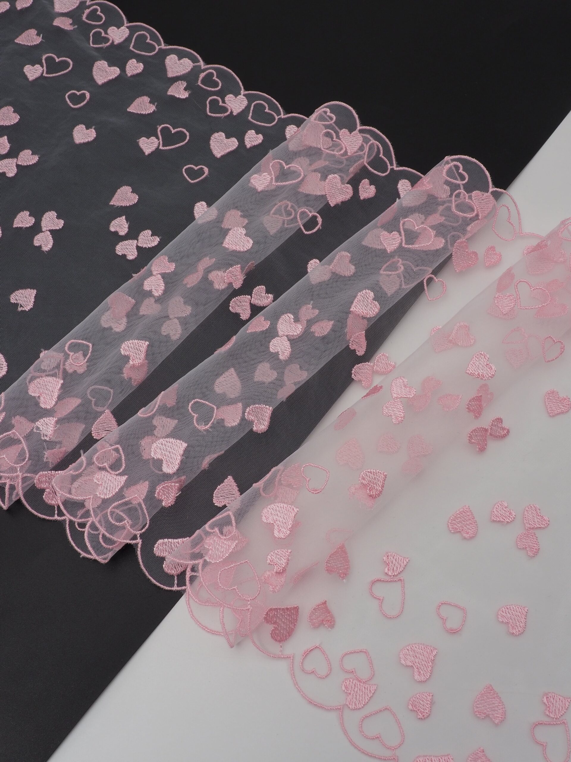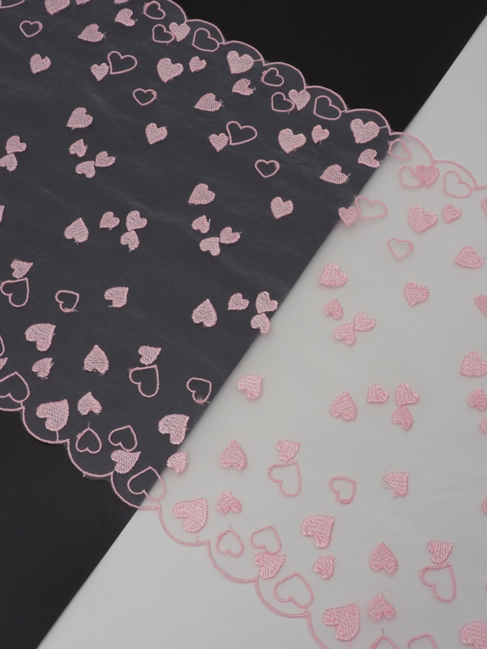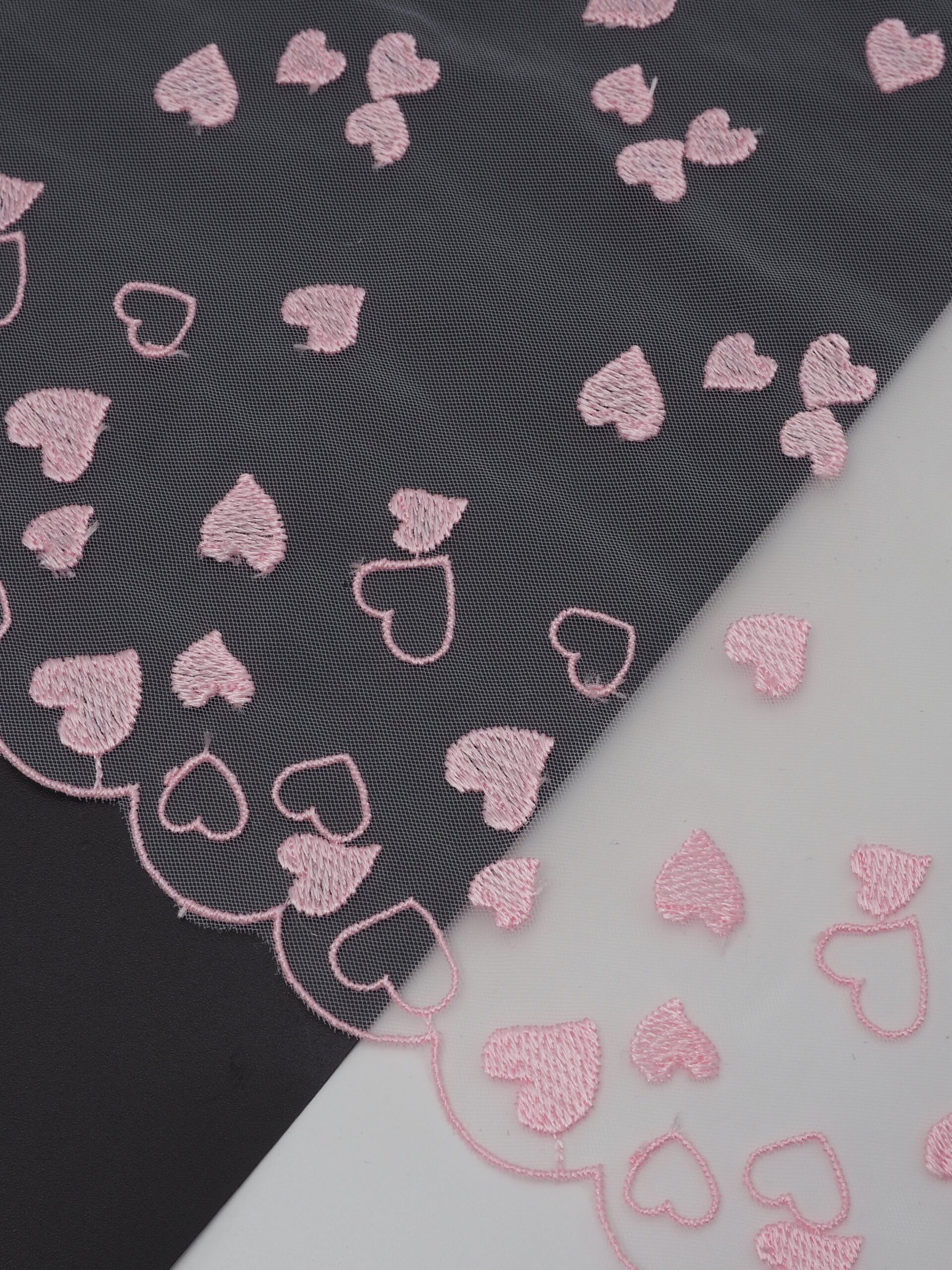 Кружево на сетке неэластичное кремового оттенка с розовой вышивкой в виде сердец. Вышивка нежно-розового цвета на сетке оттенка шампани.