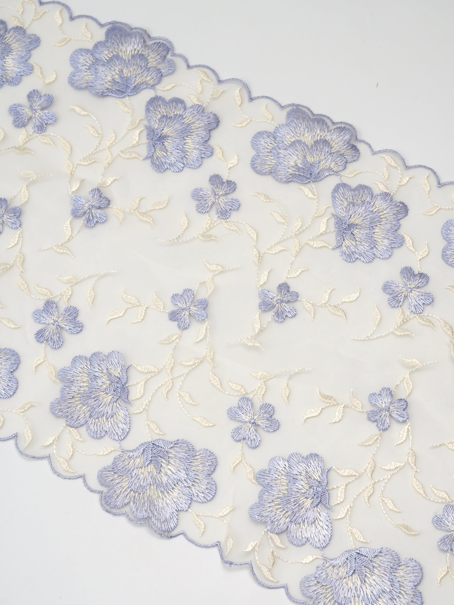 Кружево на сетке неэластичное кремового оттенка с цветочным рисунком. РИСУНОК НЕ ЗЕРКАЛЬНЫЙ. Вышивка фиолетового цвета на кремовой сетке.