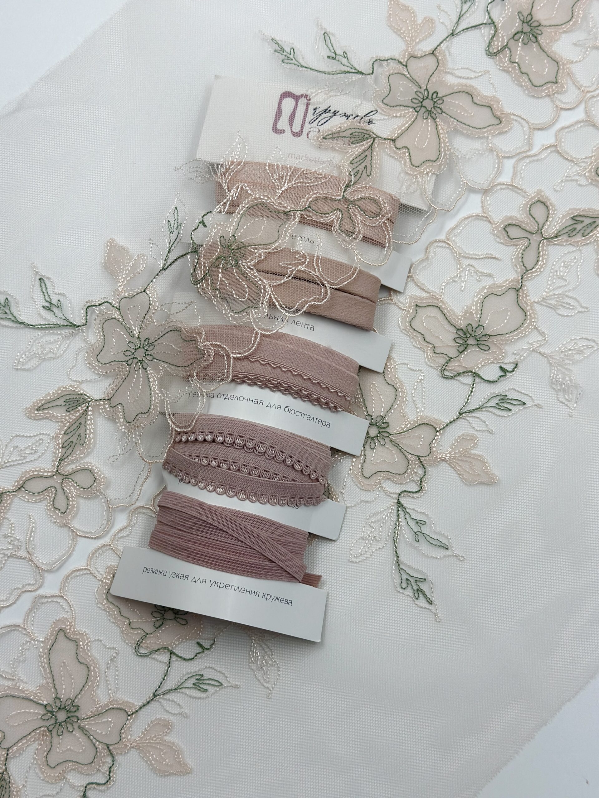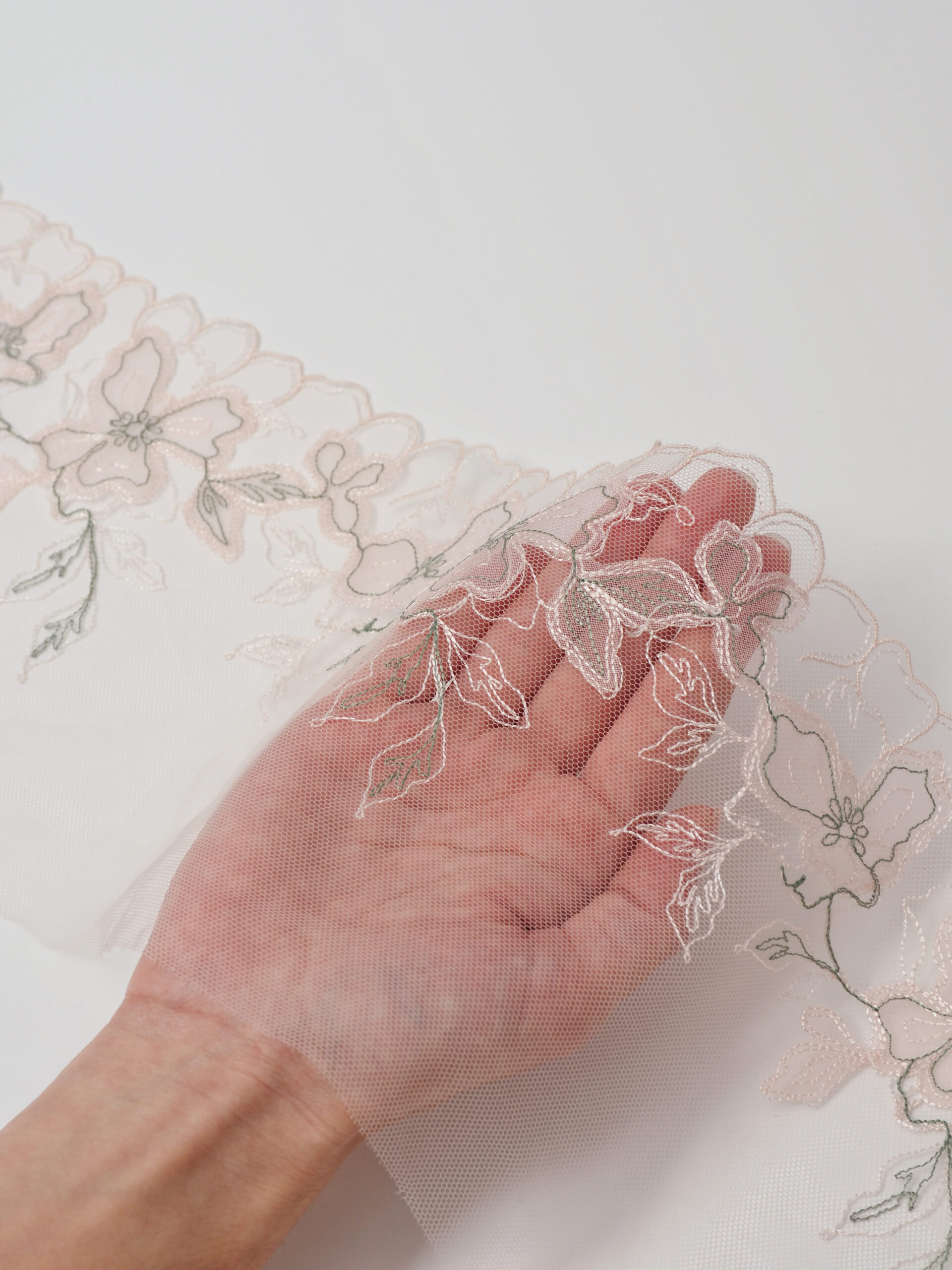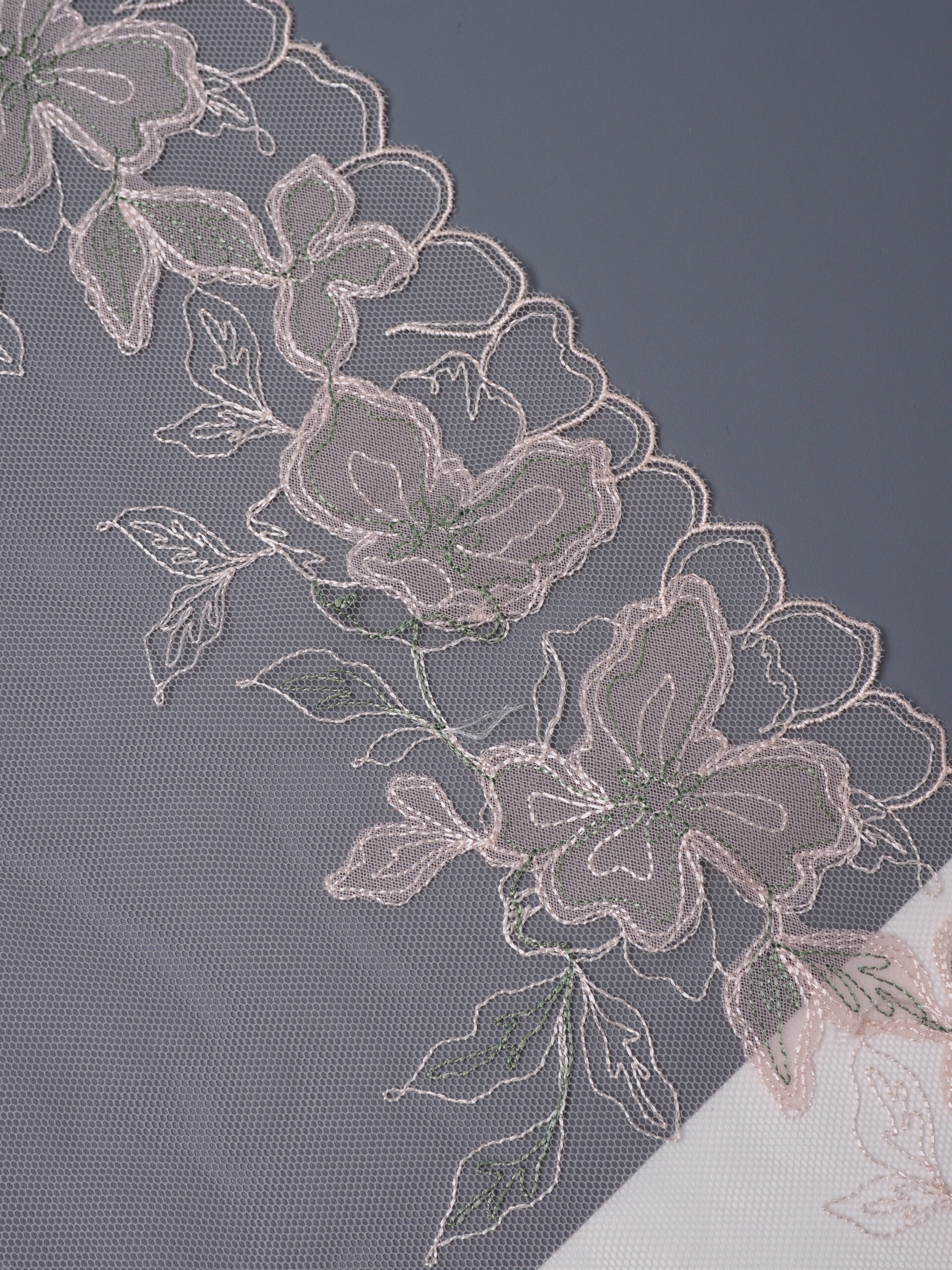 Кружево на сетке неэластичное с зеленым и розовым рисунком в левую и правую сторону. Вышивка зеленая на светлопудровой сетке.