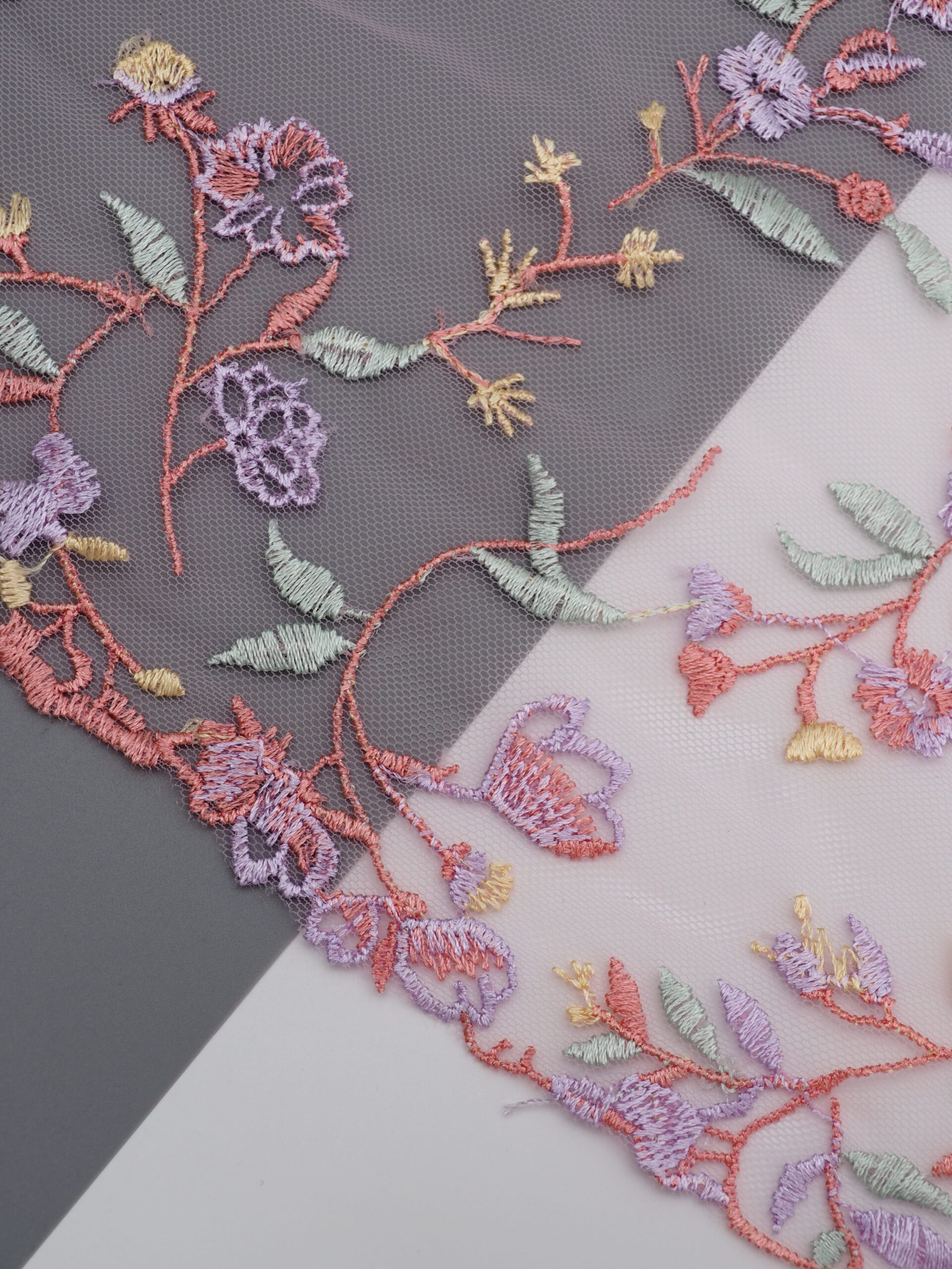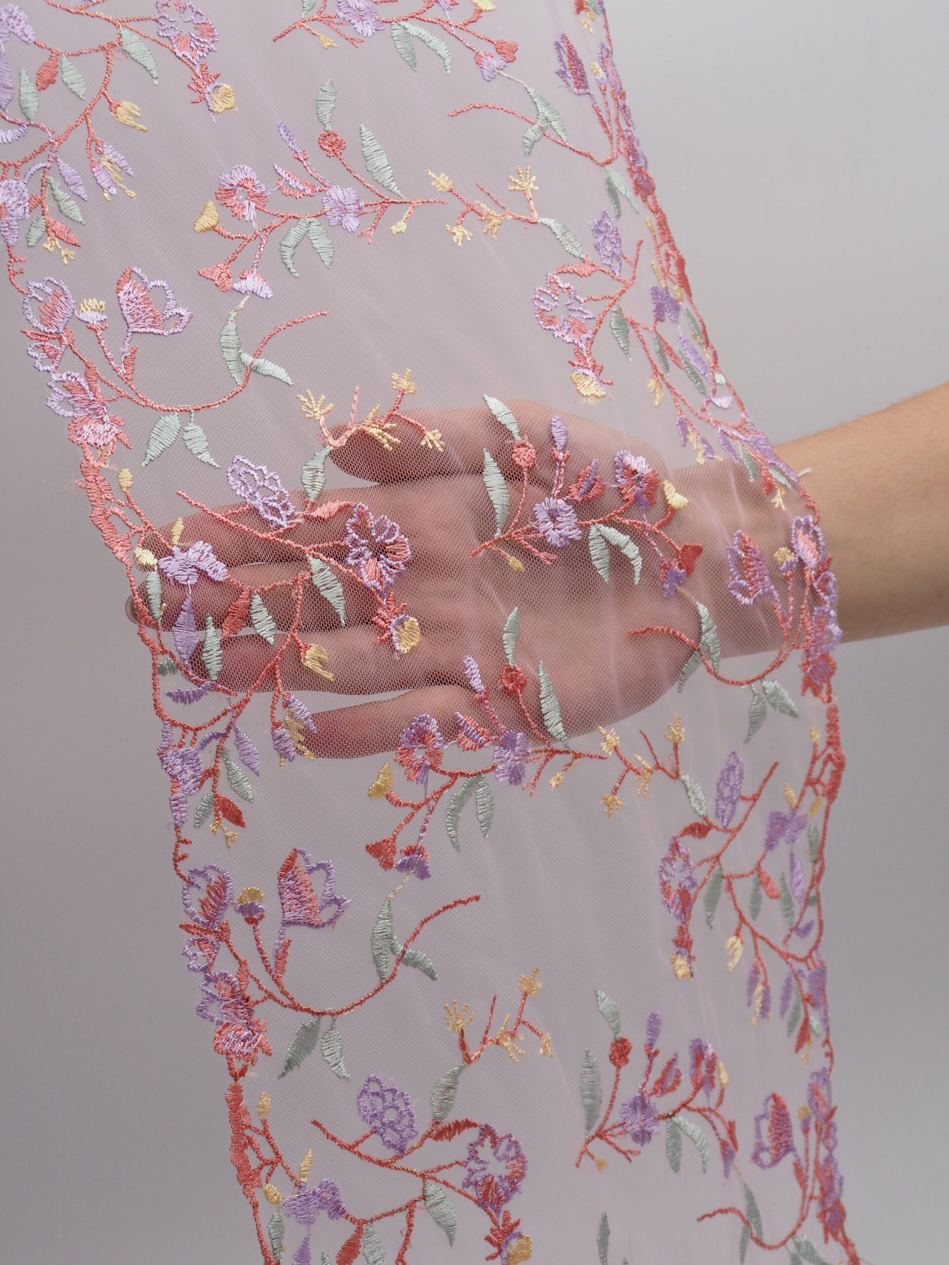 Вышивка на сетке светло-розовая с мультиколор - удобная и красивая ткань для создания оригинального декора. Готовая основа с кружевными узорами и орнаментами - настоящая помощь рукодельницам. Вышивка на сетке великолепно держит форму, не осыпается по краям, отлично драпируется, отличается высокой прочностью на разрыв, весит очень мало, служит в течение многих лет. Используя кружево на сетке, вы легко создадите эффектное эксклюзивное изделие. Материал считается универсальным. Его можно использовать в пошиве нижнего белья, кофты, юбки, блузки, вечернего и свадебного платья.