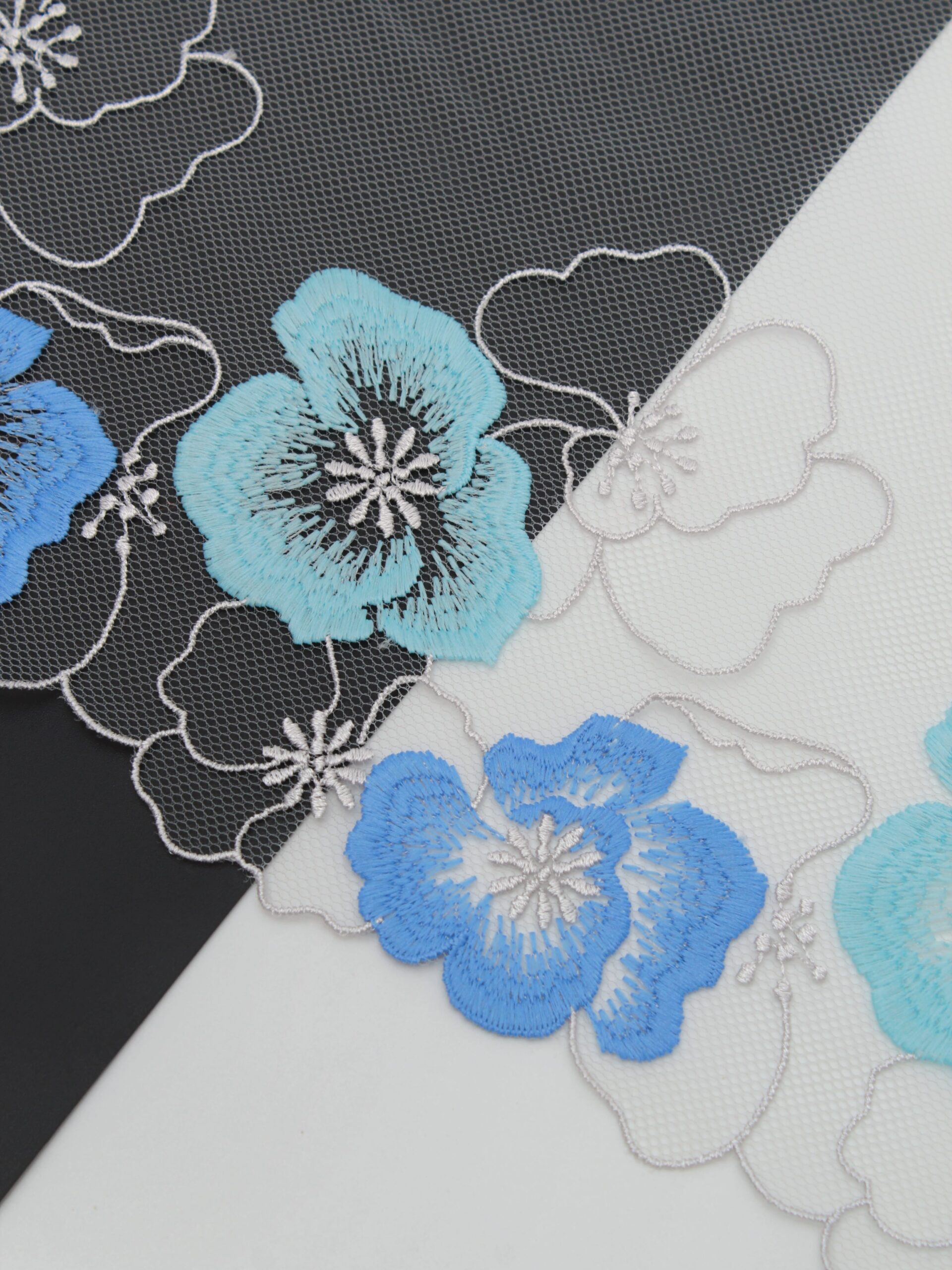 Кружево на сетке неэластичное серое с синим и голубым цветочным рисунком в правую и левую сторону. Вышивка двусторонняя синего и голубого цвета на светло-серой сетке.