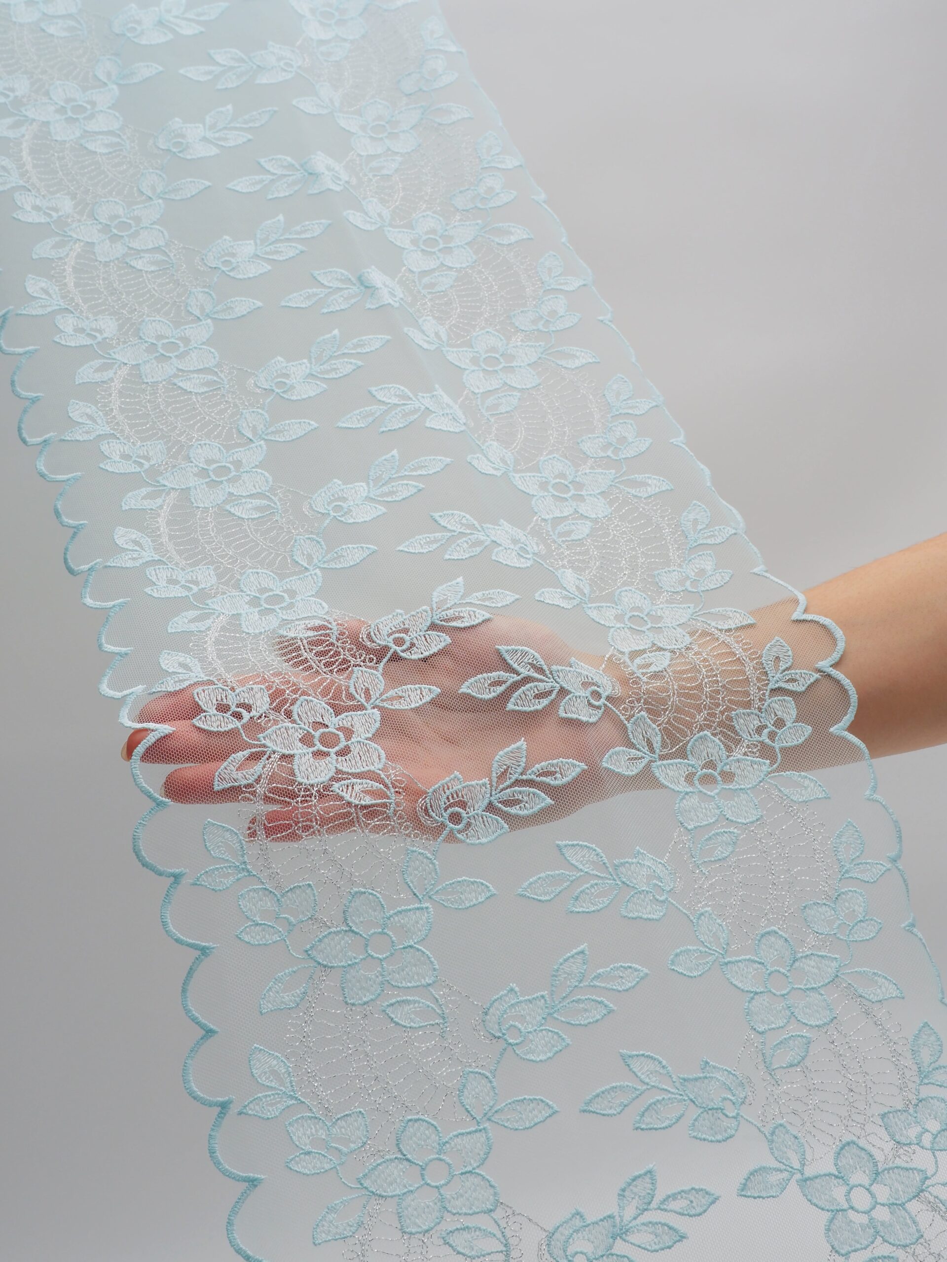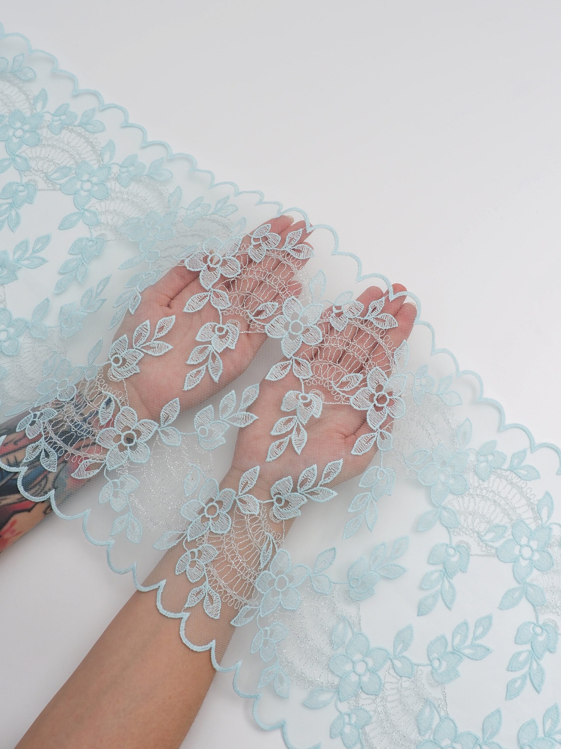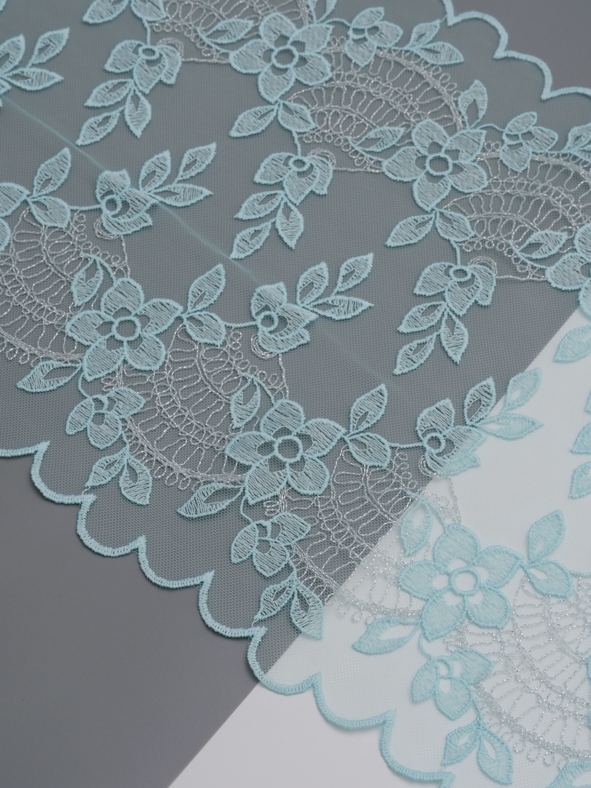Кружево на сетке неэластичное голубого цвета с цветочной вышивкой и узором серебристого цвета. Вышивка на сетке светлый тиффани с серебристым люрексом.