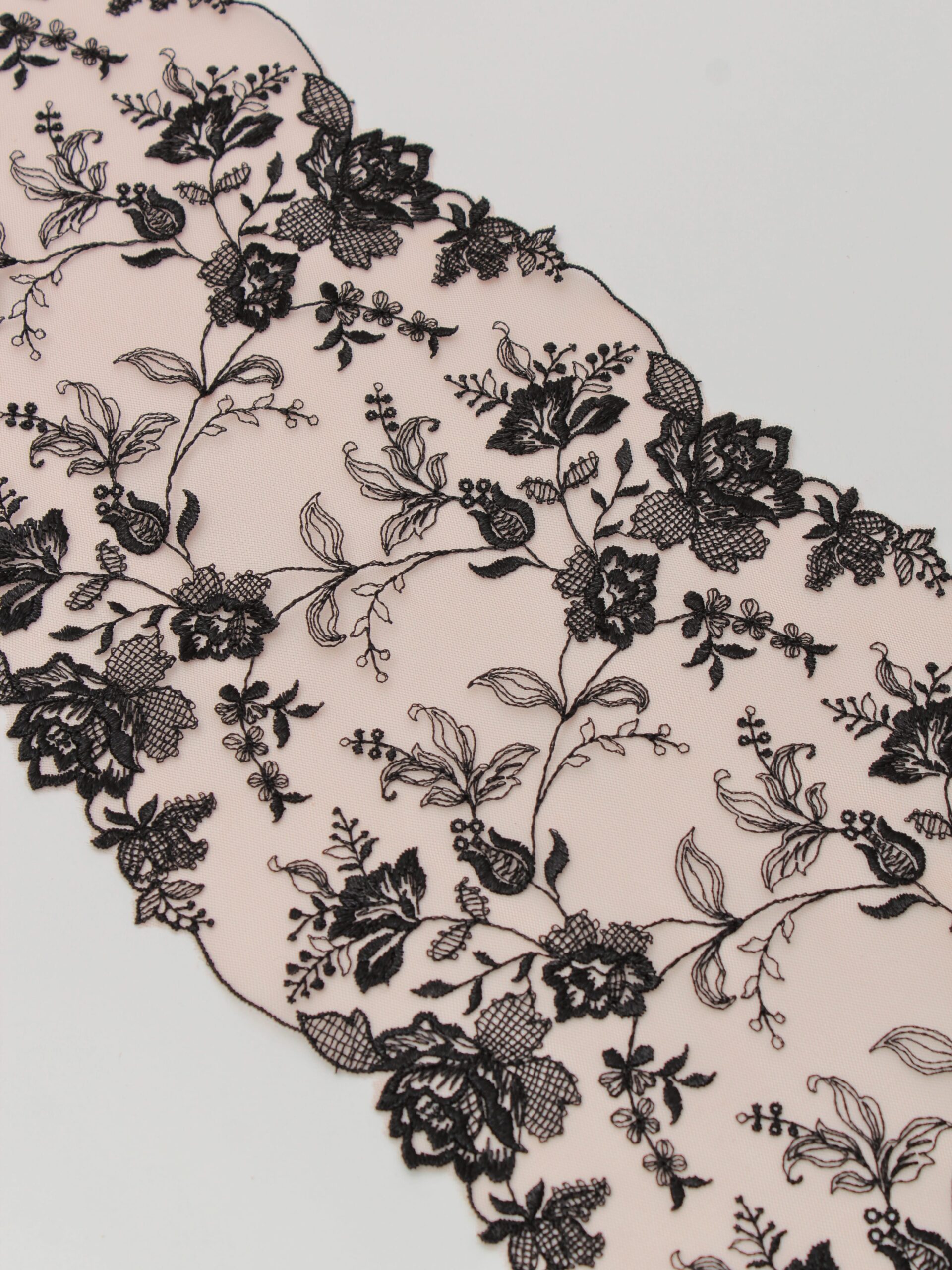Кружево на сетке неэластичное бежевого оттенка с черным цветочным рисунком. Вышивка черного цвета на телесной сетке.