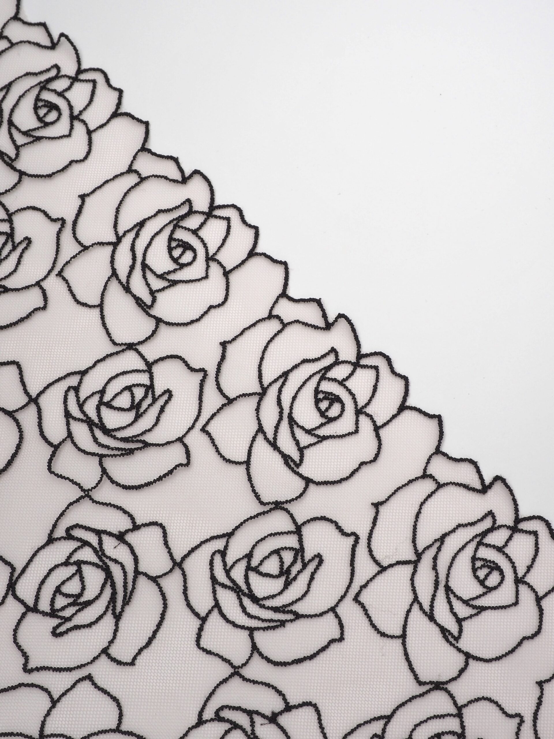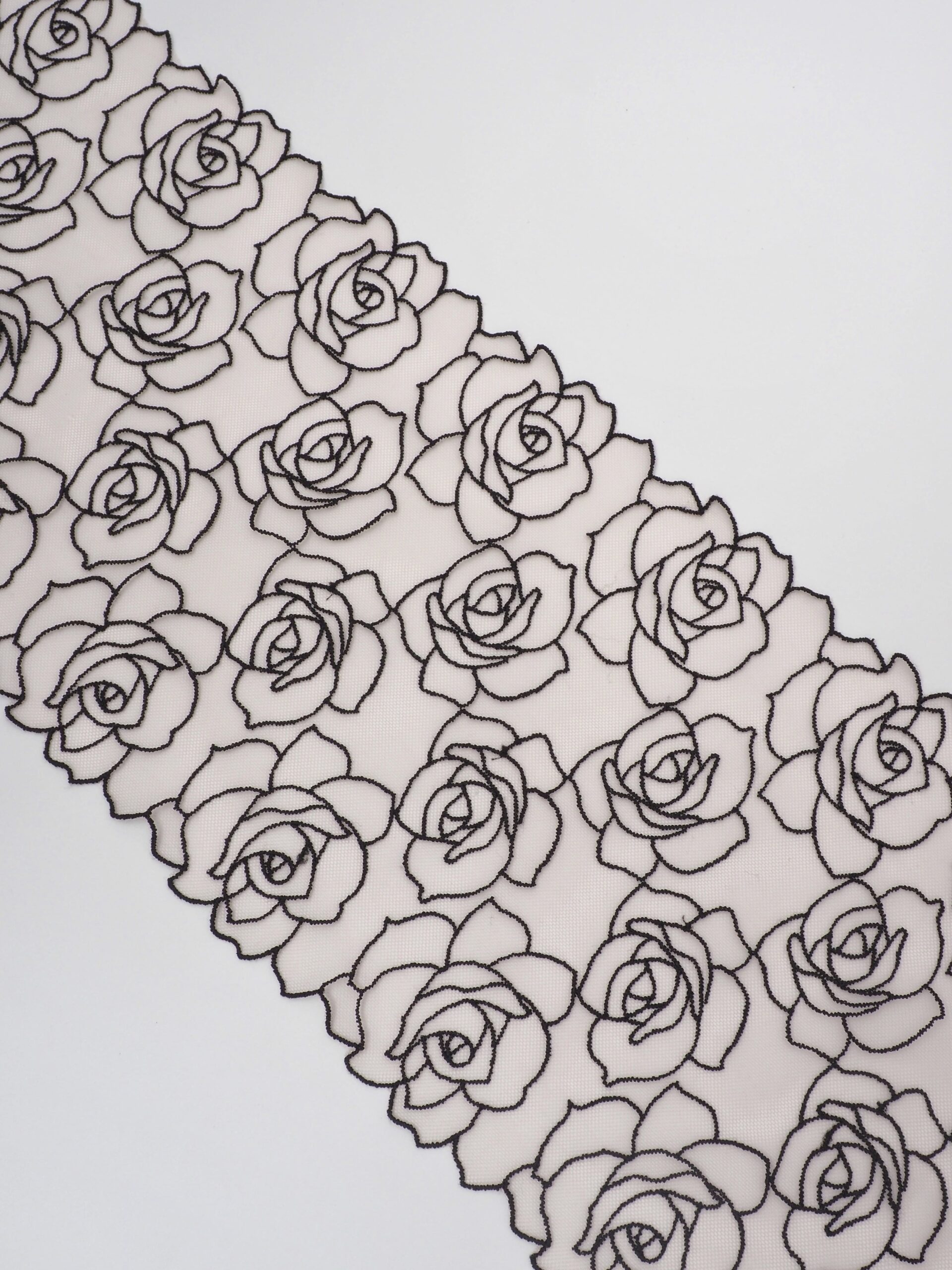 Кружево на сетке неэластичное бежевого оттенка с черным цветочным рисунком в виде роз. Вышивка черного цвета на телесной сетке.