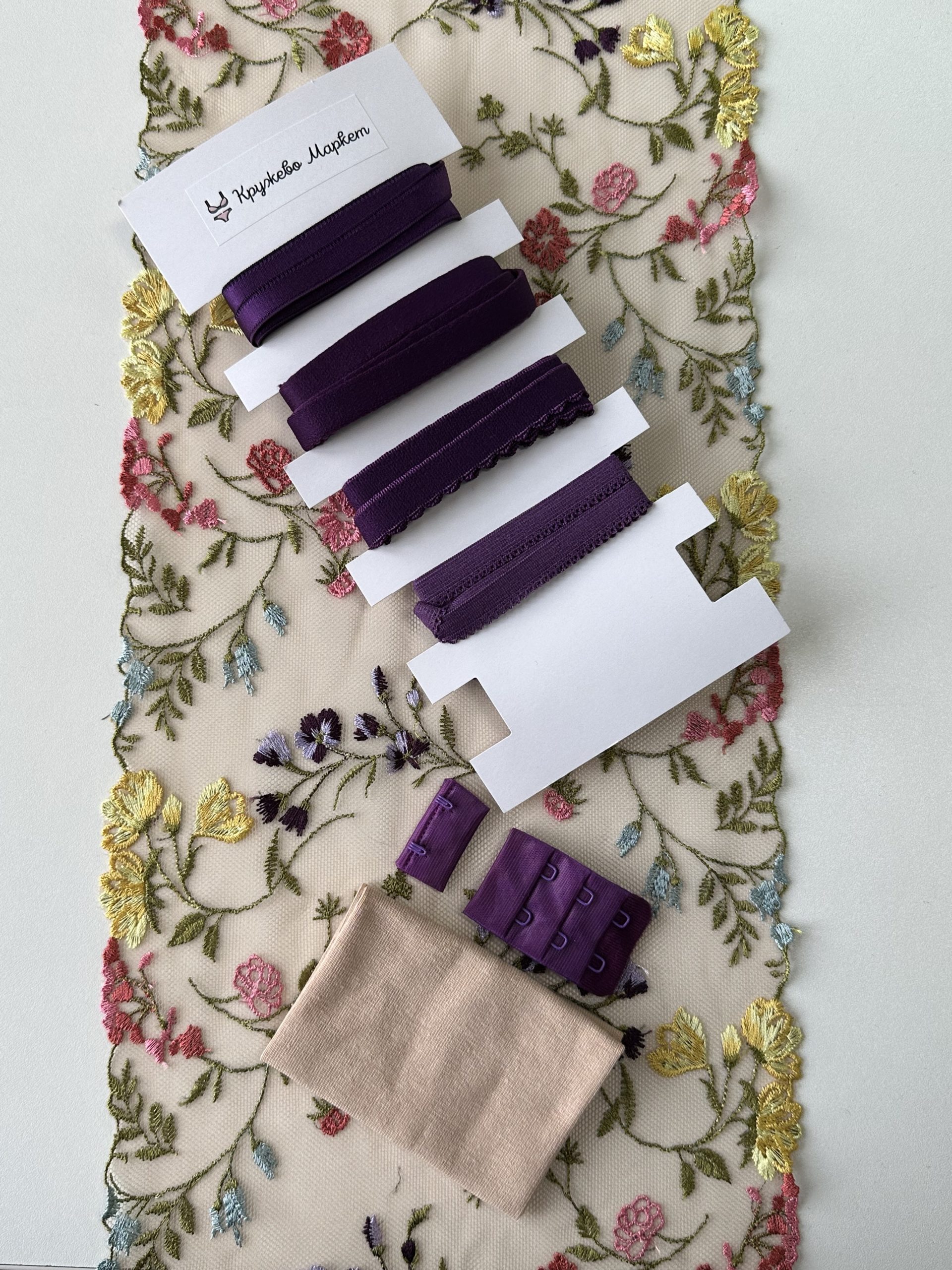 Кружево на сетке неэластичное с цветочным рисунком в левую и правую сторону. Вышивка цвета мультиколор (многоцвет) на сетке телесного цвета.