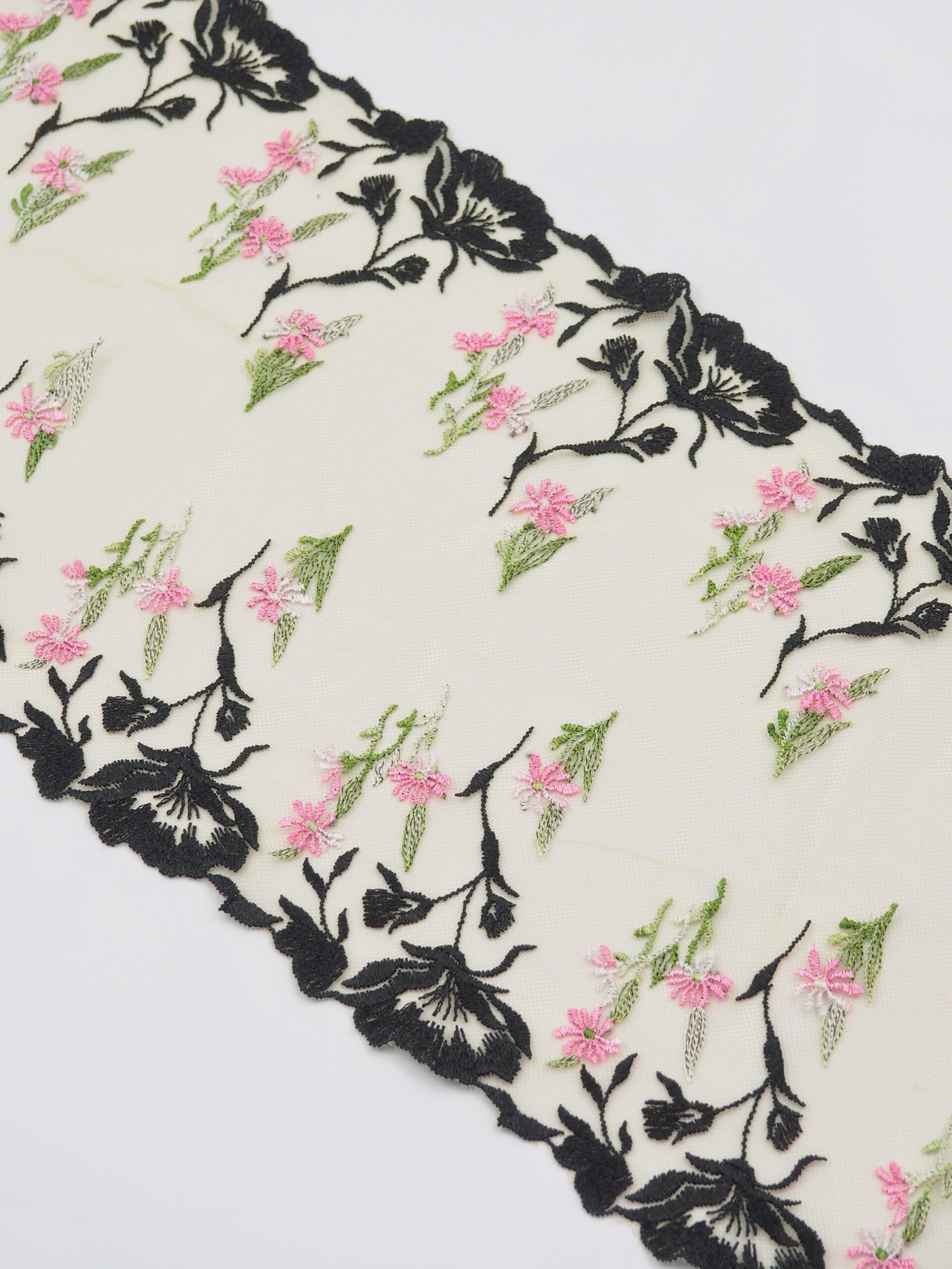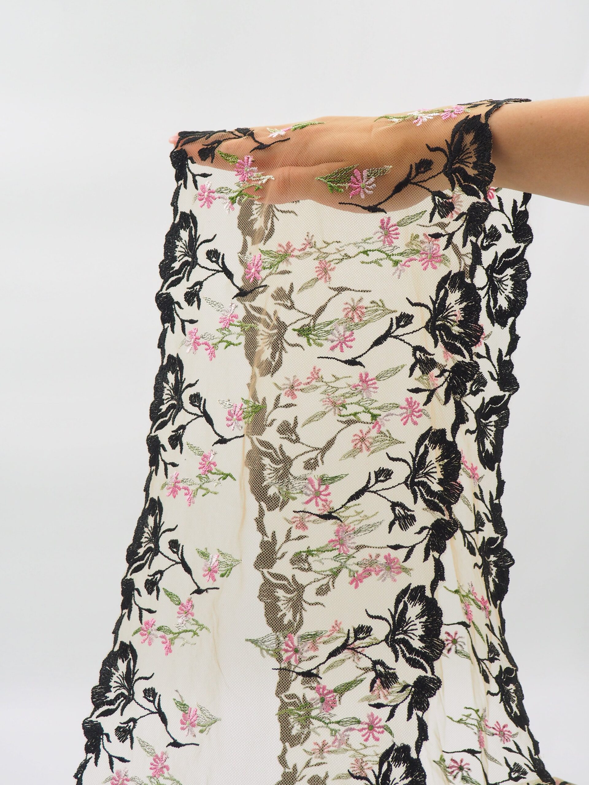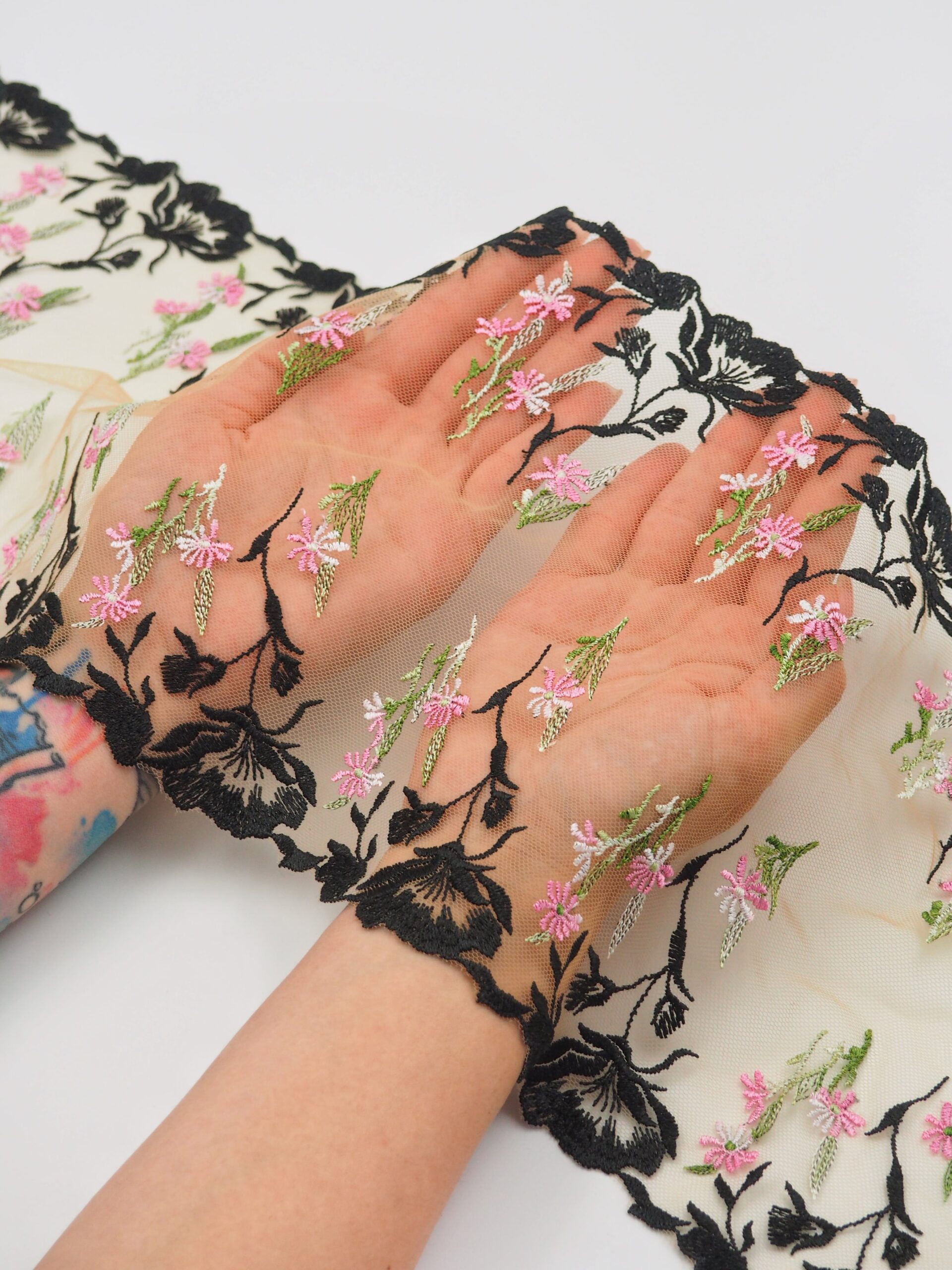Кружево на сетке неэластичное бежевого оттенка с черным цветочным рисунком. Вышивка на телесной сетке с разноцветными цветами.