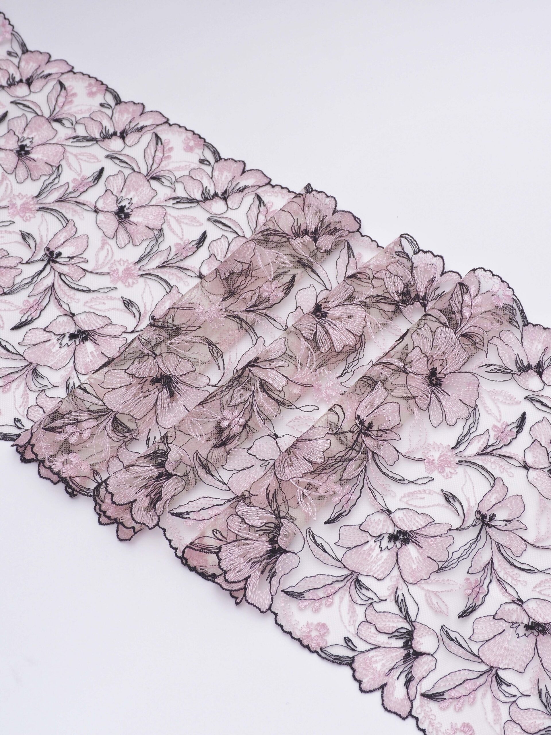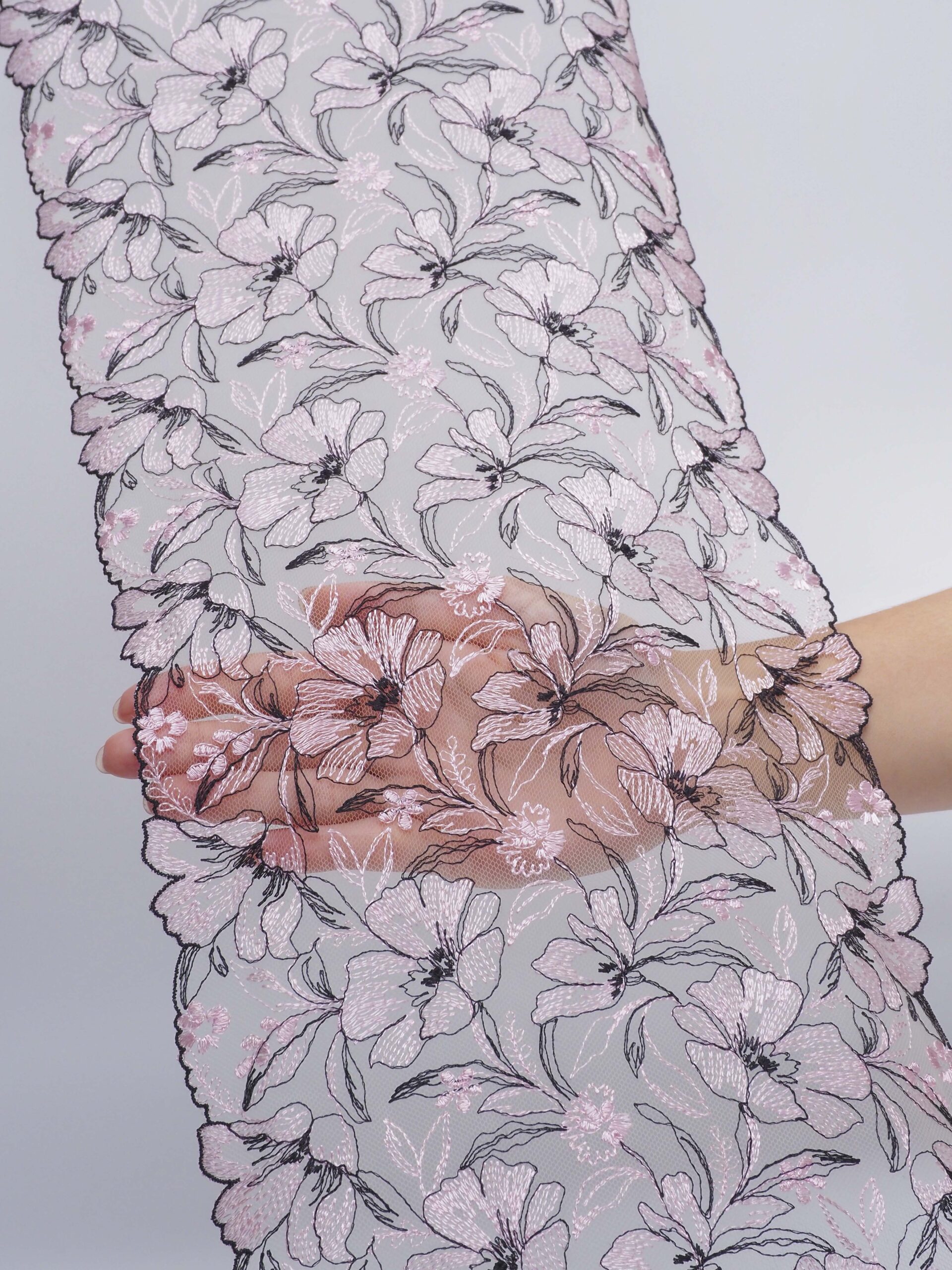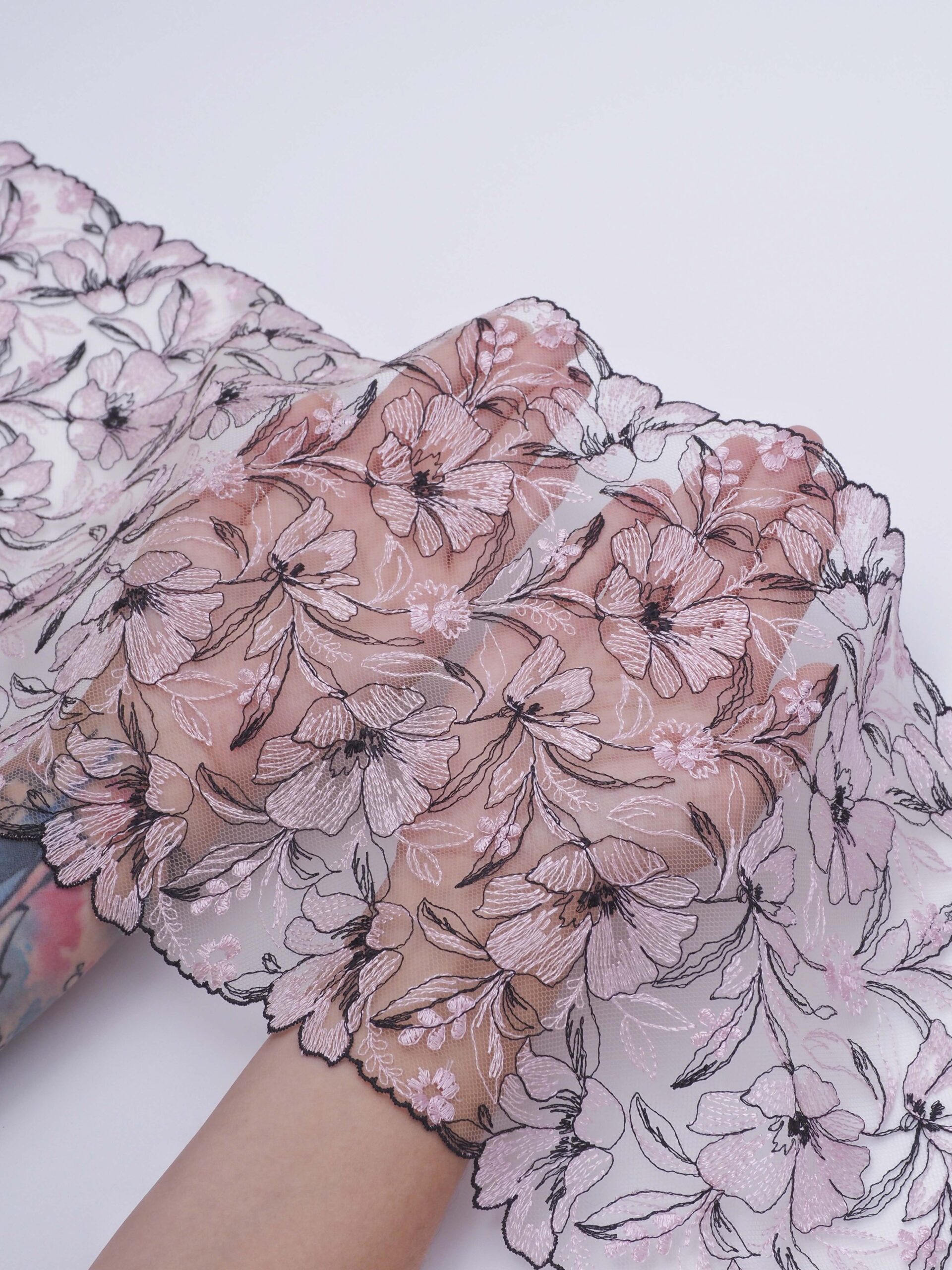 Вышивка на сетке телесная с нежно-розовым и черным - удобная и красивая ткань для создания оригинального декора. Готовая основа с кружевными узорами и орнаментами - настоящая помощь рукодельницам. Вышивка на сетке великолепно держит форму, не осыпается по краям, отлично драпируется, отличается высокой прочностью на разрыв, весит очень мало, служит в течение многих лет. Используя кружево на сетке, вы легко создадите эффектное эксклюзивное изделие. Материал считается универсальным. Его можно использовать в пошиве нижнего белья, кофты, юбки, блузки, вечернего и свадебного платья.