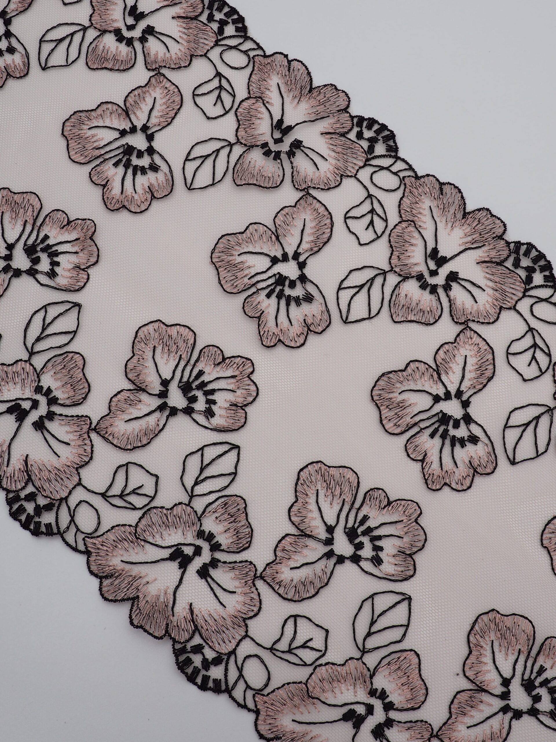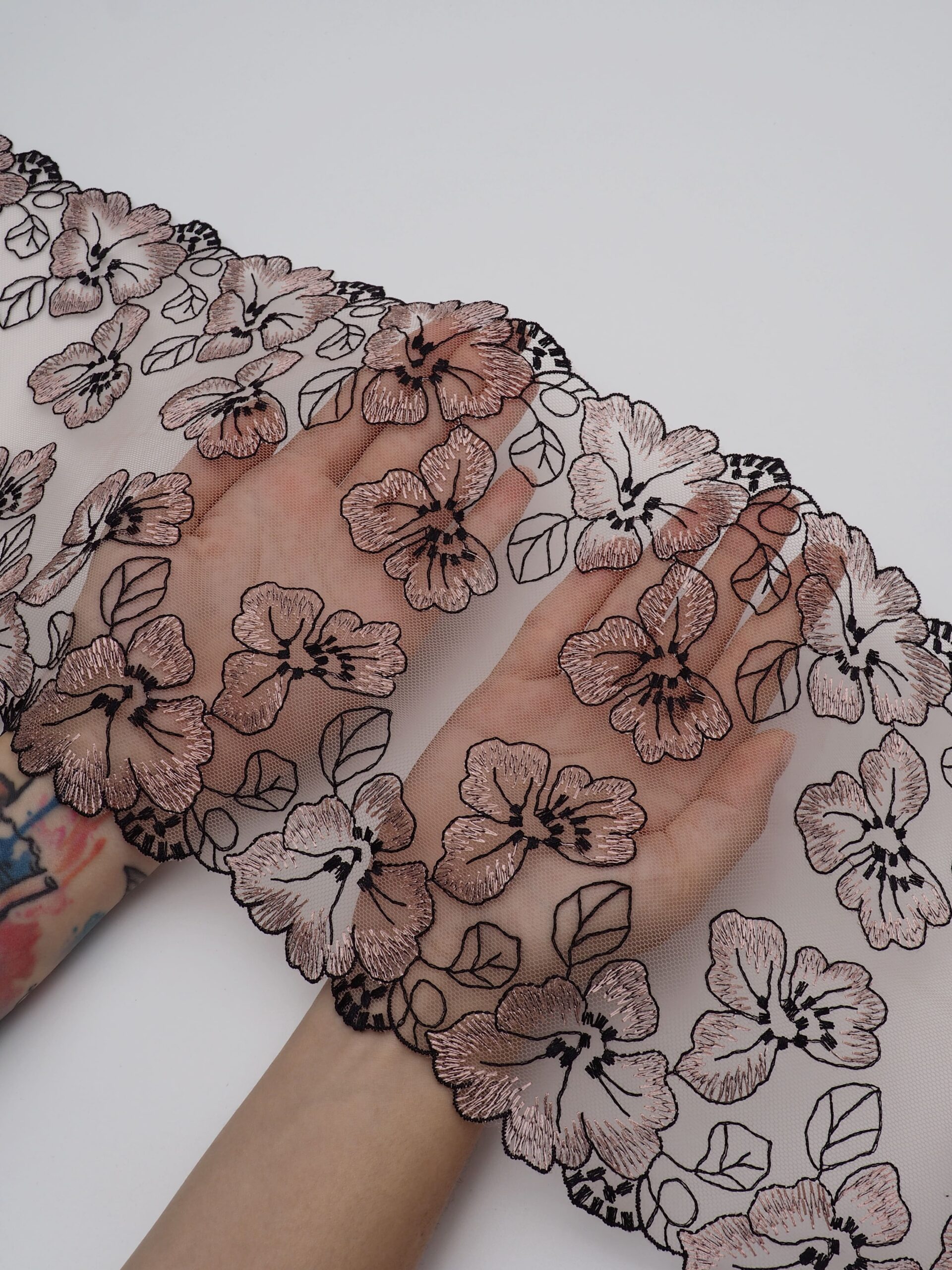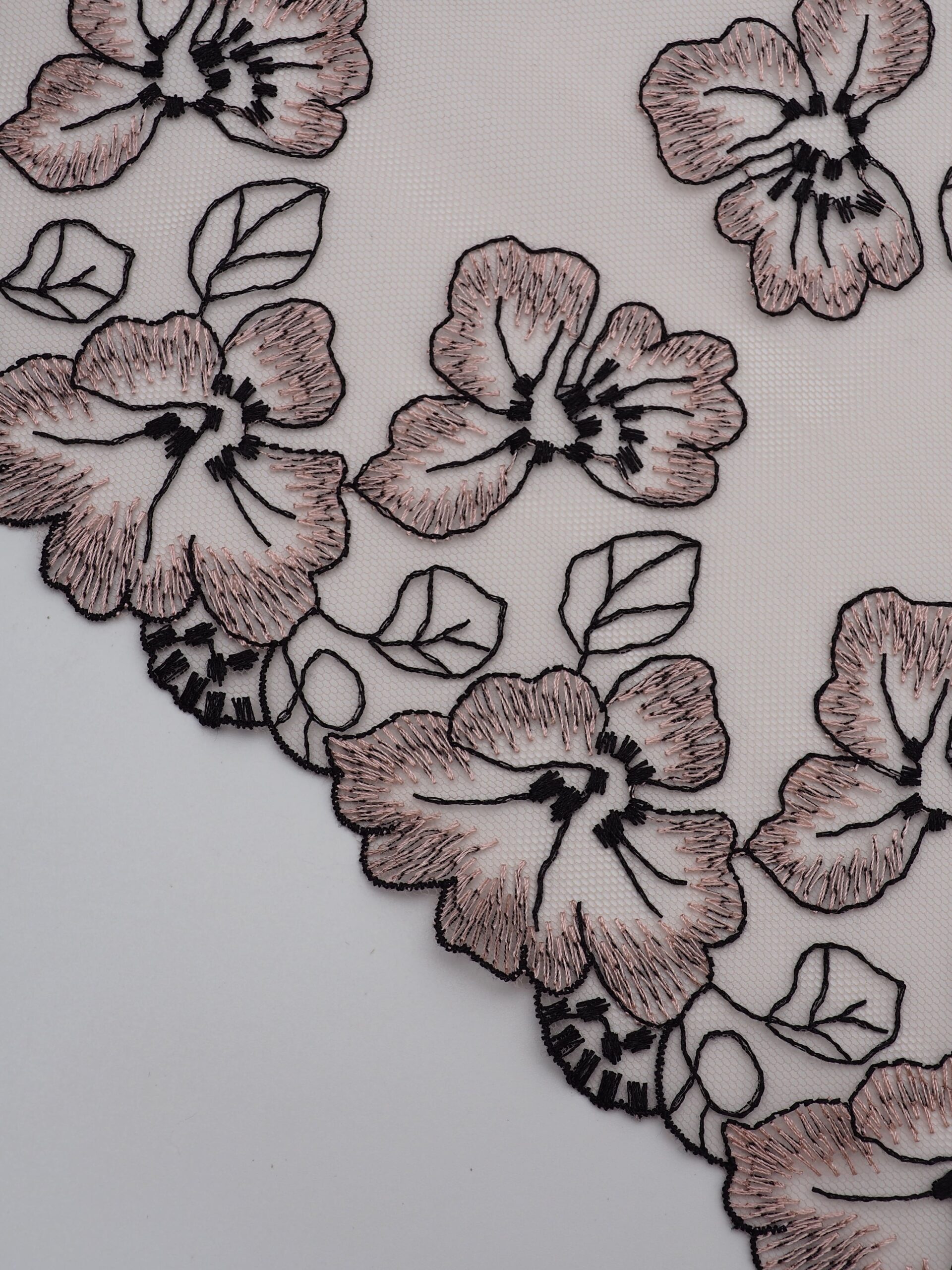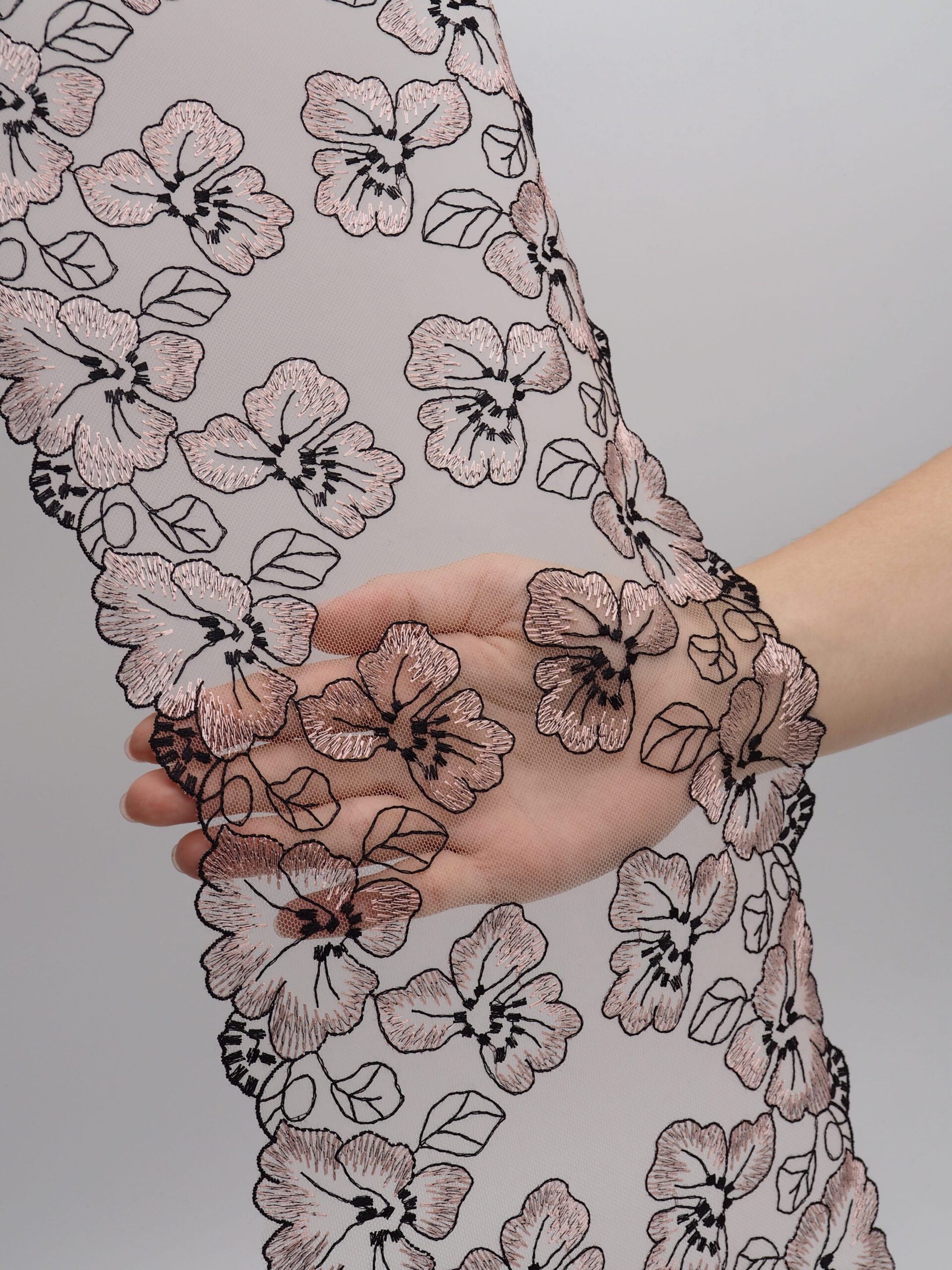 Двухстороннее кружево с вышивкой на сетке сочетает эстетику и функциональность. Сочетание цвета с вышитым рисунком придаёт материалу особый шарм и универсальность.
