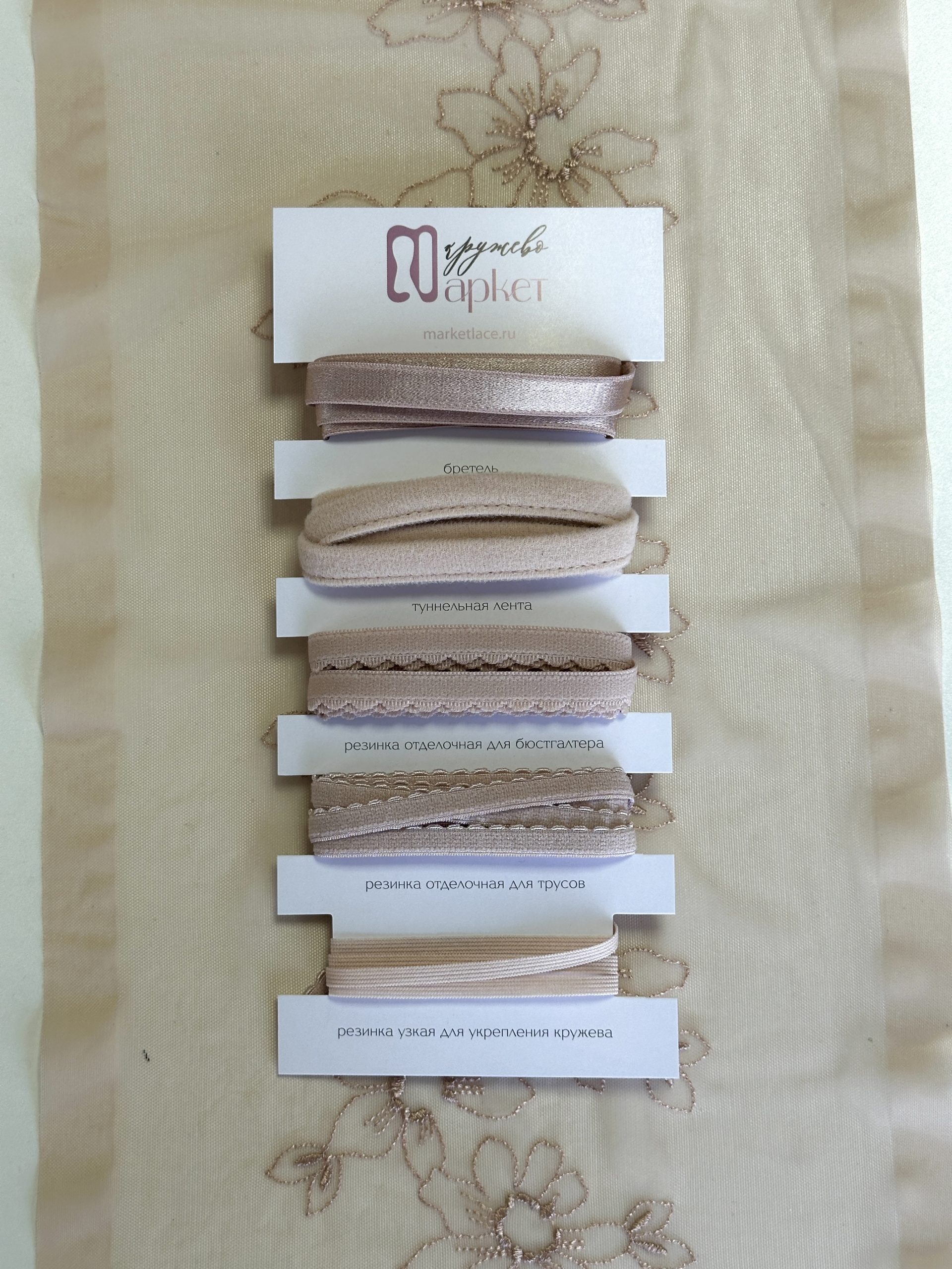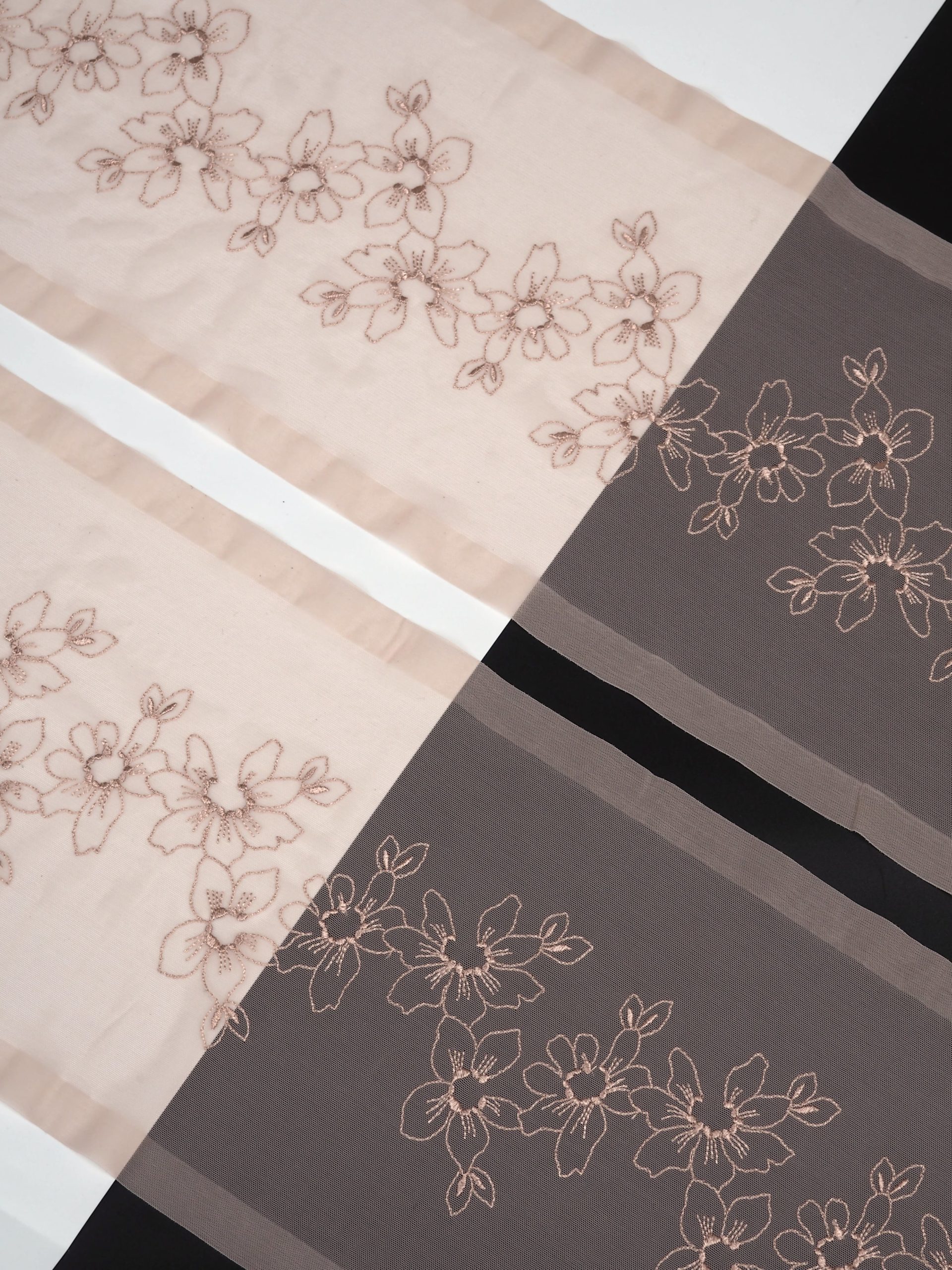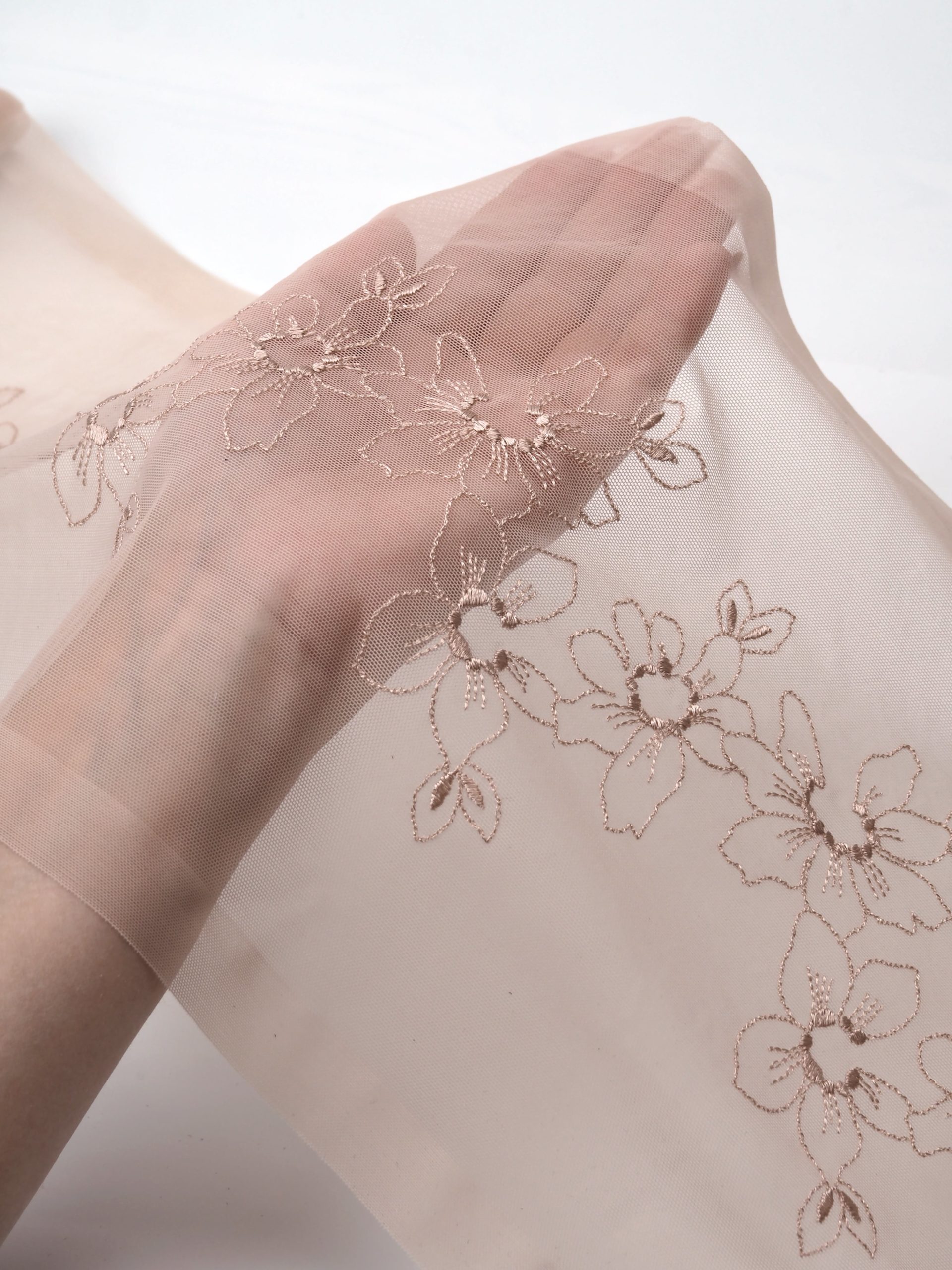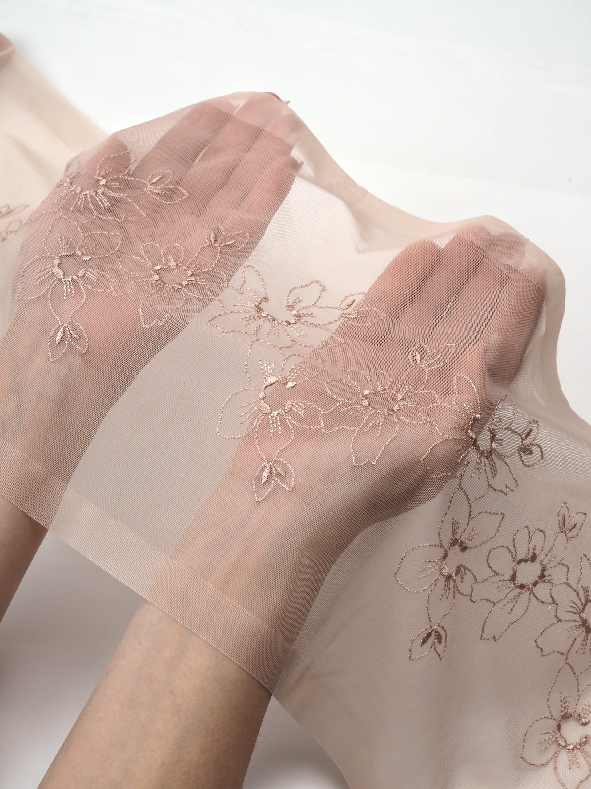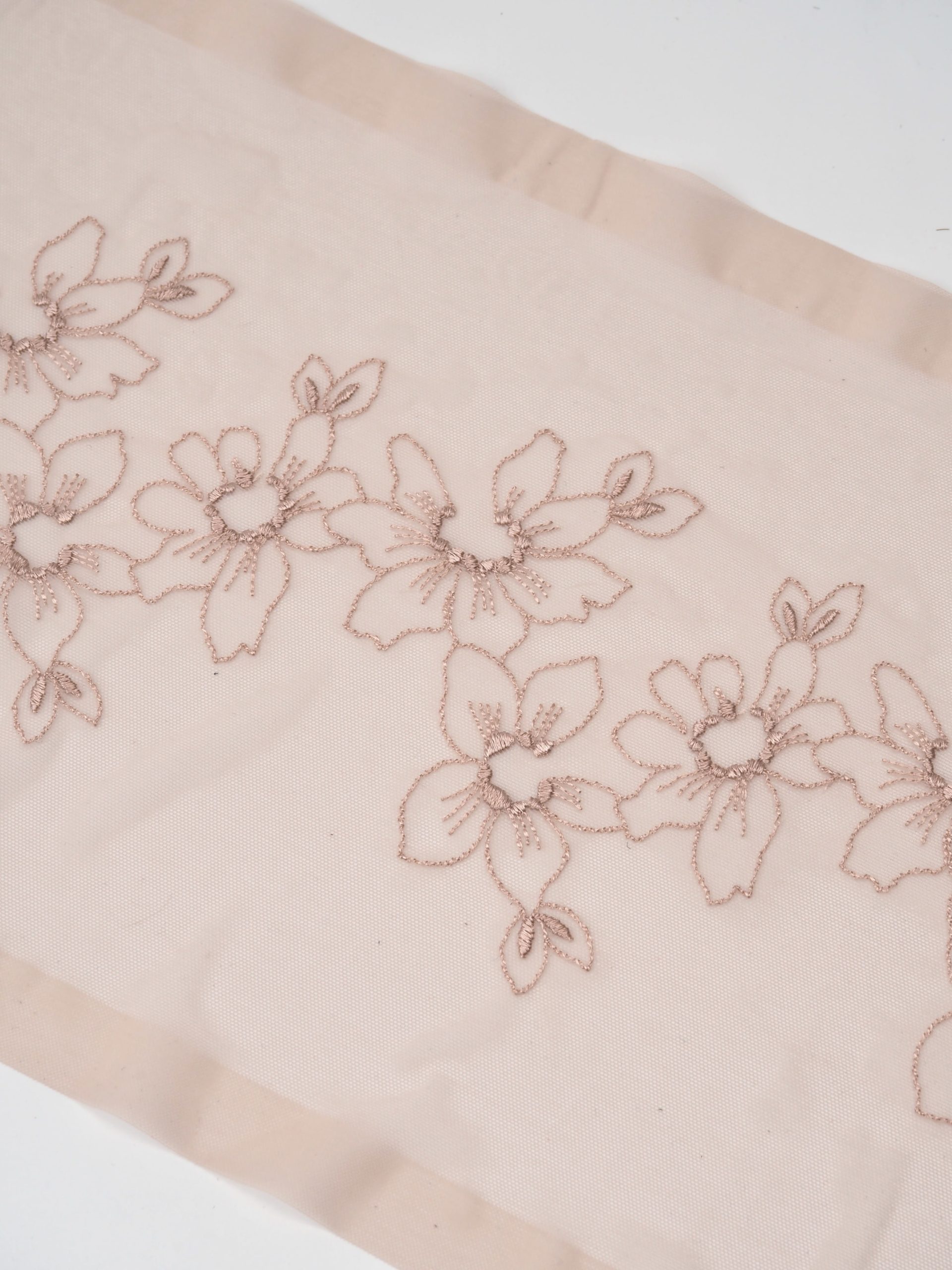 Кружево на сетке эластичное бежевого оттенка с цветочным рисунком в правую и левую сторону. Вышивка двусторонняя темно-бежевого цвета на темно-бежевой сетке.