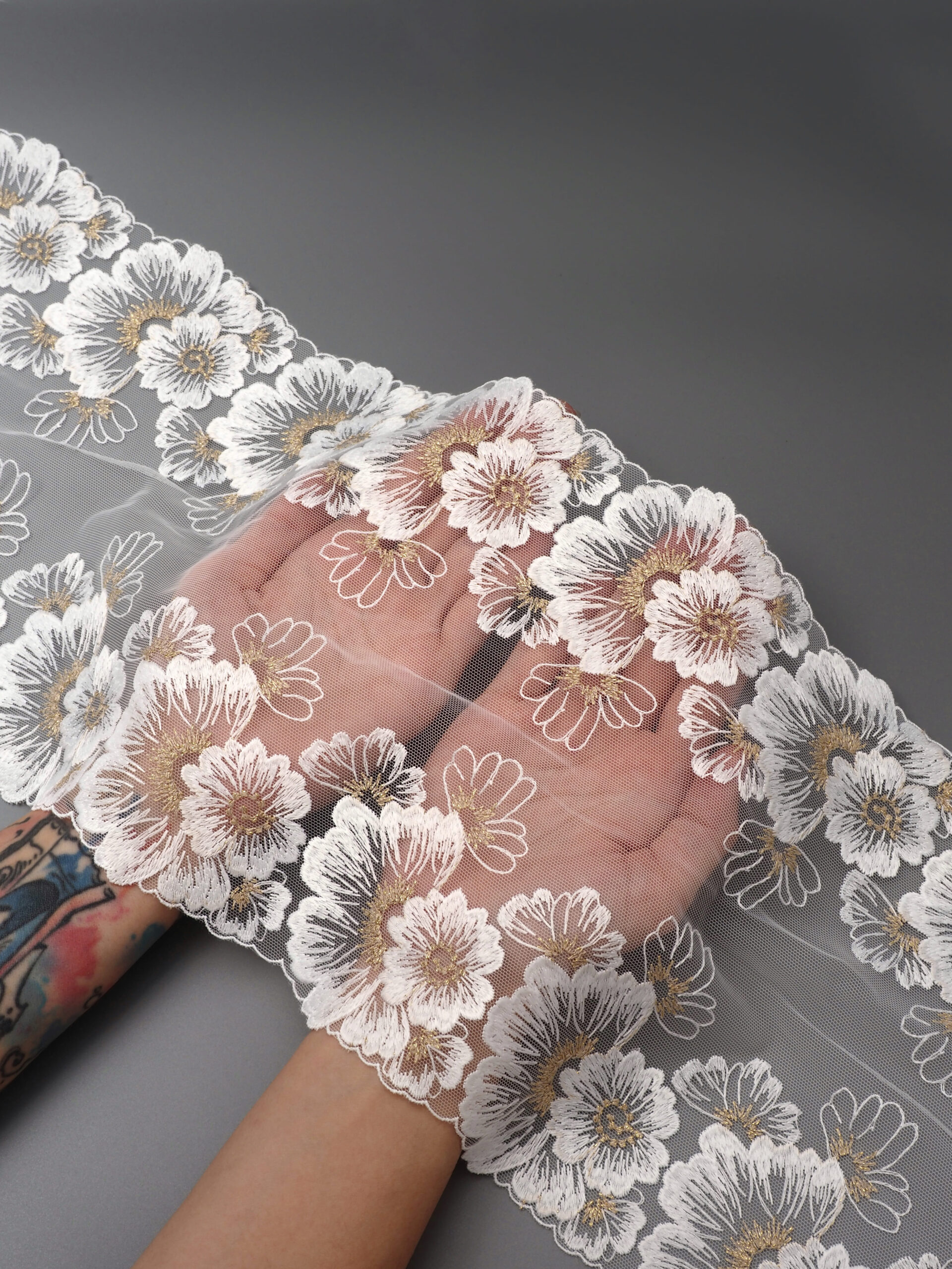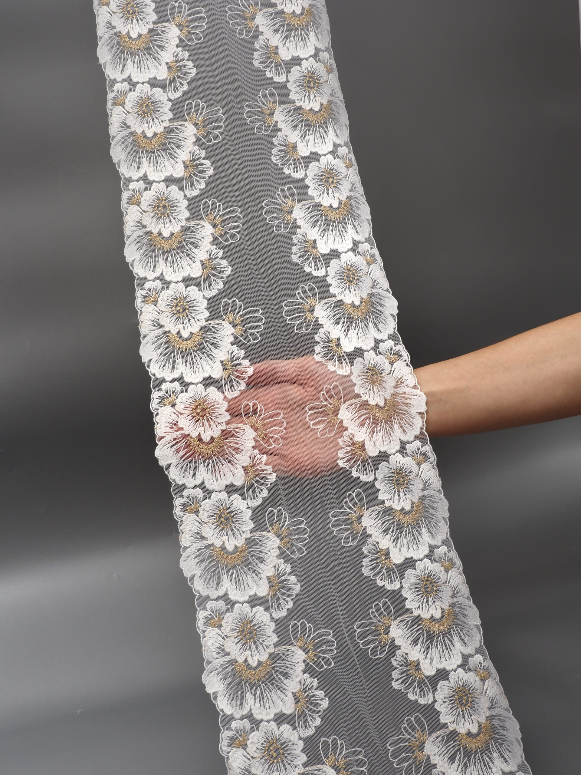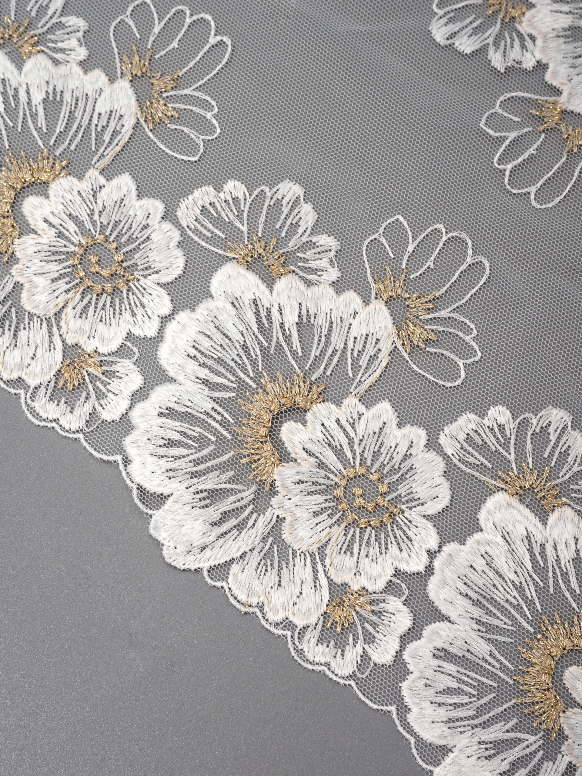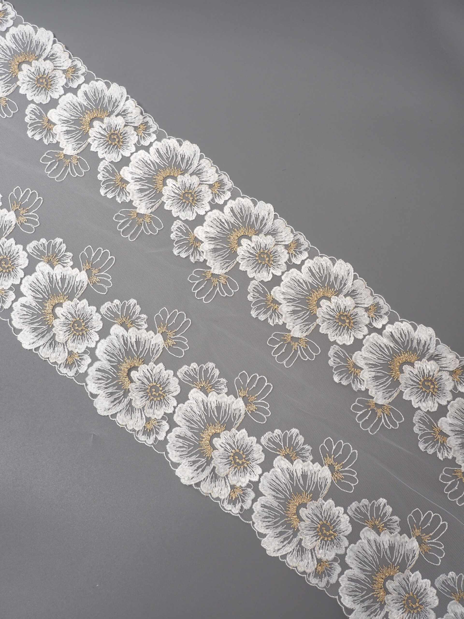 Кружево на сетке неэластичное белого цвета с цветочной вышивкой и узором золотого цвета. Вышивка на сетке белая с золотым люрексом.