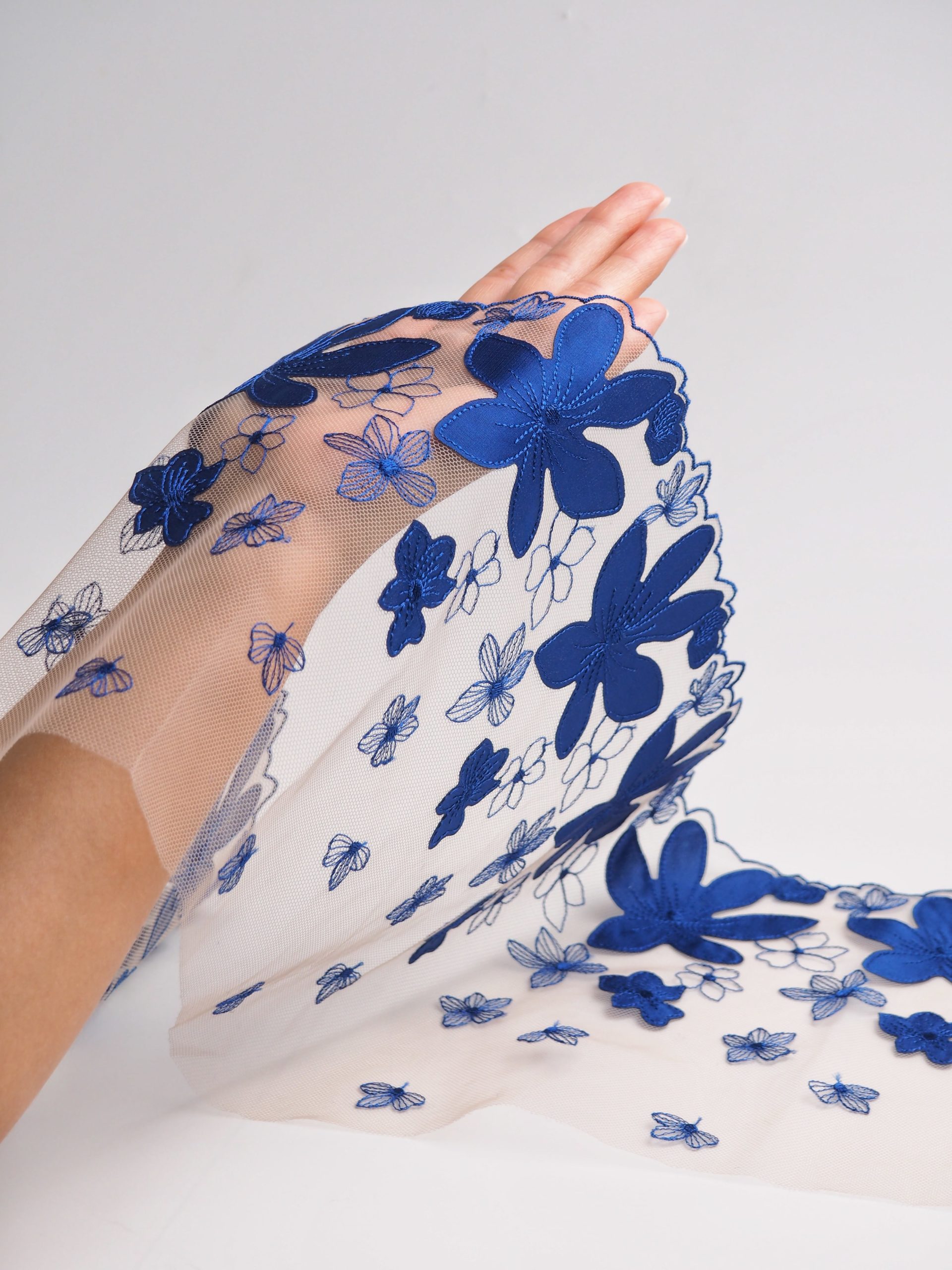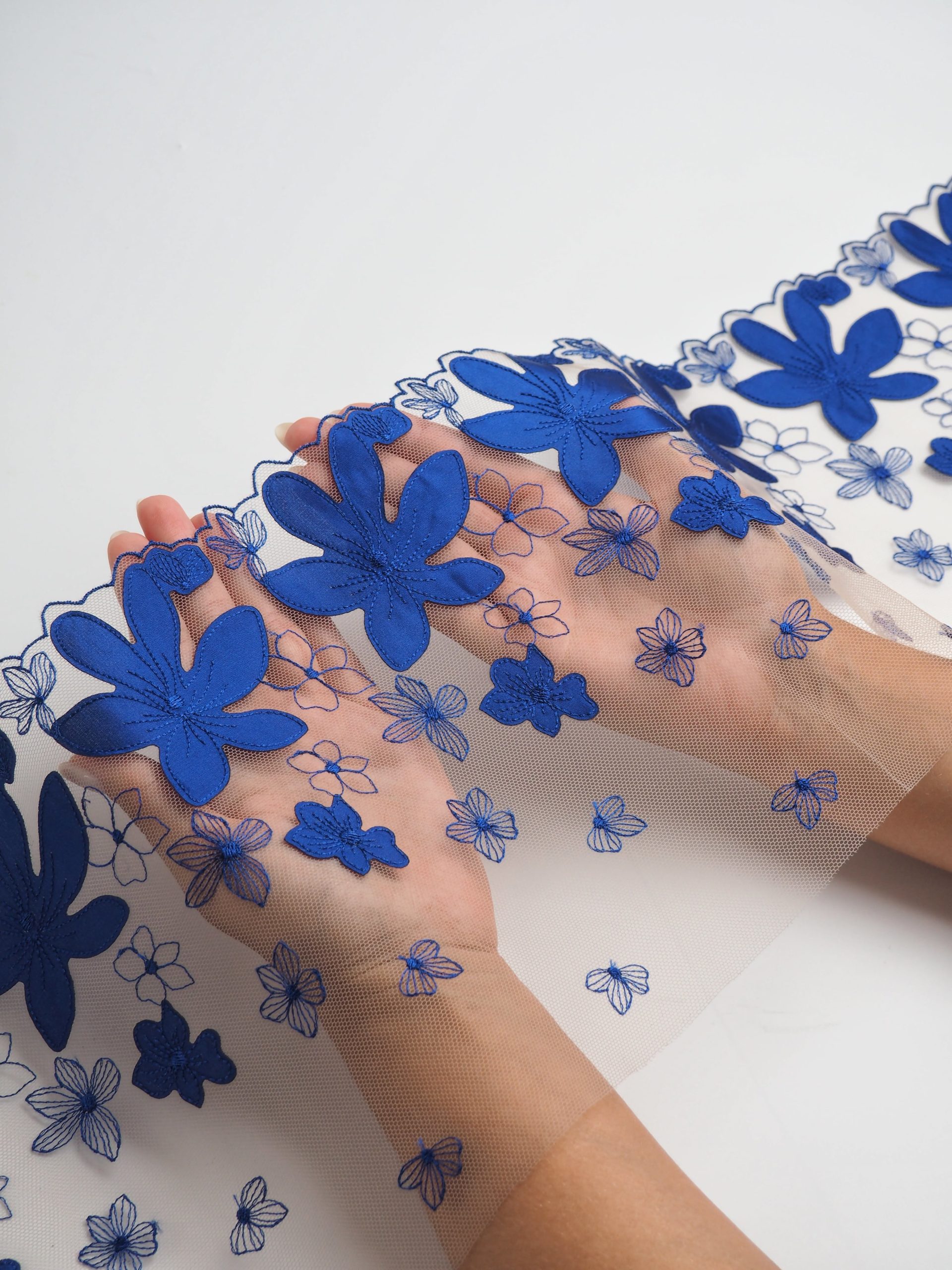 Вышивка на сетке ультрамарин с телесным - удобная и красивая ткань для создания оригинального декора. Готовая основа с кружевными узорами и орнаментами - настоящая помощь рукодельницам. Вышивка на сетке великолепно держит форму, не осыпается по краям, отлично драпируется, отличается высокой прочностью на разрыв, весит очень мало, служит в течение многих лет. Используя кружево на сетке, вы легко создадите эффектное эксклюзивное изделие. Материал считается универсальным. Его можно использовать в пошиве нижнего белья, кофты, юбки, блузки, вечернего и свадебного платья.