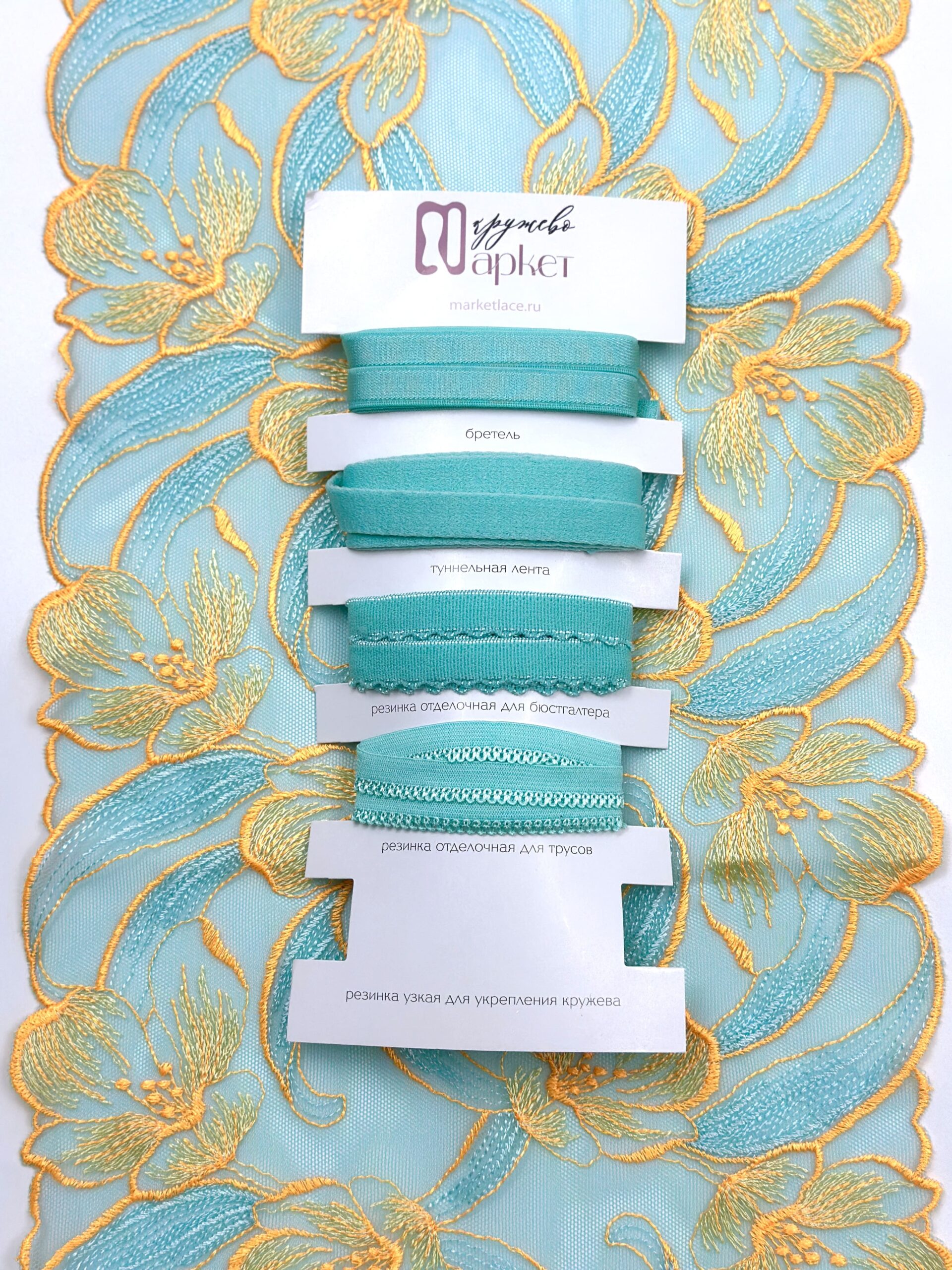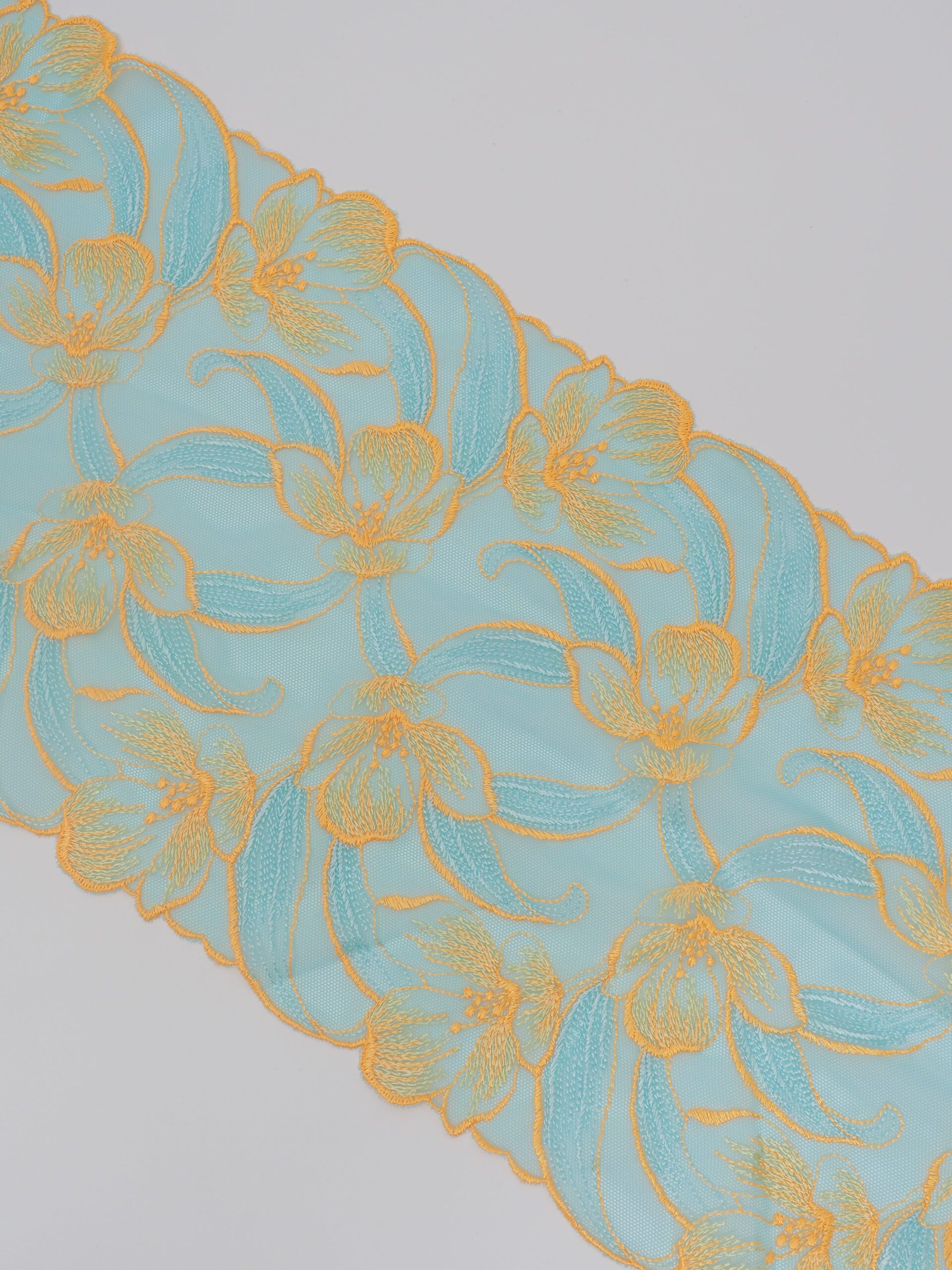 Кружево на сетке эластичное голубого оттенка с желтым цветочным узором. Вышивка желтого насыщенного цвета на сетке яркий тиффани.