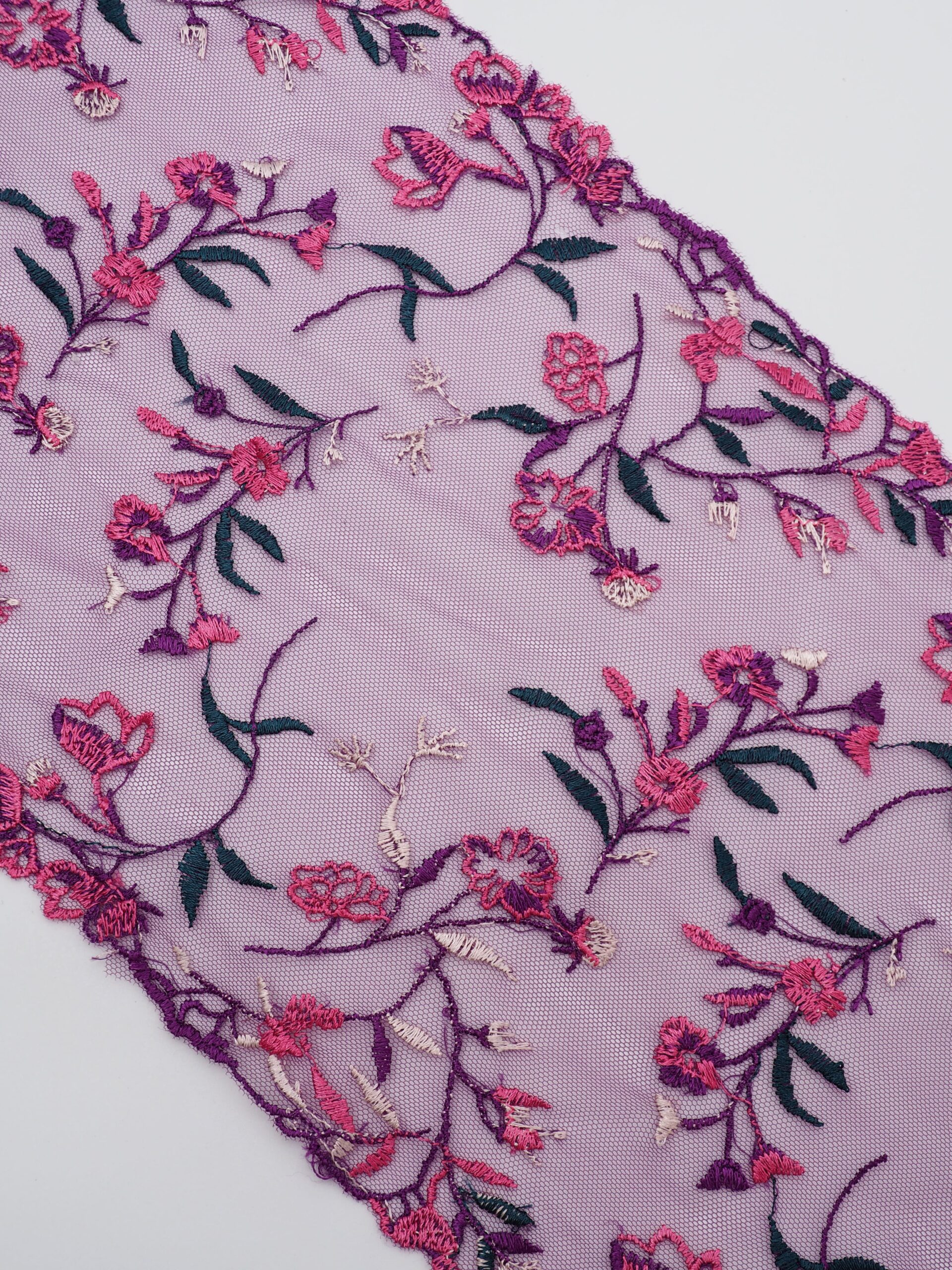 Кружево на сетке неэластичное фиолетового оттенка с разноцветным цветочным рисунком. Вышивка мультиколор на ярко-фиолетовой сетке.