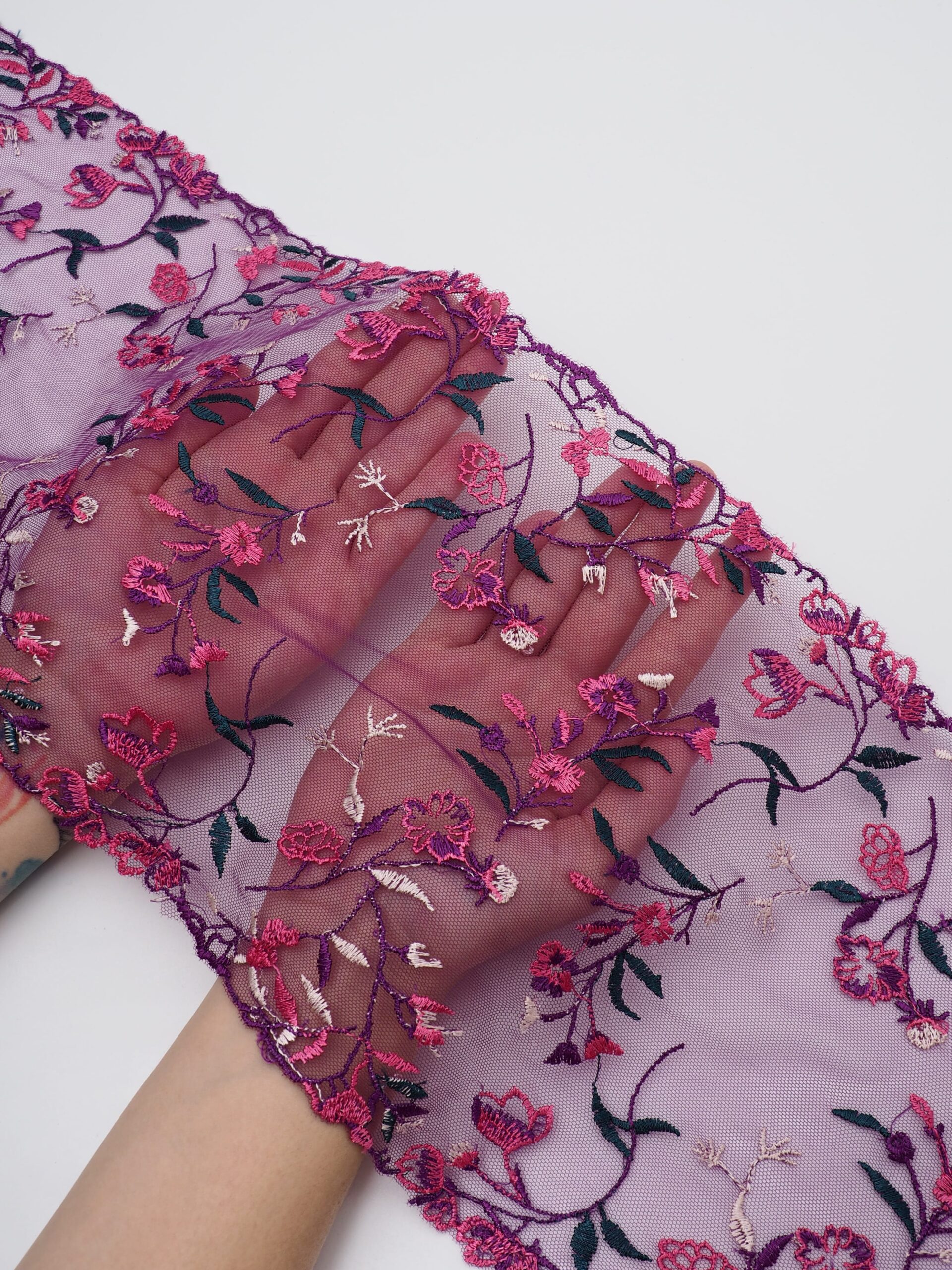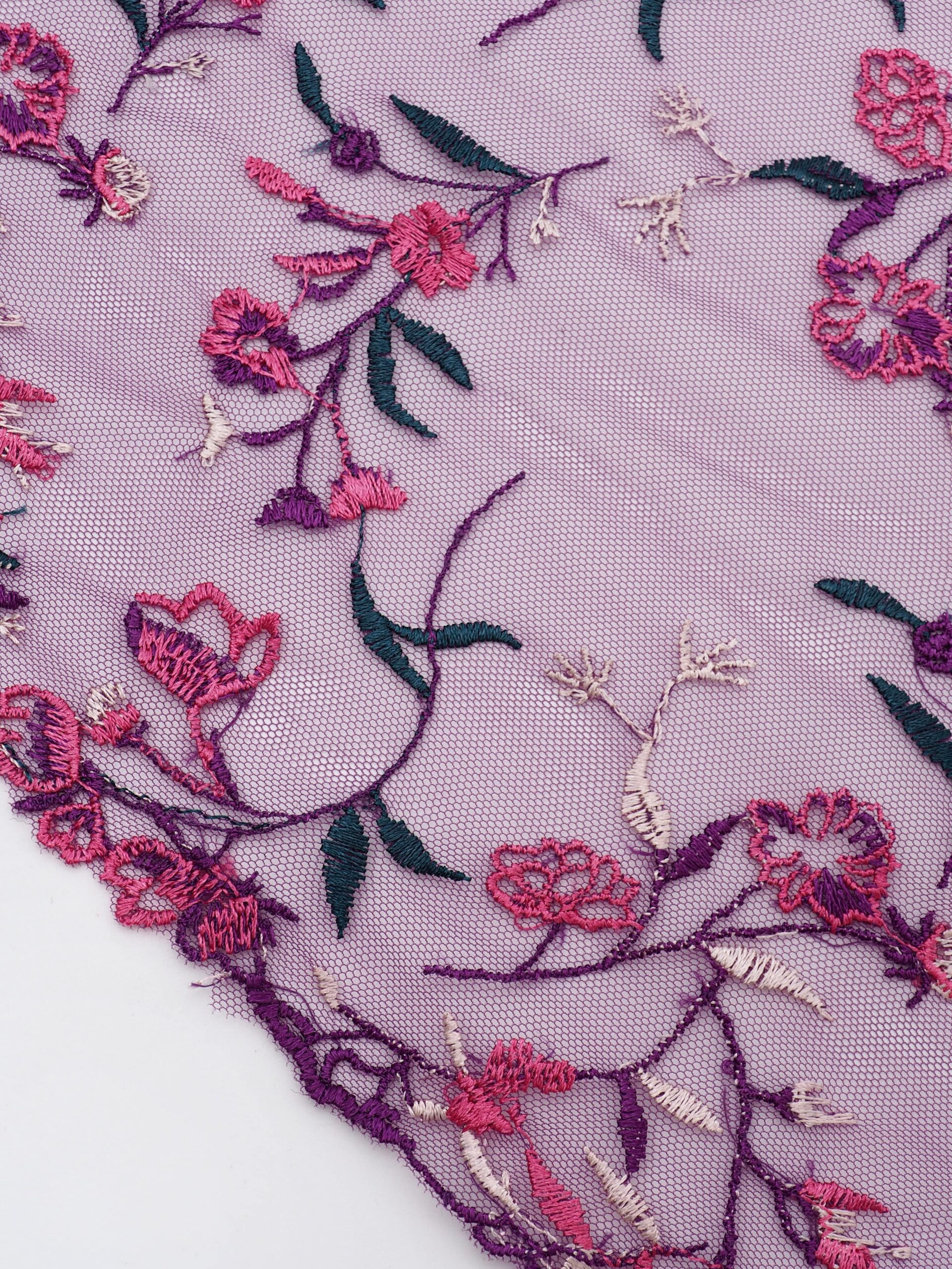 Вышивка на сетке ярко-фиолетовая с мультиколор - удобная и красивая ткань для создания оригинального декора. Готовая основа с кружевными узорами и орнаментами - настоящая помощь рукодельницам. Вышивка на сетке великолепно держит форму, не осыпается по краям, отлично драпируется, отличается высокой прочностью на разрыв, весит очень мало, служит в течение многих лет. Используя кружево на сетке, вы легко создадите эффектное эксклюзивное изделие. Материал считается универсальным. Его можно использовать в пошиве нижнего белья, кофты, юбки, блузки, вечернего и свадебного платья.