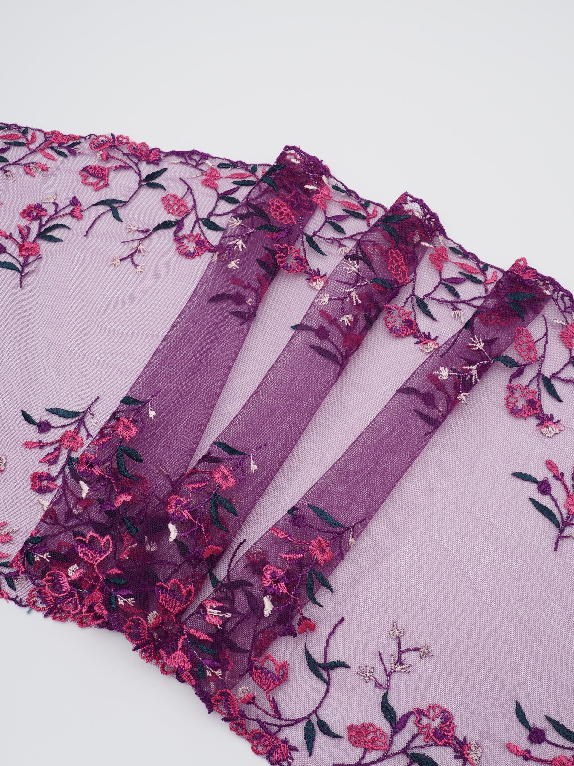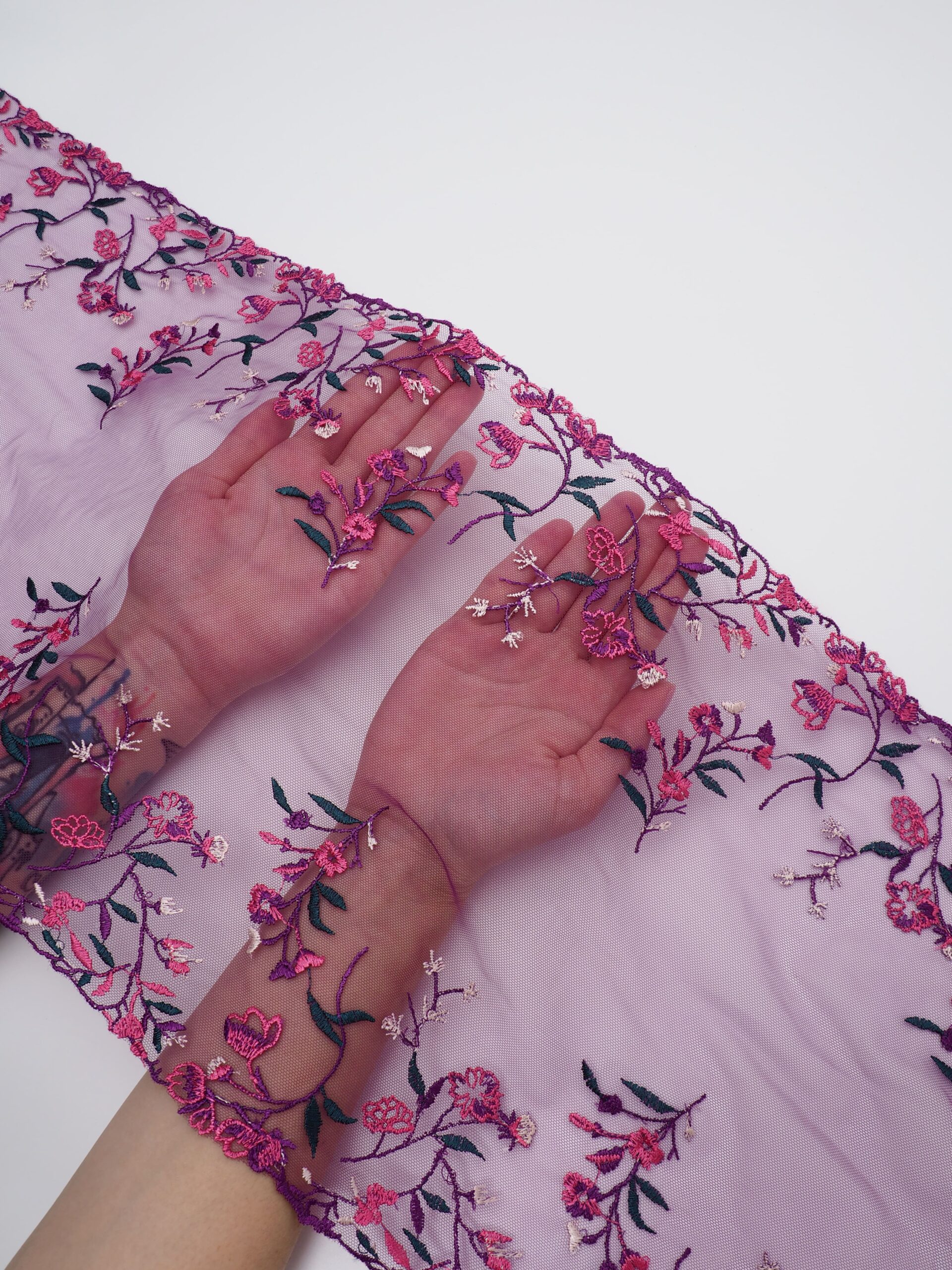 Вышивка на сетке ярко-фиолетовая с мультиколор - удобная и красивая ткань для создания оригинального декора. Готовая основа с кружевными узорами и орнаментами - настоящая помощь рукодельницам. Вышивка на сетке великолепно держит форму, не осыпается по краям, отлично драпируется, отличается высокой прочностью на разрыв, весит очень мало, служит в течение многих лет. Используя кружево на сетке, вы легко создадите эффектное эксклюзивное изделие. Материал считается универсальным. Его можно использовать в пошиве нижнего белья, кофты, юбки, блузки, вечернего и свадебного платья.