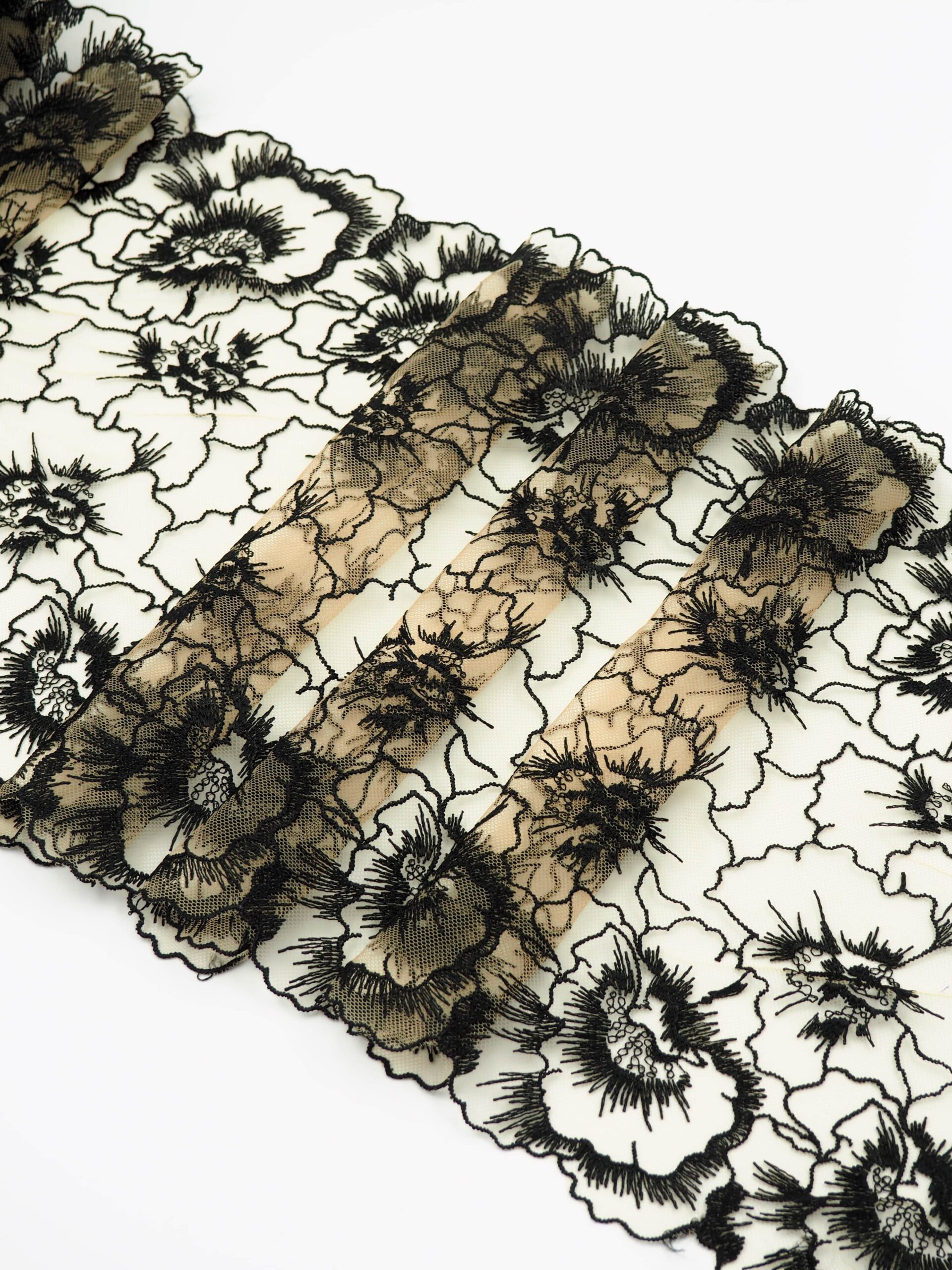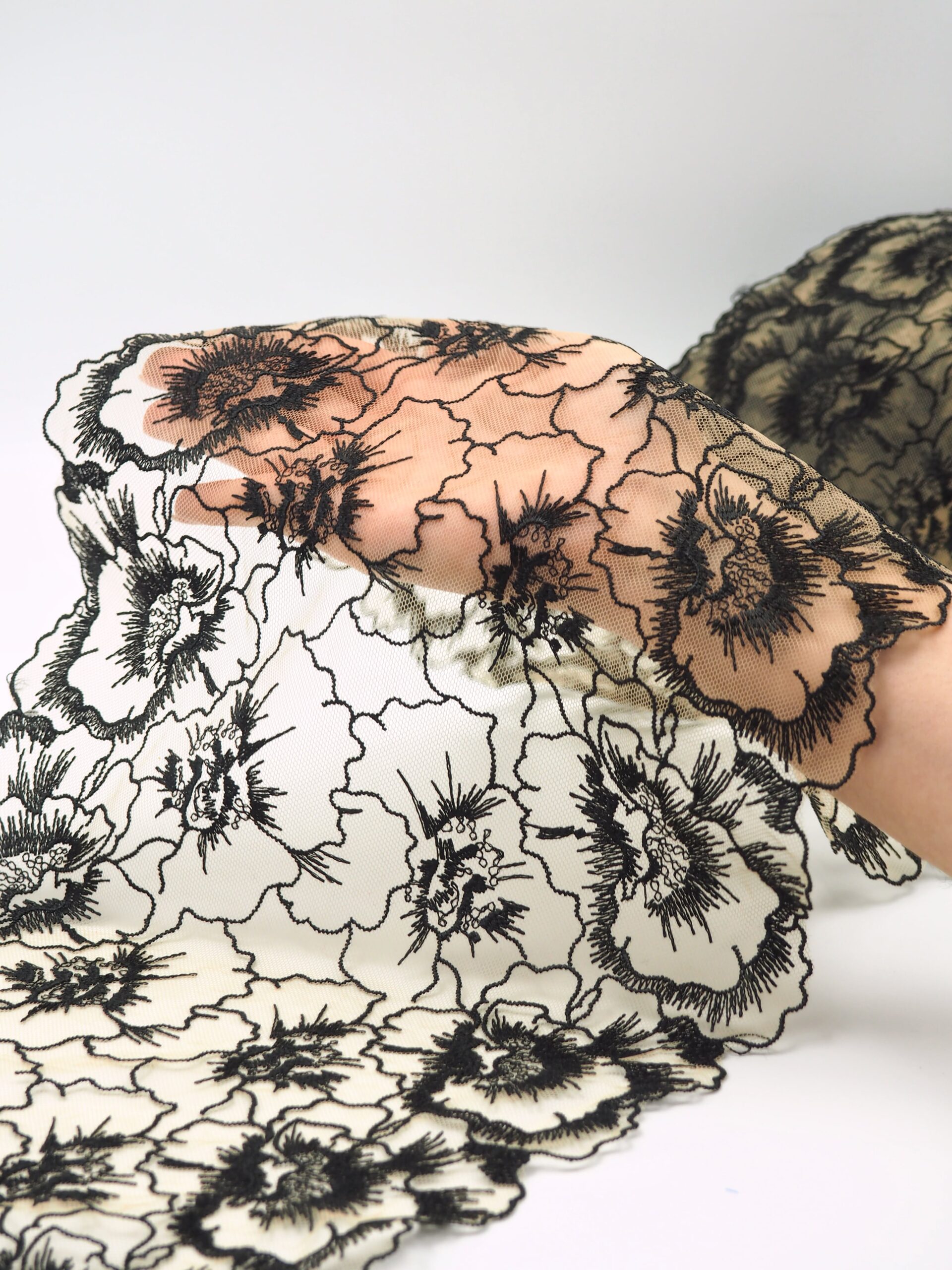 Кружево на сетке неэластичное телесного и черного оттенка с цветочным рисунком. Вышивка на телесной сетке с черными цветами..