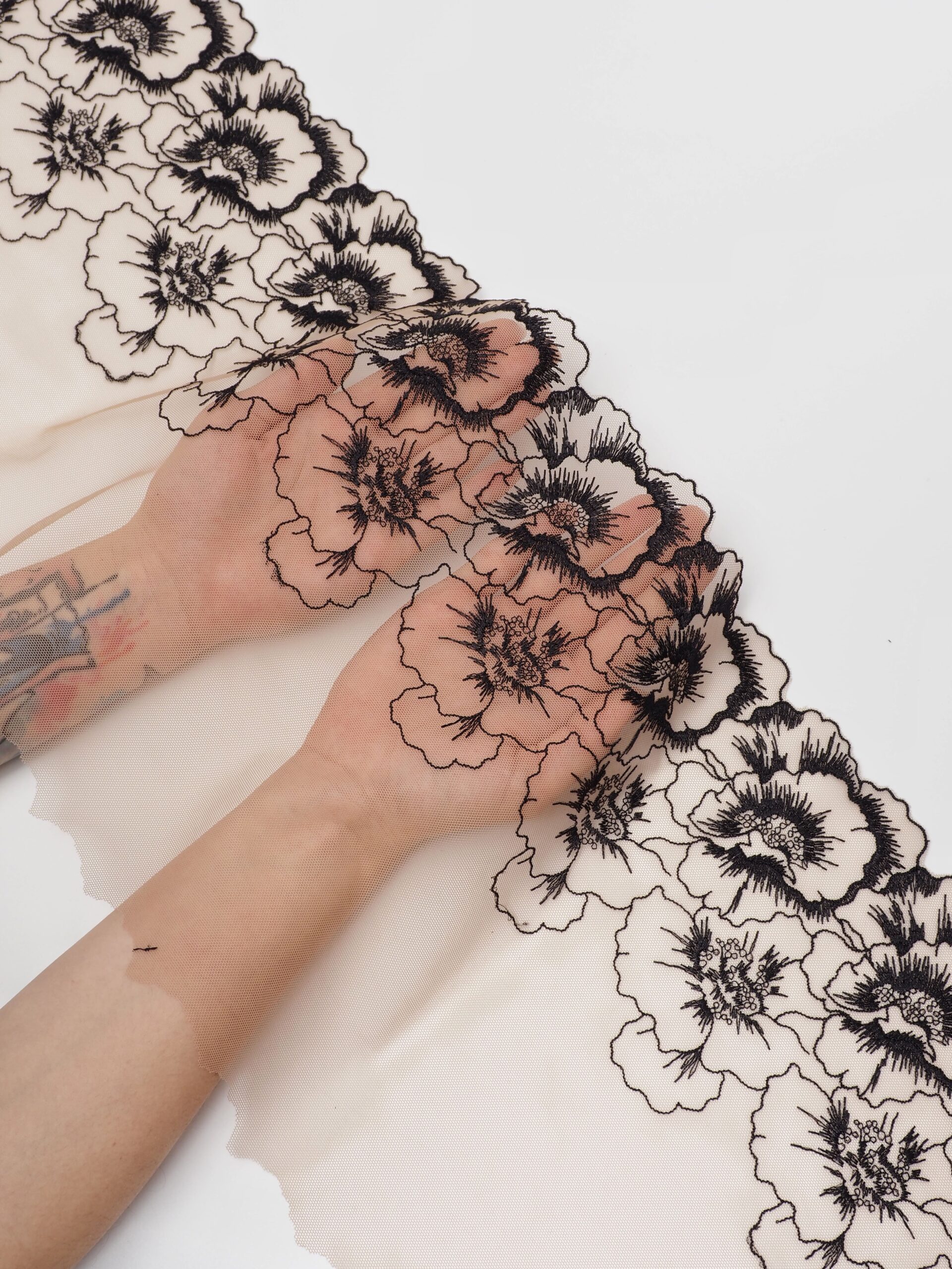 Кружево на сетке бежевое неэластичное с черным цветочным рисунком в левую и правую сторону. Вышивка черного цвета на загорелой телесной сетке.