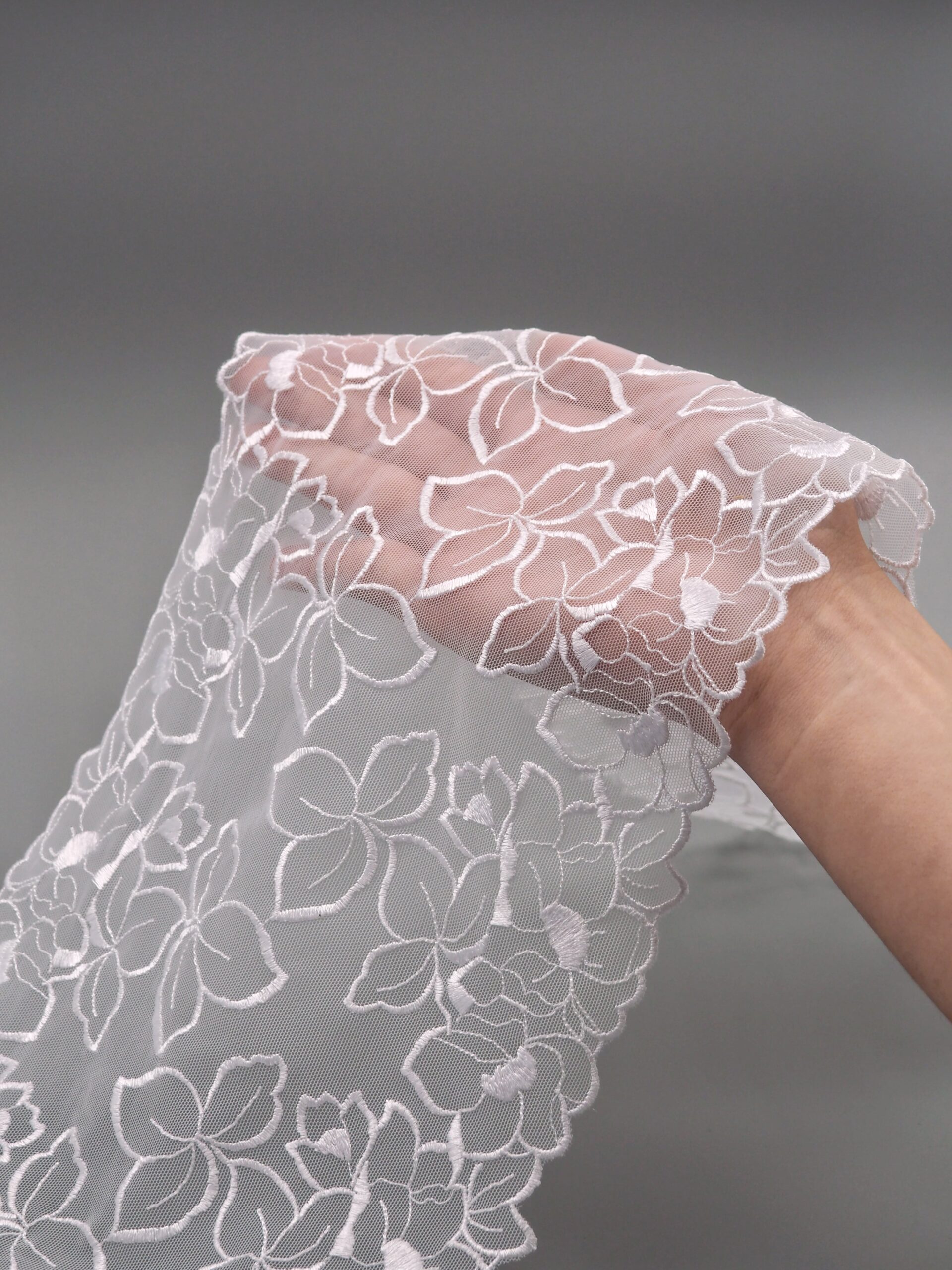 Кружево на сетке эластичное белого оттенка с цветочным рисунком. Вышивка на белой сетке с белыми цветами.