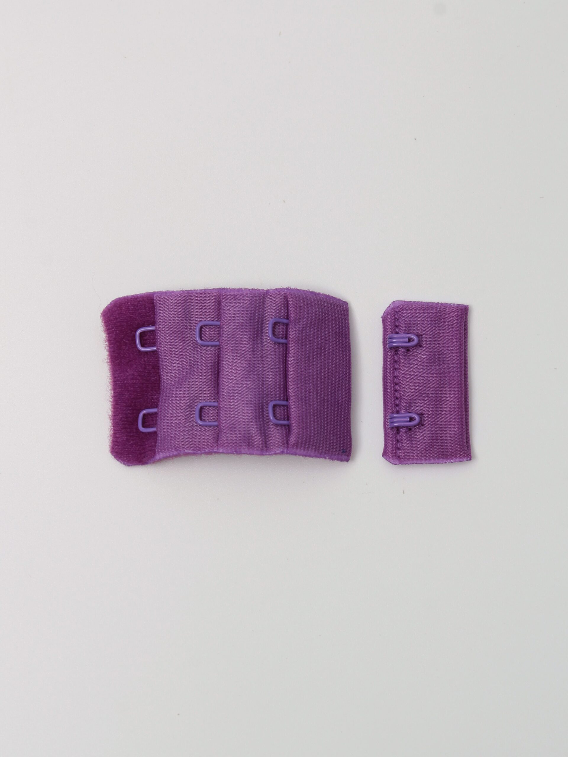 Застежка для бюстгальтера фиолетовая состоит из 2-х частей. Первая часть - это текстильная основа с 2-мя металлическими крючками, вторая - текстильная основа с 2-мя металлическими петлями в 3 ряда. Обратная сторона текстильной части застёжки бархатистая с начёсом.