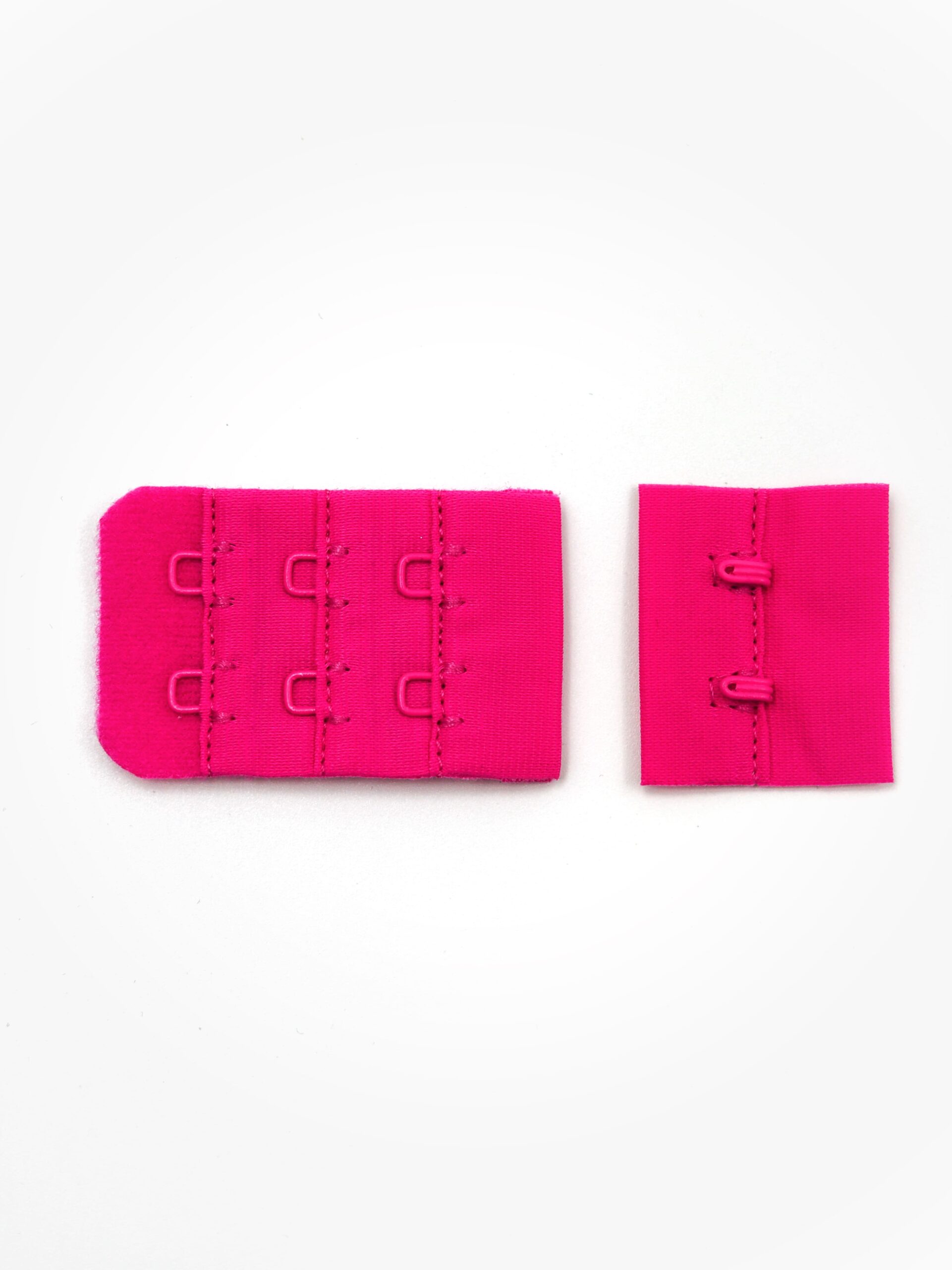 Застежка для бюстгальтера фуксия неоновая состоит из 2-х частей. Первая часть - это текстильная основа с 2-мя металлическими крючками, вторая - текстильная основа с 2-мя металлическими петлями в 3 ряда. Обратная сторона текстильной части застёжки бархатистая с начёсом.