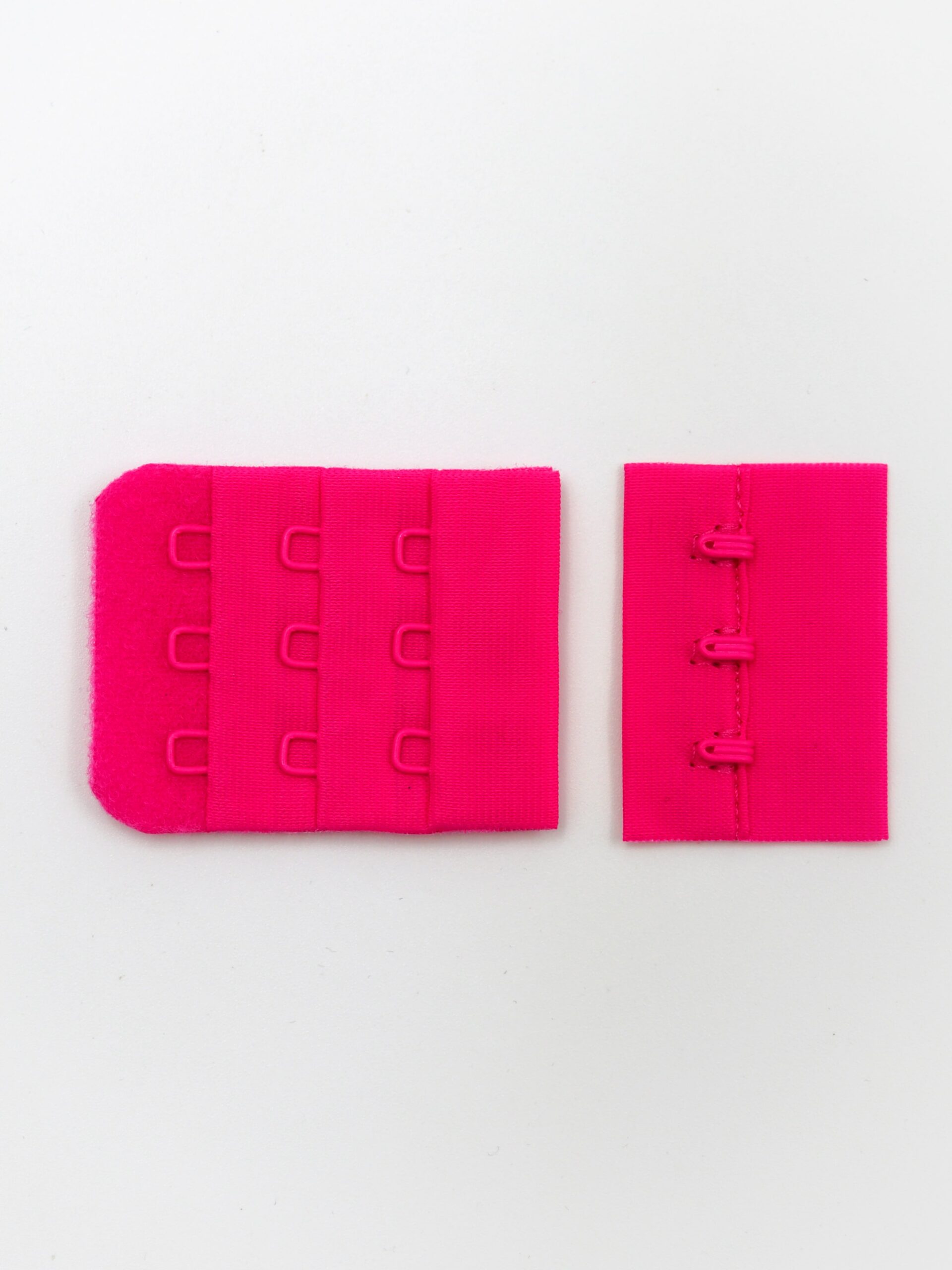 Застежка для бюстгальтера фуксия неоновая состоит из 2-х частей. Первая часть - это текстильная основа с 2-мя металлическими крючками, вторая - текстильная основа с 2-мя металлическими петлями в 3 ряда. Обратная сторона текстильной части застёжки бархатистая с начёсом.