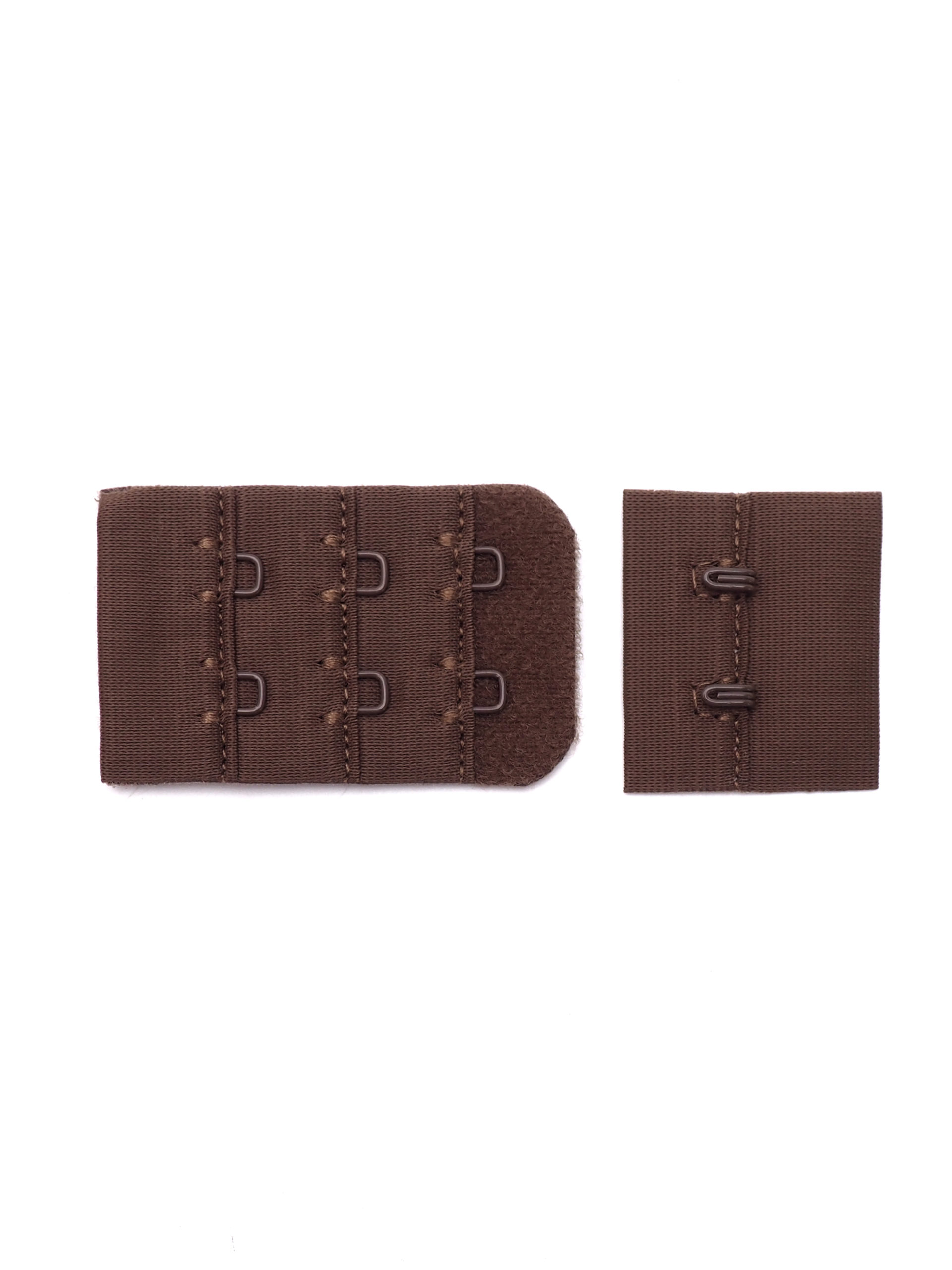 Застежка текстильная для бюстгальтера состоит из 2-х частей. Первая часть - это текстильная основа с 2-мя металлическими крючками, вторая - текстильная основа с 2-мя металлическими петлями в 3 ряда. Обратная сторона текстильной части застёжки бархатистая.