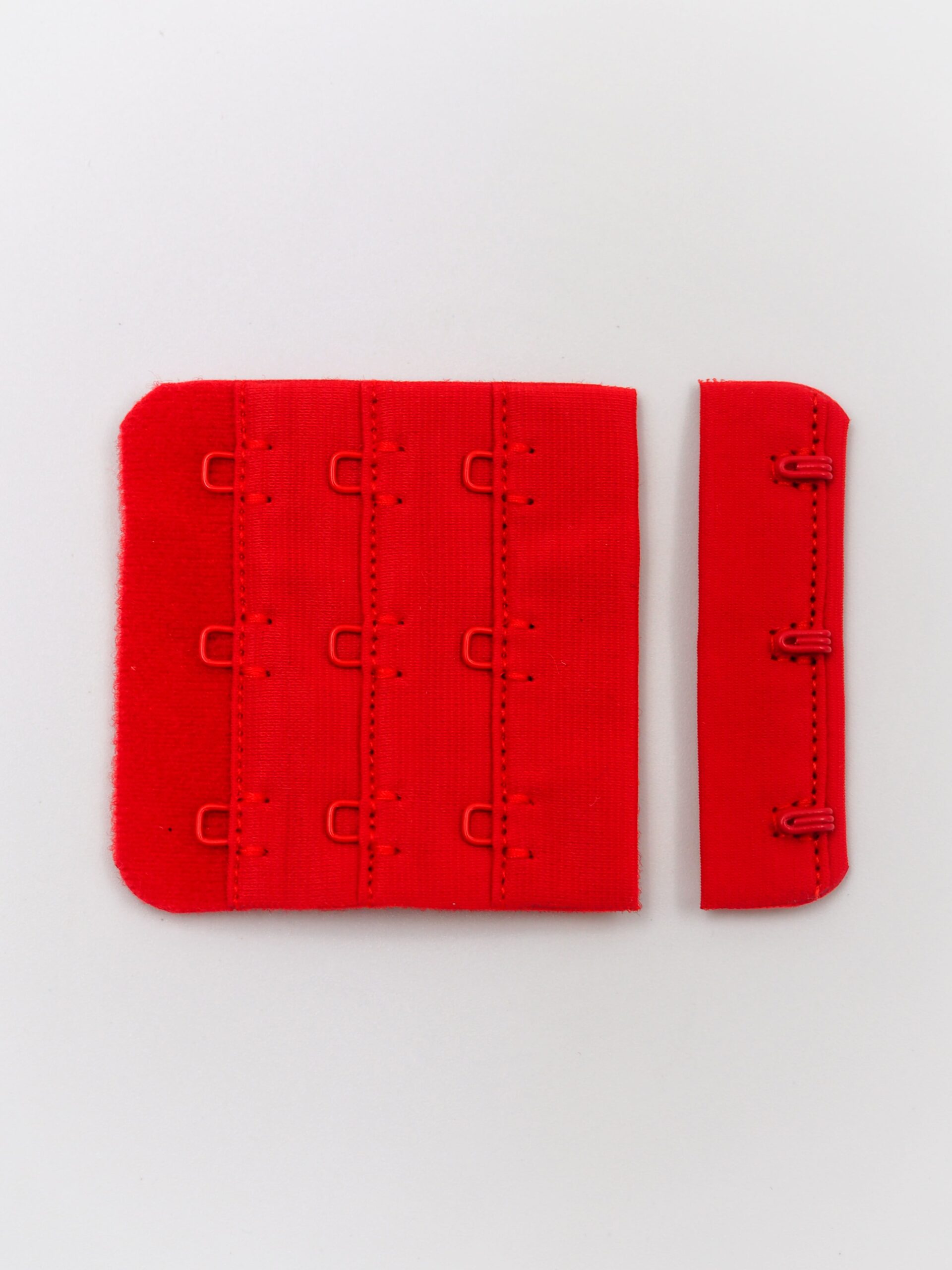 Застежка текстильная для бюстгальтера состоит из 2-х частей. Первая часть - это текстильная основа с 3-мя металлическими крючками, вторая - текстильная основа с 3-мя металлическими петлями в 3 ряда. Обратная сторона текстильной части застёжки бархатистая с начёсом.