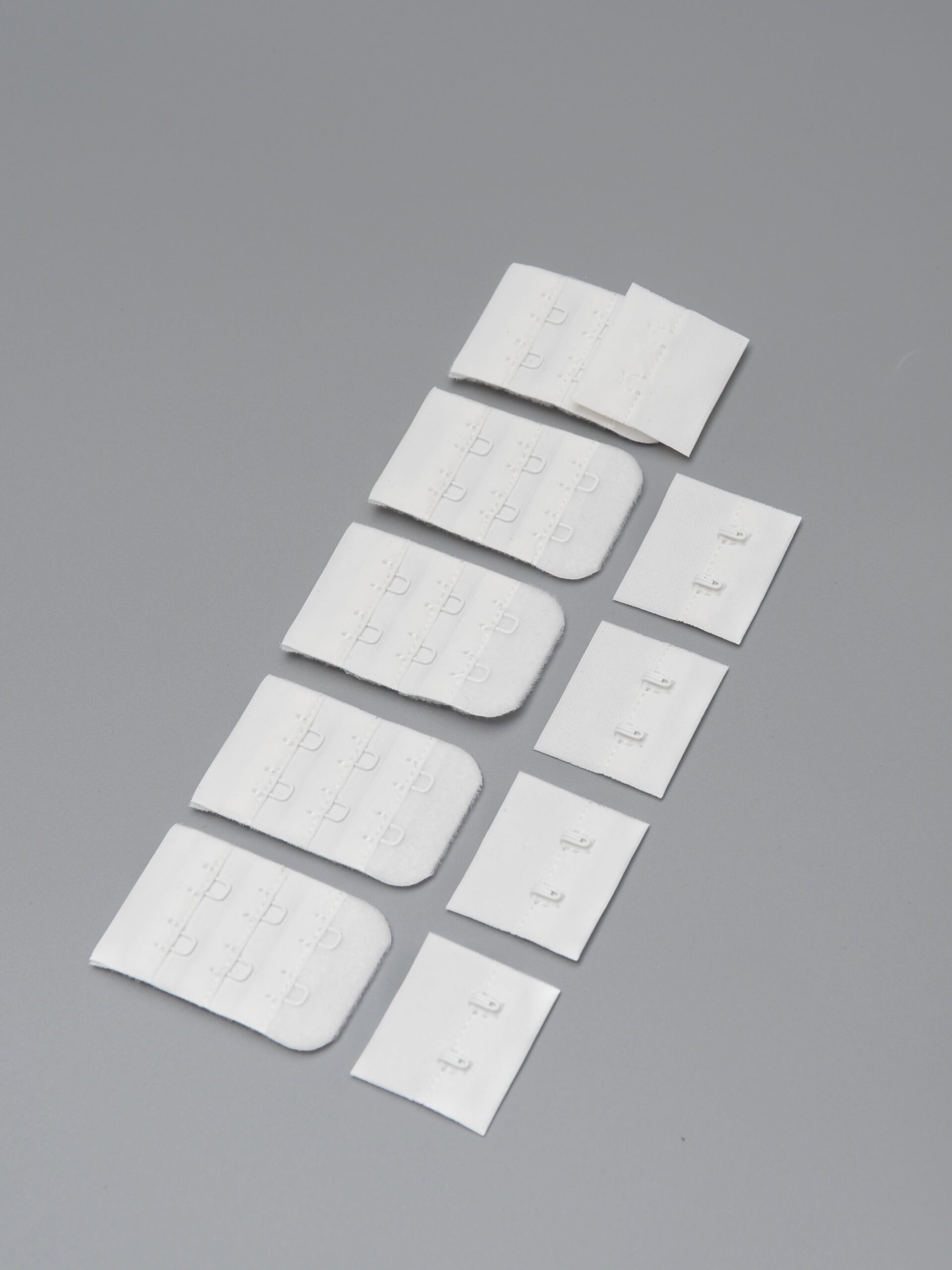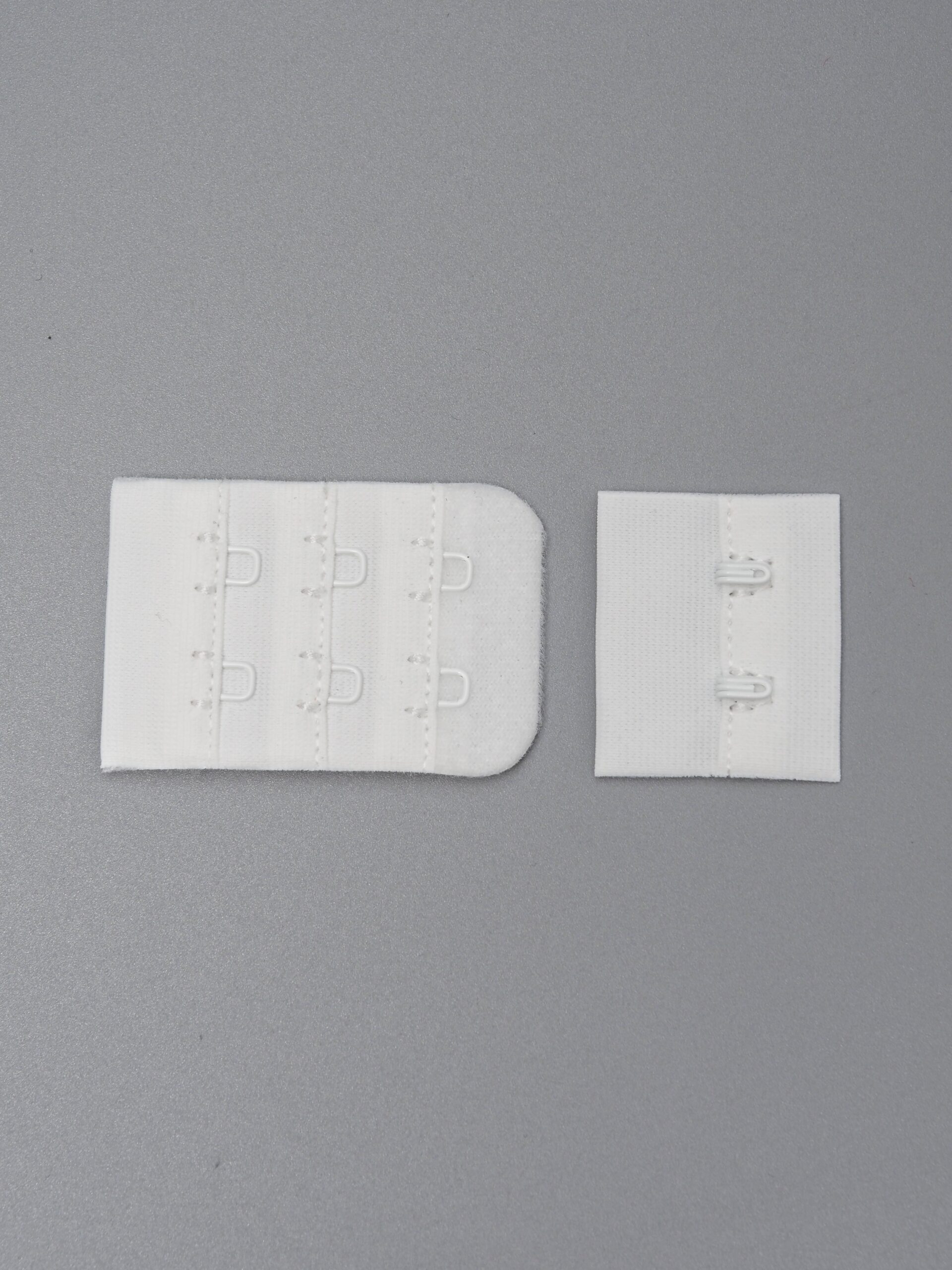 Застежка для бюстгальтера теплая белая состоит из 2-х частей. Первая часть - это текстильная основа с 2-мя металлическими крючками, вторая - текстильная основа с 2-мя металлическими петлями в 3 ряда. Обратная сторона текстильной части застёжки бархатистая с начёсом.
