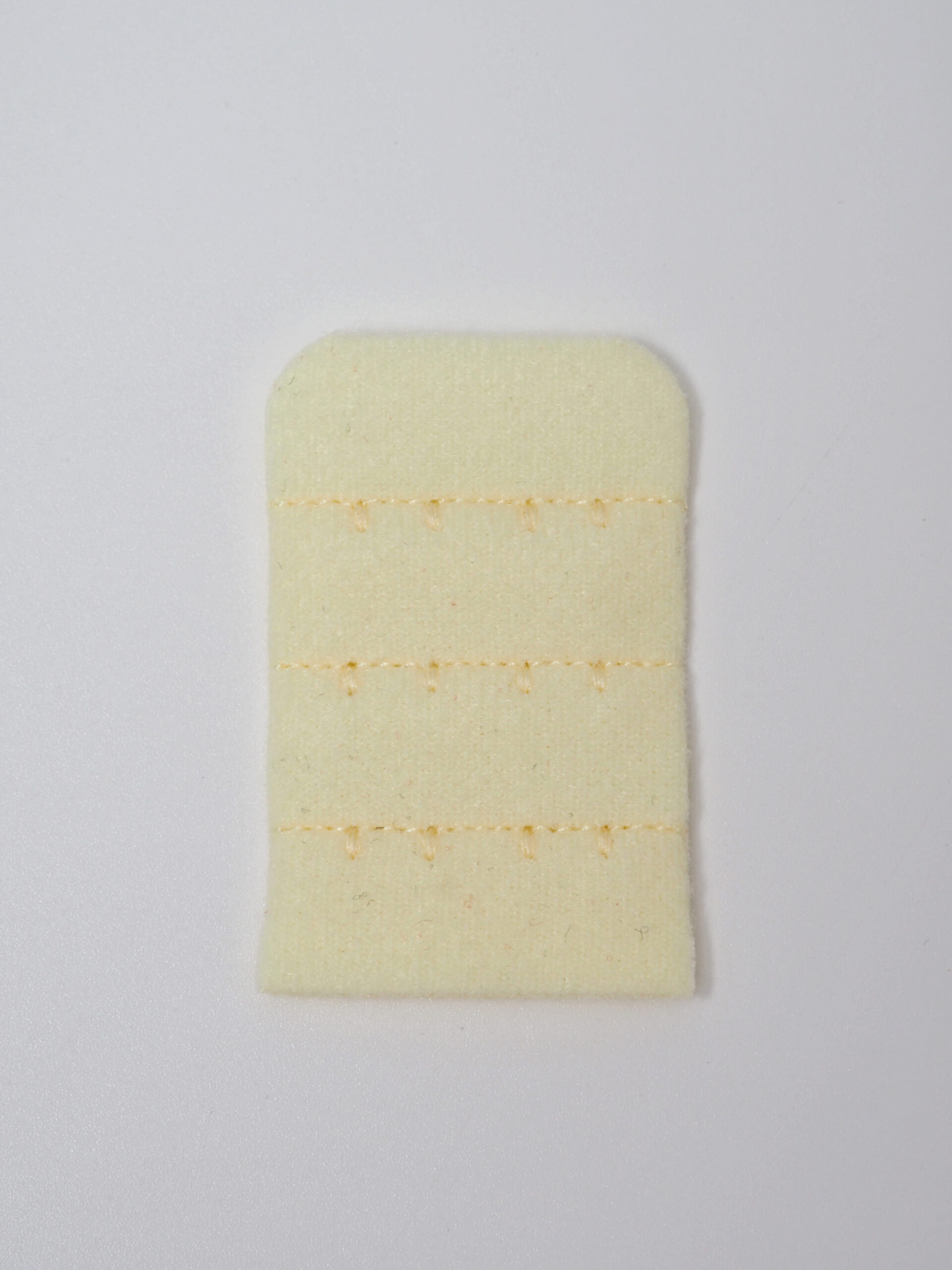 Застежка текстильная для бюстгальтера сливочное масло состоит из 2-х частей. Первая часть - это текстильная основа с 2-мя металлическими крючками, вторая - текстильная основа с 2-мя металлическими петлями в 3 ряда. Обратная сторона текстильной части застёжки бархатистая с начёсом.